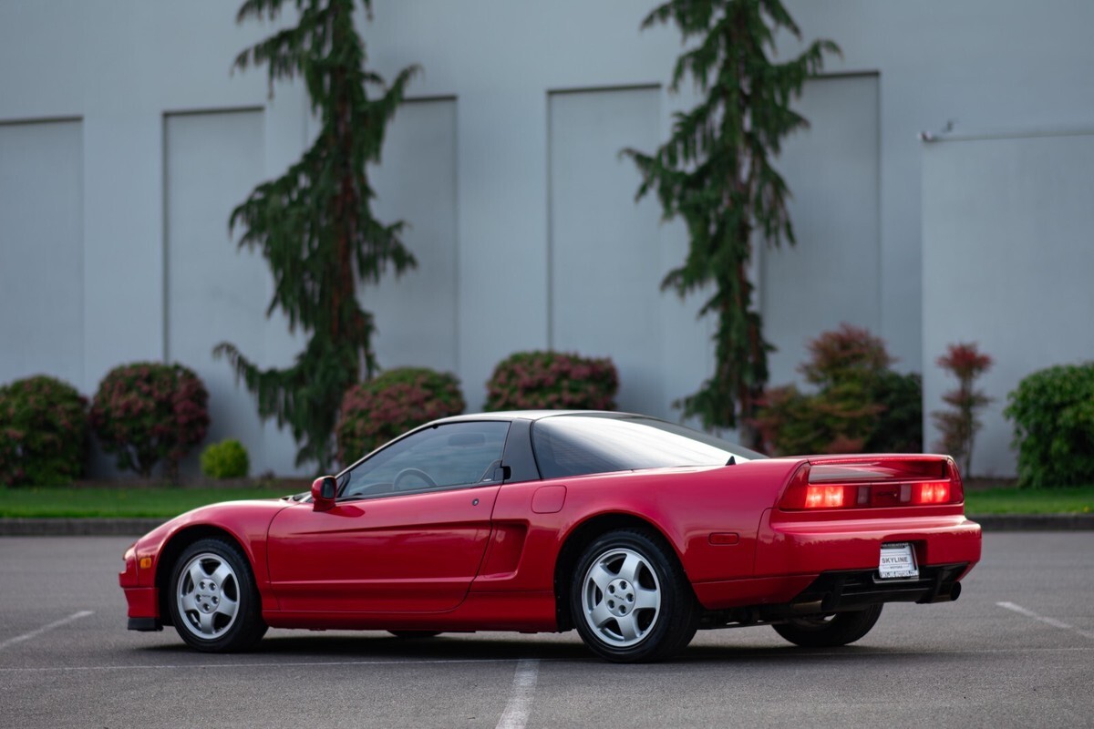 This 1993 Acura NSX has 36k original miles and was optioned from the factory with a five-speed manual transmission, which is paired with a 3.0-liter VTEC V6. Finished in Formula Red over black leather upholstery, the car is equipped withstaggered-diameter 15″ and 16″ forged OEM wheels, a limited-slip differential, a black roof panel, pop-up headlights, power-adjustable seats, automatic climate control, cruise control, a CD changer, and a Bose sound system.The leather-wrapped steering wheel frames a tachometer with an 8k-rpm redline, a 188-mph speedometer, and gauges for coolant temperature, oil pressure, voltage, and fuel level. The six-digit odometer shows 36,276 miles.The mid-mounted 3.0-liter V6 features VTEC variable valve timing and was factory rated at 270 horsepower and 210 lb-ft of torque.