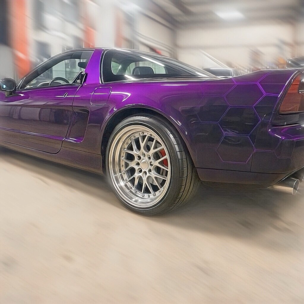 The exterior has been completely disassembled and professionally refinished by Jeff Doane at Paint Pro’s, a respected family-owned business in Jacksonville, Florida. It now features a stunning House of Kolor Candy Purple two-tone finish, accented by a black honeycomb airbrushed design. Additional exterior modifications include a rear spoiler, antenna delete plug, third brake light strobe module, and Route KS carbon-fiber B-pillar covers. The car was originally finished in Berlina Black (NH-547).