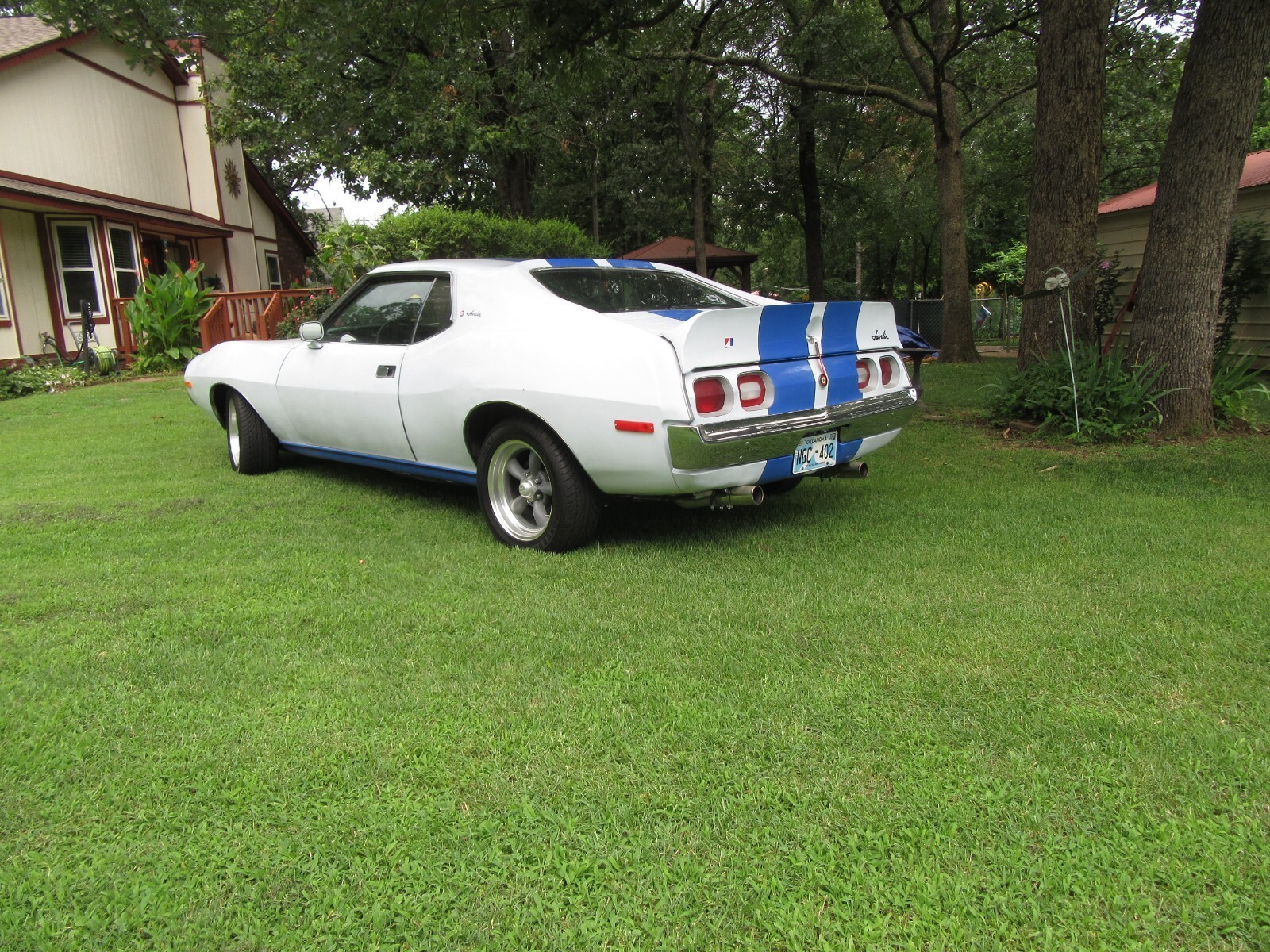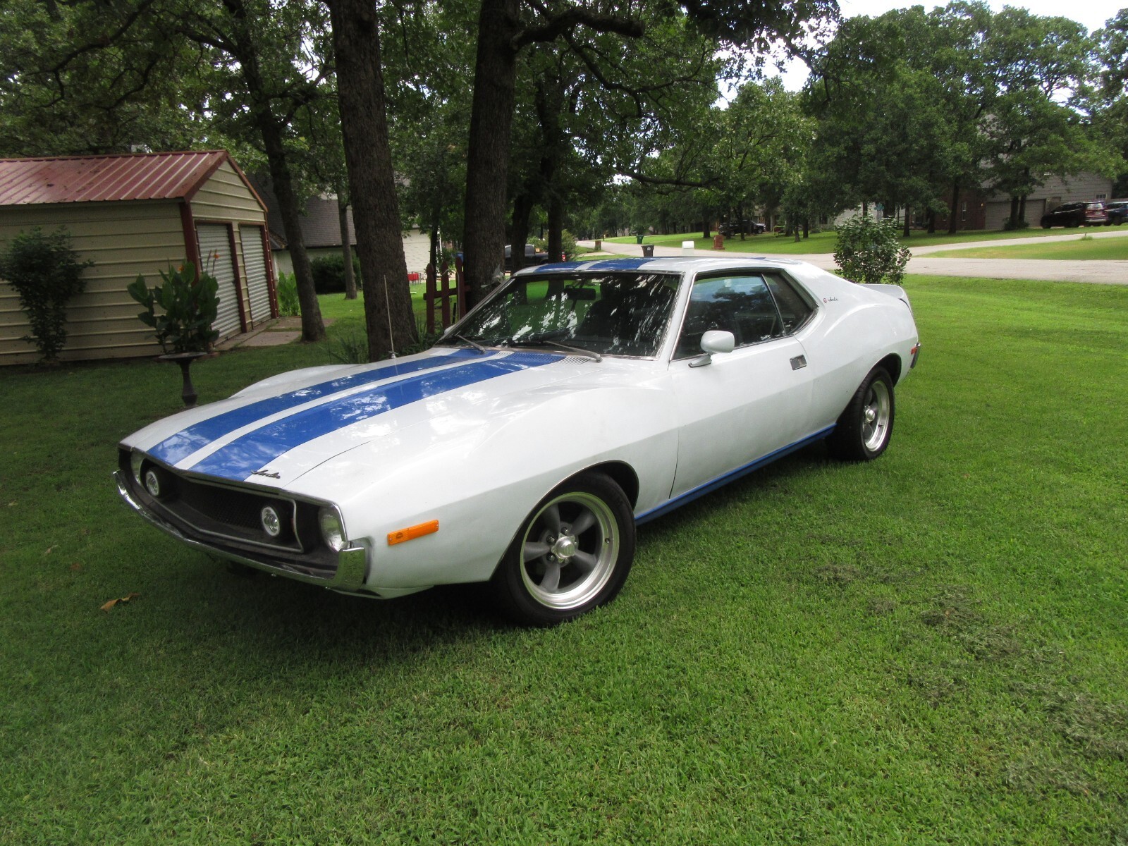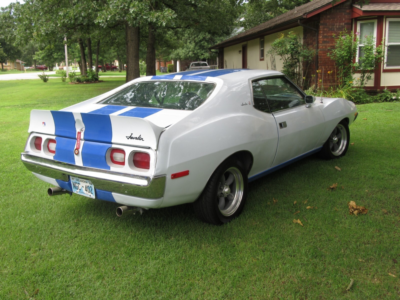 recently completed 74 AMC Javelin project in attractive paint scheme. California car, 1 spot of rust under trunk gasket about 3/4" fixed with metal. new door, hood, and trunk gaskets, AMX spoiler, re chromed bumpers new 16" tires on American Racing 5 spoke wheels.. New leather seats, carpet and good headliner. Rebuilt AMC 360 with AFB style carb, Edlebrock intake, Patriot ceramic headers, New AC compressor, lines, condenser, and drier, and refurbished evaporator. Rebuilt steering box and PS pump, new lines. New suspension, including control arms, strut rods, bushings, and ball joints, and springs. Almost all parts to return to stock included, including luggage rack trunk lid and rack.