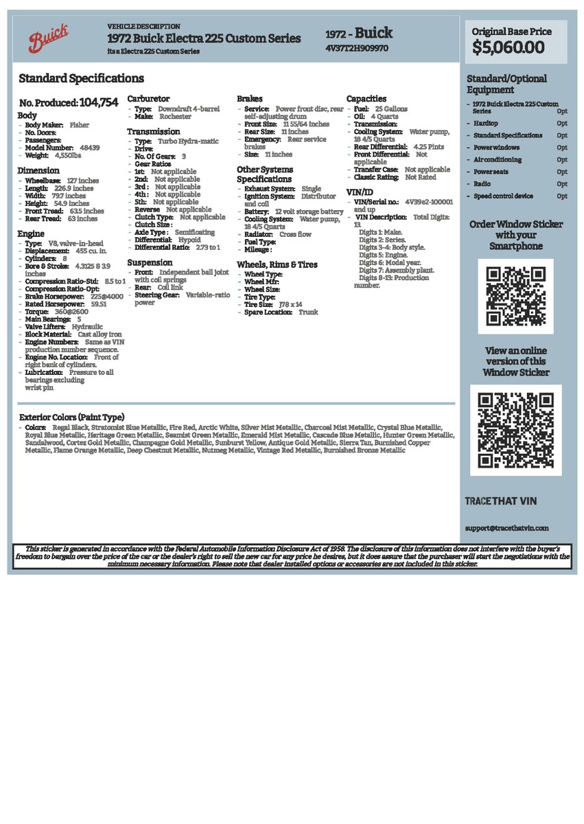 The 1972 Buick Electra is a classic sedan with a sleek green exterior color. This two-door vehicle has a mileage of 47,248 miles and seats two passengers comfortably. With Lien sale paperwork, this model is a great addition to any collector's inventory. The Buick Electra boasts a timeless design and is sure to turn heads on the open road.