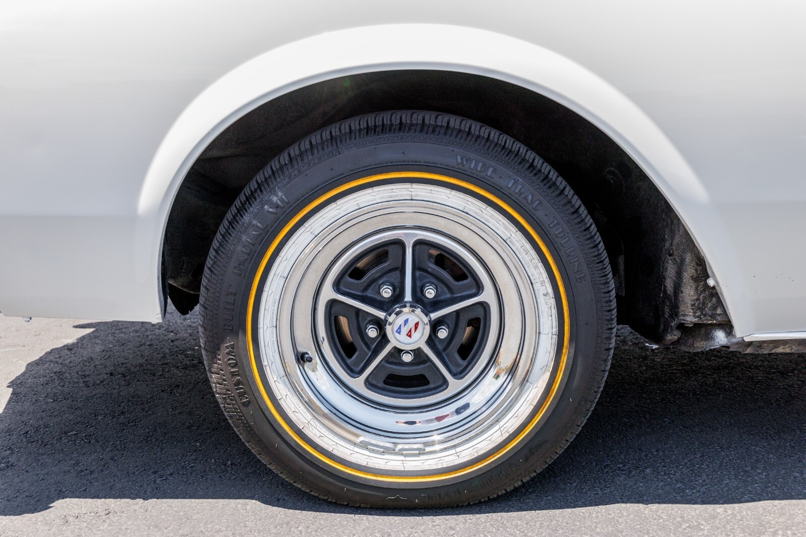 The 15″ rally-style wheels are mounted with 215/70 Vogue Tyre Custom Built Radial VIII gold and whitewall tires. The car has power steering and braking is handled by power-assisted front discs and rear drums.