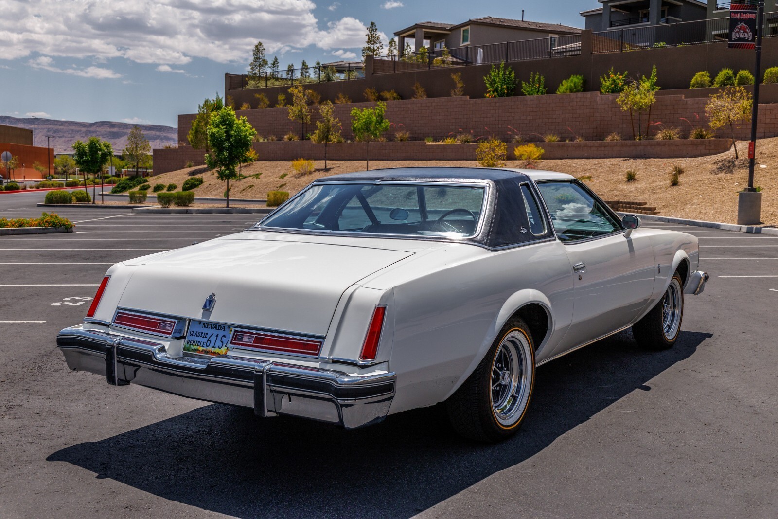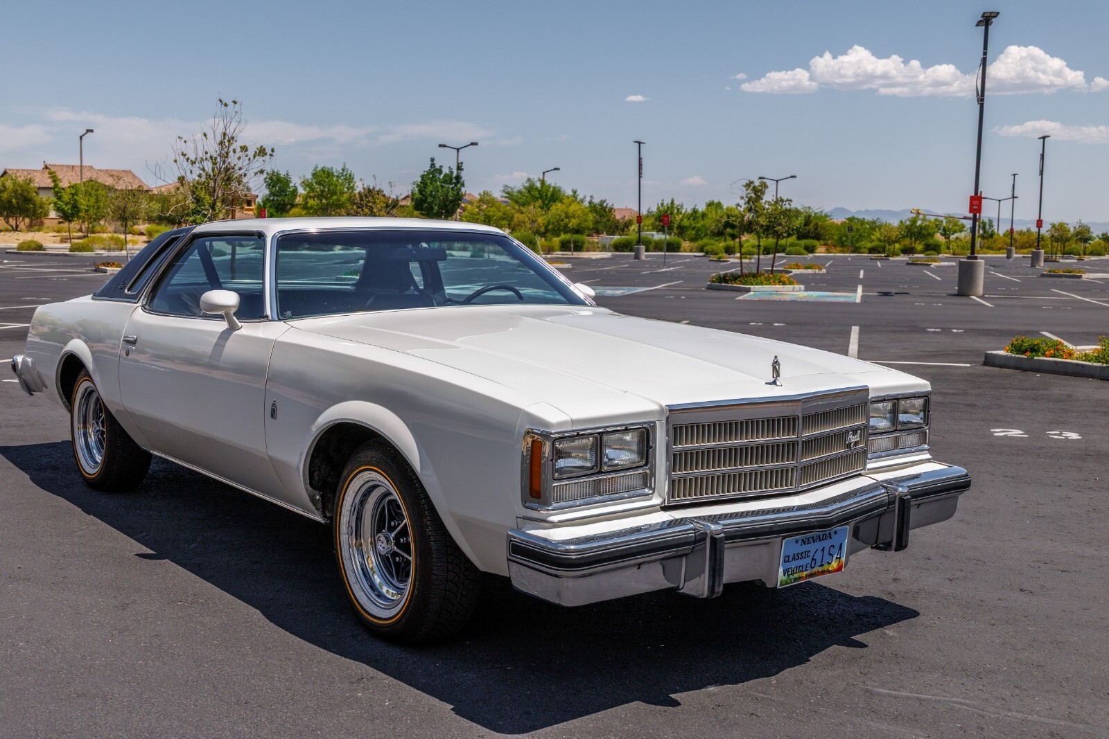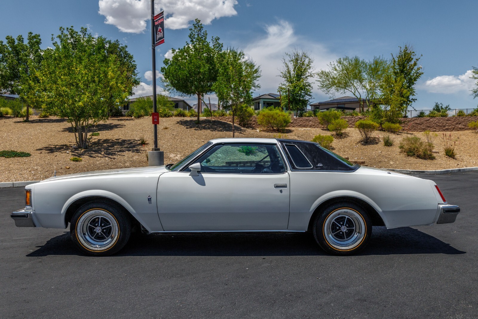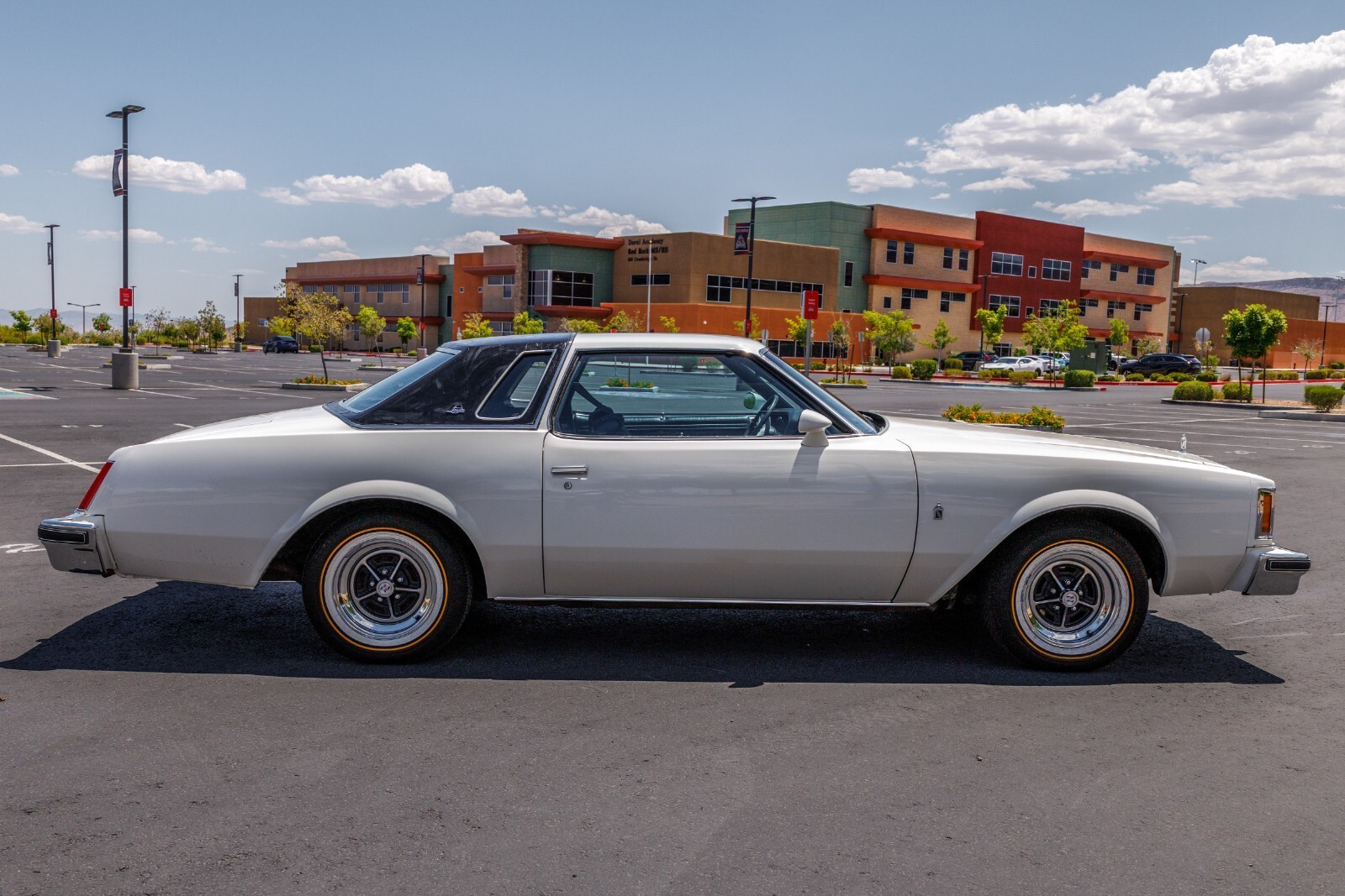 _____________________________________________________This 1977 Buick Regal is finished in white over black patterned cloth upholstery, and it is powered by a 350ci V8 mated to a three-speed automatic transmission. Equipment includes a black vinyl landau roof, power steering, power-assisted front disc brakes, 15″ rally-style wheels, air conditioning, power windows and locks, an analog clock, and a factory AM/FM radio.