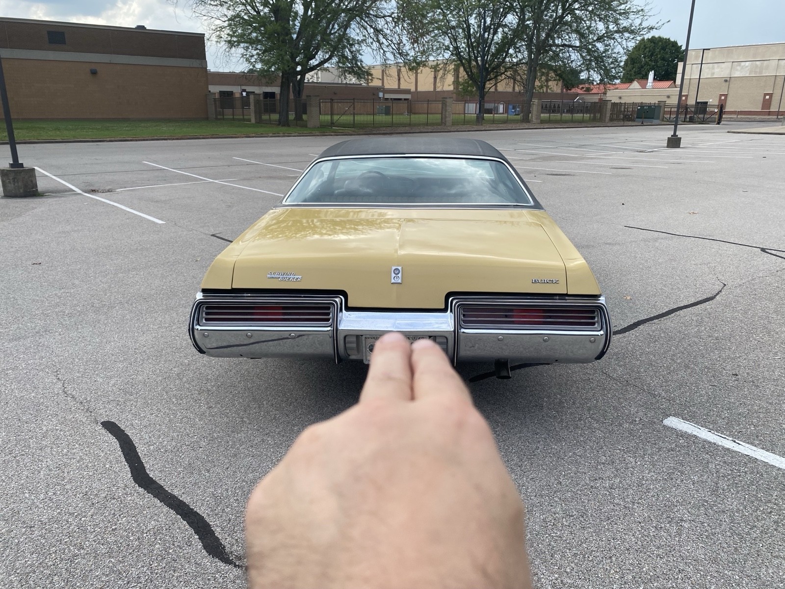 350-4bbl Buick, automati, tilt, cruise, A/C. Absolutely beautiful interior that looks brand new, except for slight blemishes on front bench seat. Factory floor mats. Glass is perfect. Exterior is very nice and very solid overall but does have some cosmetic blemishes from elderly drivers. Trunk still has the original jack and spare tire, and vintage trunk liner. Car runs and drives beautifully. Everything works except the cruise control. The vacuum diaphragm has a tear in it otherwise it would work too. AC blows cold, AM radio works, lights and gauges work except the fuel gauge is on full all the time. New water pump, newer plugs and wires, four like new white wall tires on new chrome wheels. New front and back shocks. New back brakes. NIB car cover.