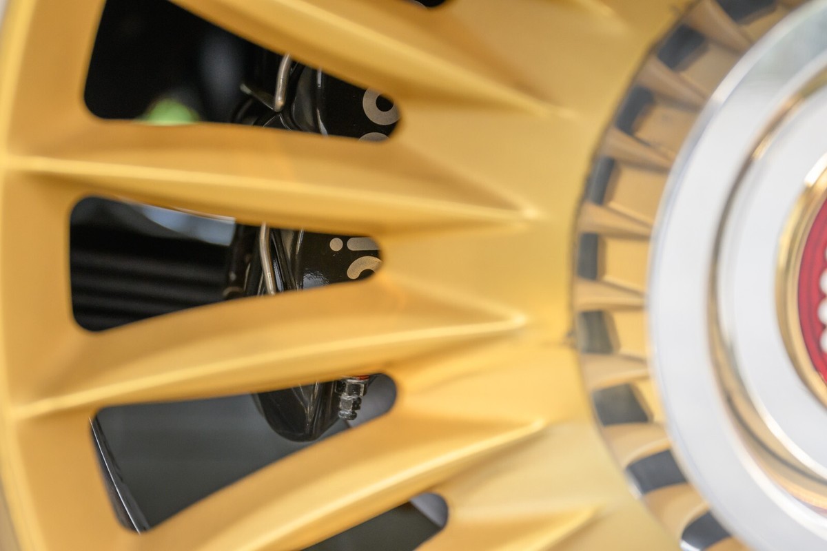 The multi-spoke wheels were fabricated by Colorado Custom, modeled after the factory Kalsey Hayes wheels but in an 18” size instead of the factory 15” wheels. They were finished in matte gold with a polished lip, and finished with Cadillac emblem center caps. The wheel sizes are 18×9″ front and 18×11” back. These beautiful wheels were