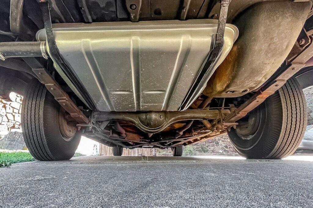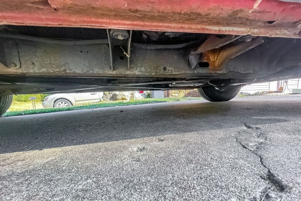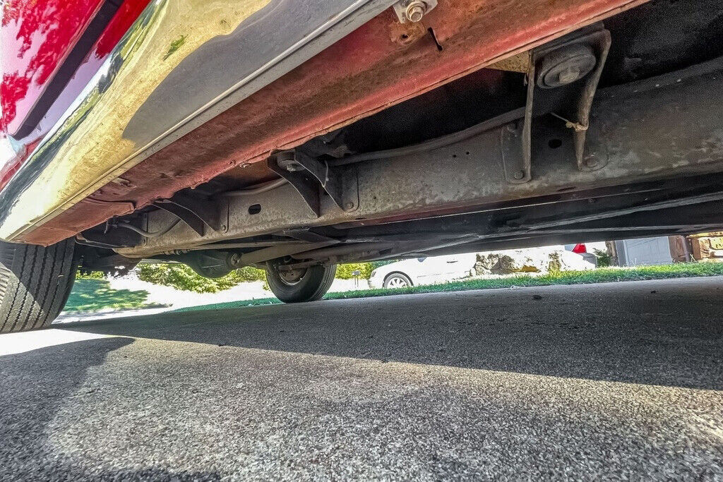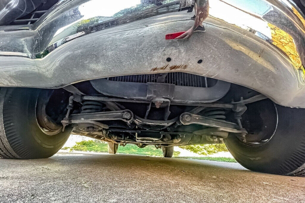 Photos of the undercarriage appear to show minimal surface corrosion on the frame and component parts. The power steering is described by the seller as having a little play but “not bad,” and no leaks are reported. No suspension service has been required, according to the seller, although he also notes that the rear leaf springs have been replaced. The bushing and shocks are “very good,” and the heavy drum brakes are “good.” This Coupe de Ville rides on a handsome set of 15” aftermarket wire wheels, which display no visible damage. The 8.20-15 BFGoodrich Silvertown wide-whitewall tires are two years old, per the seller, and are period correct as tubeless tires were first offered as standard equipment by Cadillac in 1955.