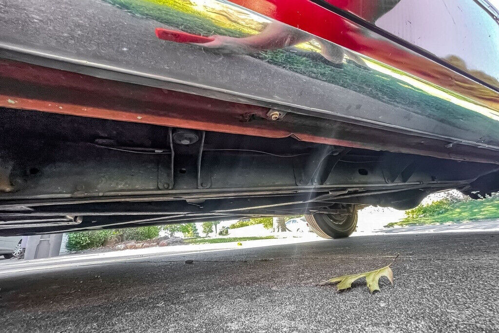 The exterior finish of Mandan Red with a White top is described as “very good,” and appears to display no evidence of being refinished. The car presents well, with straight panels and even panel gaps (apart from the hood), as seen in the photos provided. All trim and lights appear complete, and all lights are said to be working. Small blemishes, chips, and scrapes can also be seen in the photos, altogether not unexpected for the age of the finish. The seller notes that the right front window is cracked, and delaminating edges can be seen in the photos of the left rear window. All other glass is described as “good.” No issues are reported with the seals and no leaks are mentioned. The seller also states that the body of this Coupe de Ville, sold new in Arkansas, remains “rust-free.” No modifications have been made to the exterior.