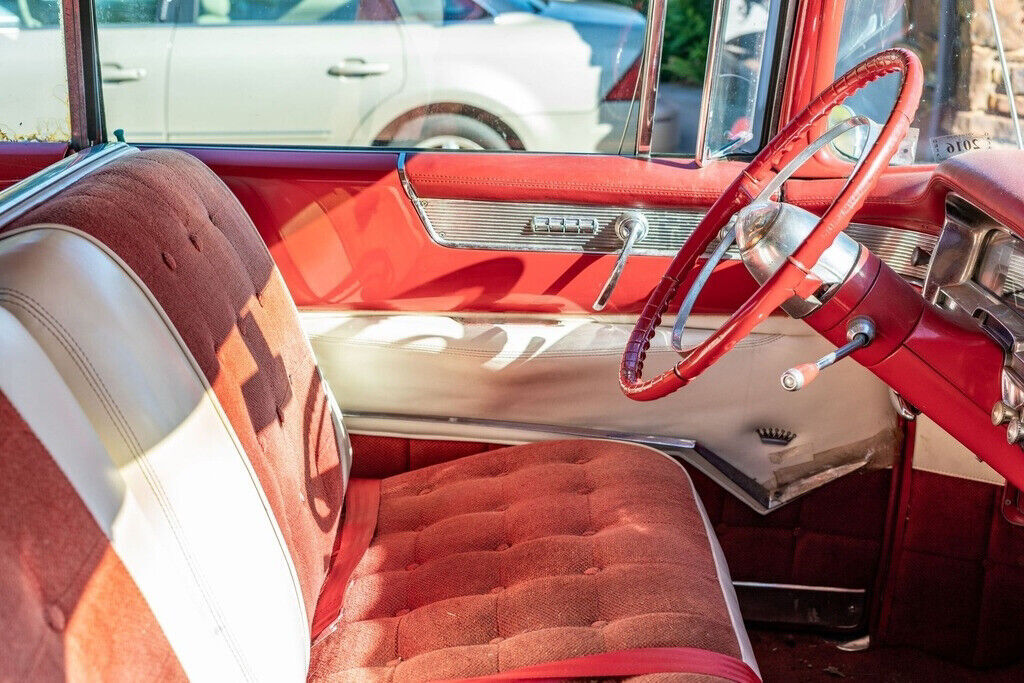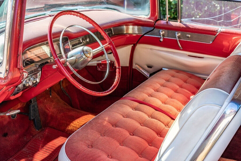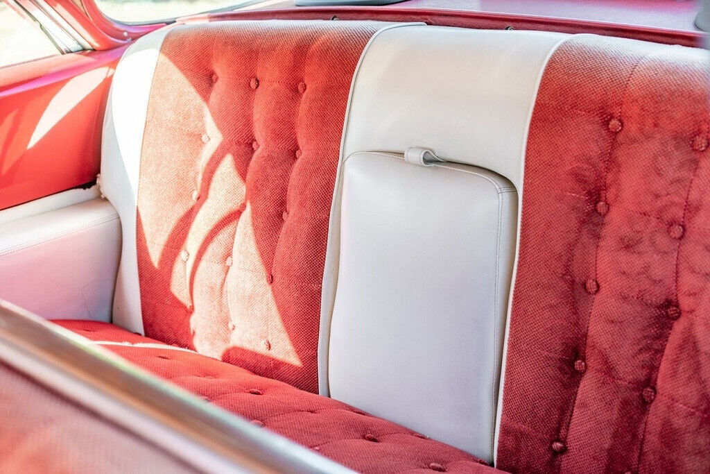 The large six-passenger red and white interior combines painted metal surfaces, leather, and fabric with the high contrasts typical of 1950s American automobiles. The seller notes that the seats had been redone before he bought the car. No tears or stains are reported or observed, but the seller does note that the fabric shows some sun fade. The door panels, dashboard, steering wheel, gauges and controls, carpet, and headliner all appear original and are described by the seller as in “very good” condition. Front and rear Cadillac Crest floormats are also provided. The interior trim is described as complete. The gauges and controls are reported to work properly with the exception of the gas gauge and the radio. Power windows were still an innovation in 1955, and no issues are reported. Door handles, locks, and vent windows are manual. The heater is said to work. There is no air conditioning.