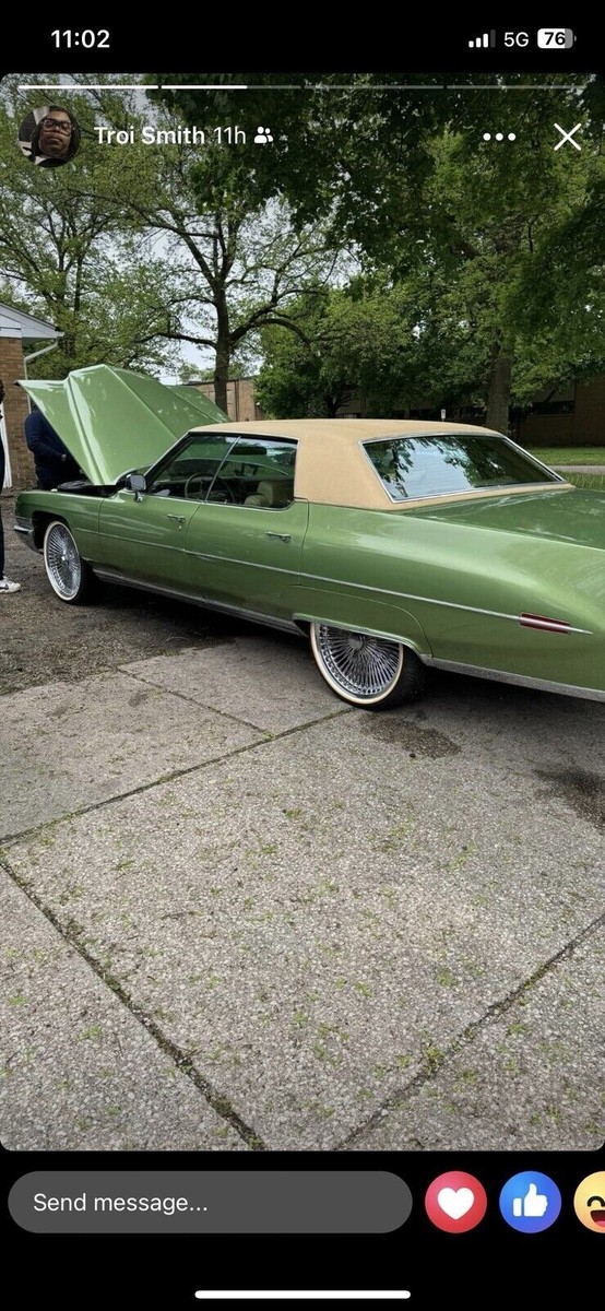 This 1971 Cadillac DeVille Sedan is a true classic car, with a green exterior color and a tan interior color. It has a 472 engine size with 8 cylinders and an automatic transmission. The car has a RWD drive type and a mileage of 71,796. The vehicle title is clean, and it has a body type of sedan with 4 doors. The car seats 5 people and has a trim of Sedan DeVille. It is a left-hand drive and has a fuel type of gasoline. The Cadillac model is in great shape and is perfect for collectors or anyone who loves classic cars.Need Front Spindles (Part Included)Need Trunk Resprayed & Rear Drivers Side Tire