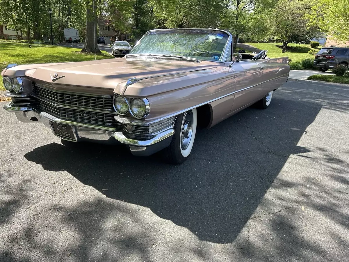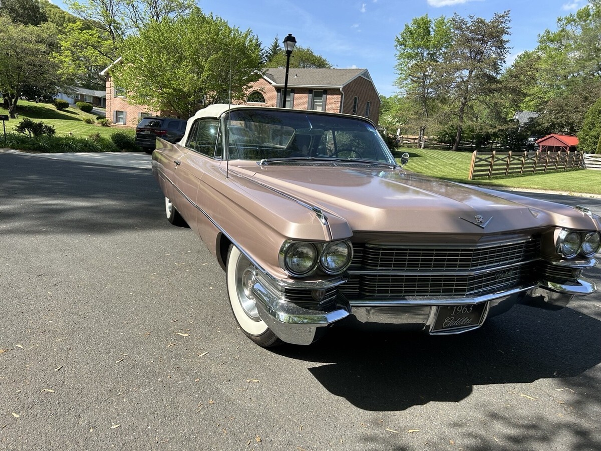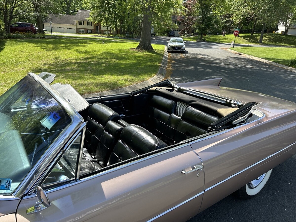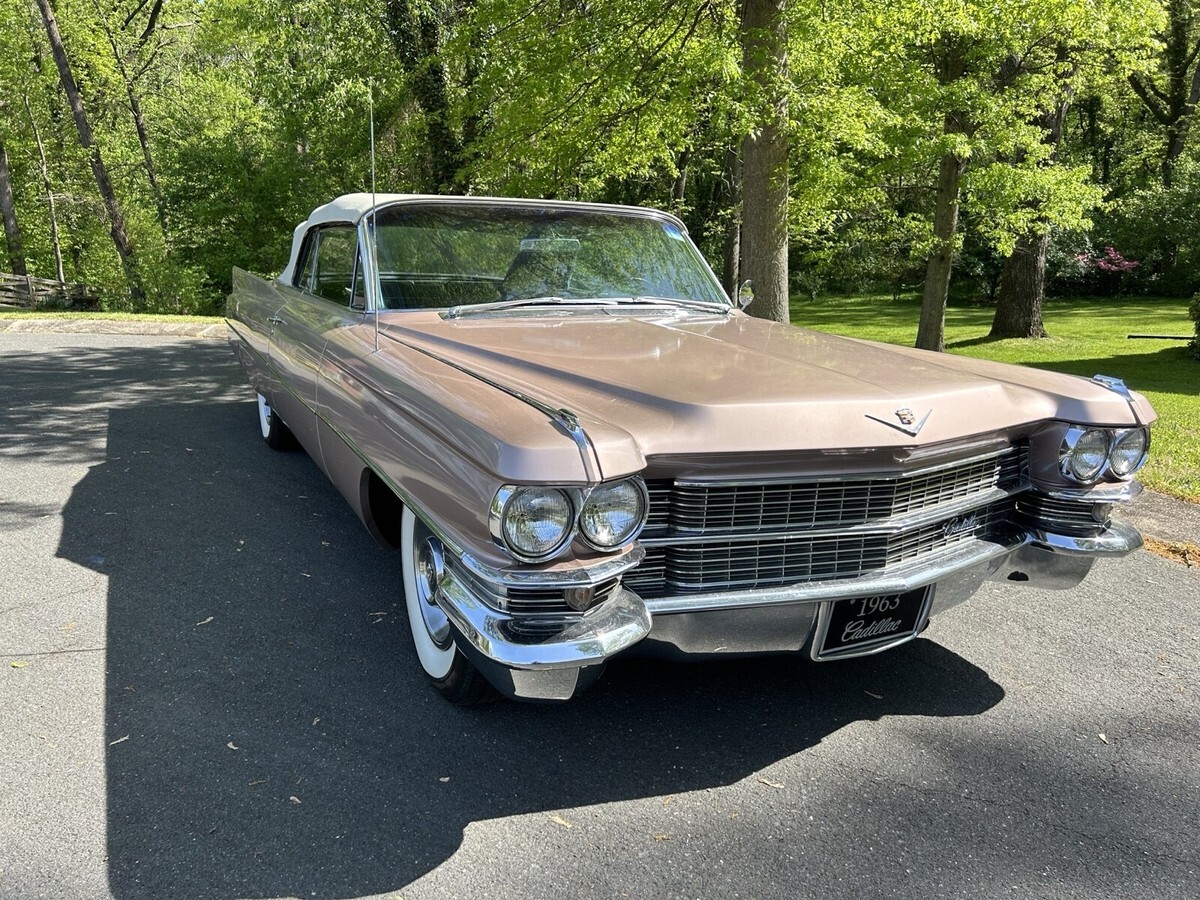 This is a gorgeous 1963 Cadillac Series 62 Convertible. This 1963 Cadillac Series 62 convertible has been repainted in Briar Rose in 2018. a 390ci V8 linked with a two speed Hydra-Matic automatic transmission, the car features a power-operated convertible top, power steering, power-assisted brakes, wheel covers, a power-adjustable front seat, and an AM radio. An aluminum radiator was installed and the convertible tops lift-motor pump was replaced in March 2025. Acquired by the current owner in 2013, this Cadillac convertible is now offered in Maryland. Exterior details include a power-operated white convertible top, a black top boot, quad headlights, a driver-side mirror, rear-wheel skirts, and tail fins with integrated taillights as well as chrome bumpers, window surrounds, and trim. The convertible tops lift-motor pump was replaced in March 2025. Steel 15 wheels feature Cadillac-crested ribbed covers and are mounted with Cocker wide whitewall tires measuring 235/75R15. Power steering was standard equipment, and braking is provided by power-assisted drums. The bench seating is tufted black leather, which is complemented by a color-coordinated dashboard, door panels, and carpeting. The front seat is power adjustable, and other interior equipment includes an AM radio, seatbelts, and courtesy lighting. The two-spoke steering wheel fronts a horizontal 120-mph speedometer and gauges for coolant temperature and fuel level. The five-digit odometer shows 02584 miles, approximately 1000 of which were added under current ownership. The 390ci V8 was factory equipped with a four-barrel carburetor and was rated at 325 horsepower and 430 lb-ft of torque. An aluminum radiator was installed in March 2025 and the oil and filter were changed. Power is routed to the rear wheels through a two-speed Hydra-Matic automatic transmission.This Cadillac is available for inspection in Maryland. We are pleased to coordinate inspections, and we help coordinate shipping.