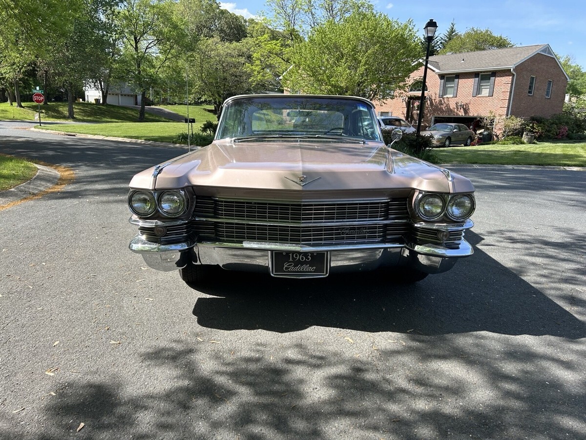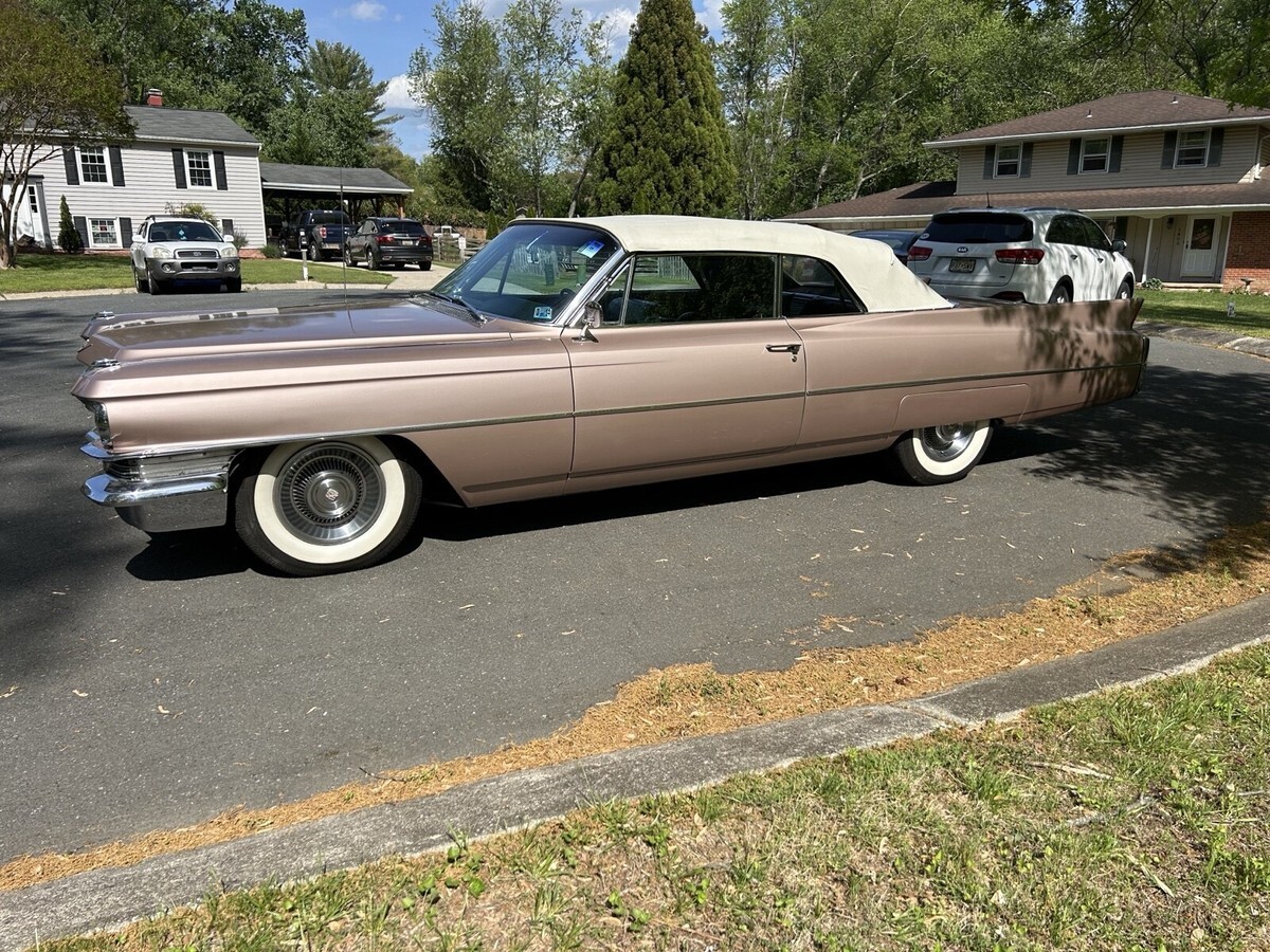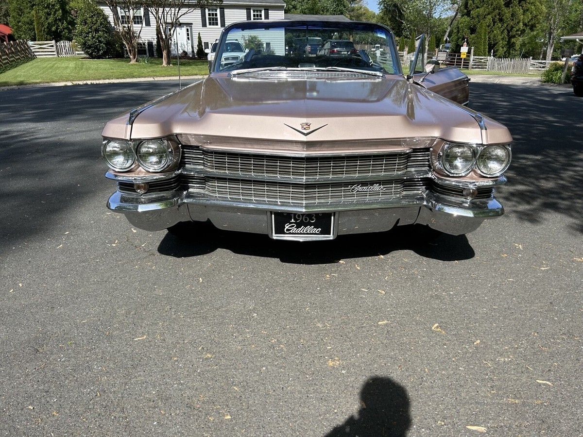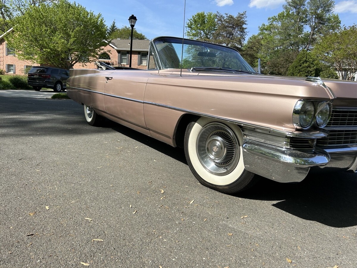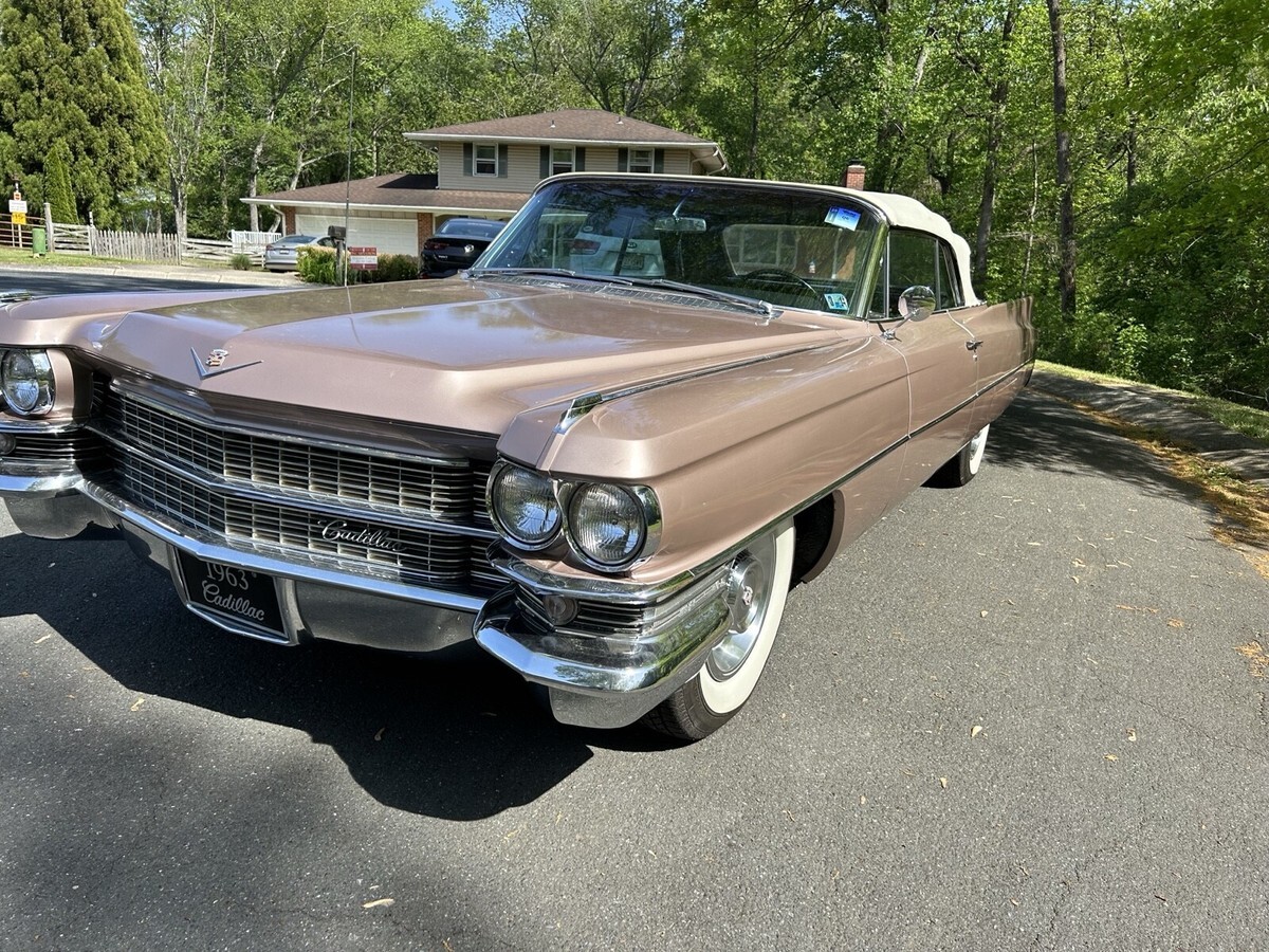 This is a gorgeous 1963 Cadillac Series 62 Convertible. This 1963 Cadillac Series 62 convertible has been repainted in Briar Rose in 2018. a 390ci V8 linked with a two speed Hydra-Matic automatic transmission, the car features a power-operated convertible top, power steering, power-assisted brakes, wheel covers, a power-adjustable front seat, and an AM radio. An aluminum radiator was installed and the convertible tops lift-motor pump was replaced in March 2025. Acquired by the current owner in 2013, this Cadillac convertible is now offered in Maryland. Exterior details include a power-operated white convertible top, a black top boot, quad headlights, a driver-side mirror, rear-wheel skirts, and tail fins with integrated taillights as well as chrome bumpers, window surrounds, and trim. The convertible tops lift-motor pump was replaced in March 2025. Steel 15 wheels feature Cadillac-crested ribbed covers and are mounted with Cocker wide whitewall tires measuring 235/75R15. Power steering was standard equipment, and braking is provided by power-assisted drums. The bench seating is tufted black leather, which is complemented by a color-coordinated dashboard, door panels, and carpeting. The front seat is power adjustable, and other interior equipment includes an AM radio, seatbelts, and courtesy lighting. The two-spoke steering wheel fronts a horizontal 120-mph speedometer and gauges for coolant temperature and fuel level. The five-digit odometer shows 02584 miles, approximately 1000 of which were added under current ownership. The 390ci V8 was factory equipped with a four-barrel carburetor and was rated at 325 horsepower and 430 lb-ft of torque. An aluminum radiator was installed in March 2025 and the oil and filter were changed. Power is routed to the rear wheels through a two-speed Hydra-Matic automatic transmission.This Cadillac is available for inspection in Maryland. We are pleased to coordinate inspections, and we help coordinate shipping.