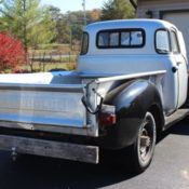 Entire body was soda blasted to bare metal prior to refinishing. Truck is finished in a high quality Valspar Blitz Black single stage catalyzed product.Hood was shaved of emblems and side trim. Lower grille roll pan was added. Rear bumper is a 49 Plymouth that has been narrowed and powder coated to match grille bars. License plate surround is a 1959 Corvette unit modified to fit the ribs of the Plymouth bumper. All glass with the exception of the rear doors is new as well, as is all weather stripping, door felts and fender welting. Interior and exterior door handle and window cranks are new. Turn signal lights were removed from the grille and modern halogen headlights with built in amber LED turn signals were installed. Rear taillights are LED units as well. 1952 doors were used to acquire the vent window style doors used on the later year trucks. Side lower body panel that houses the side pipes are Mustang Eleanor fiberglass units.