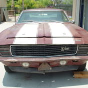Equipped with AC but needs repair. Painted red but was originally silver. Some paint blemishes. New door panels and carpet. Tach, clock, and oil gage do not work. Corvette cassette radio works but will not tune.
