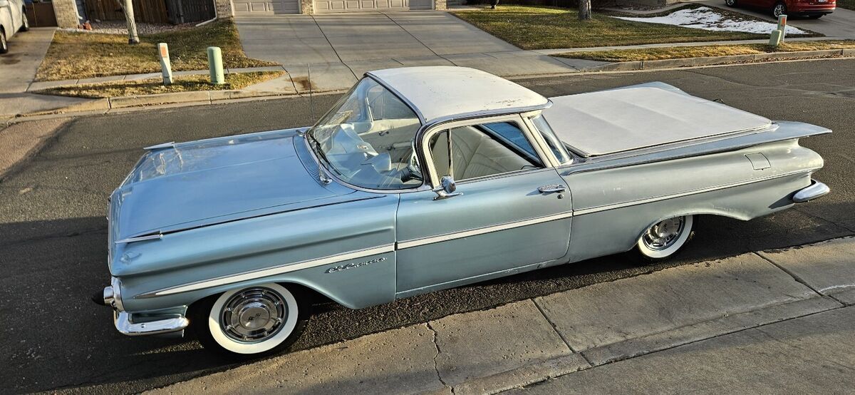 (Read,Note,Read,Note,Read, more pictures below in description) 1959 Chevrolet El Camino Series 1280 V-8 model but engine change to 6 cylinder 250, 3 speed standard transmission with overdrive. Only 22,246 1959 el camino's built. Car was built in Janesville, WI. Cowl tag shows this car trim code 835= Blue material type cloth and vinyl. Paint code 910A= Frost Blue Acrylic.
