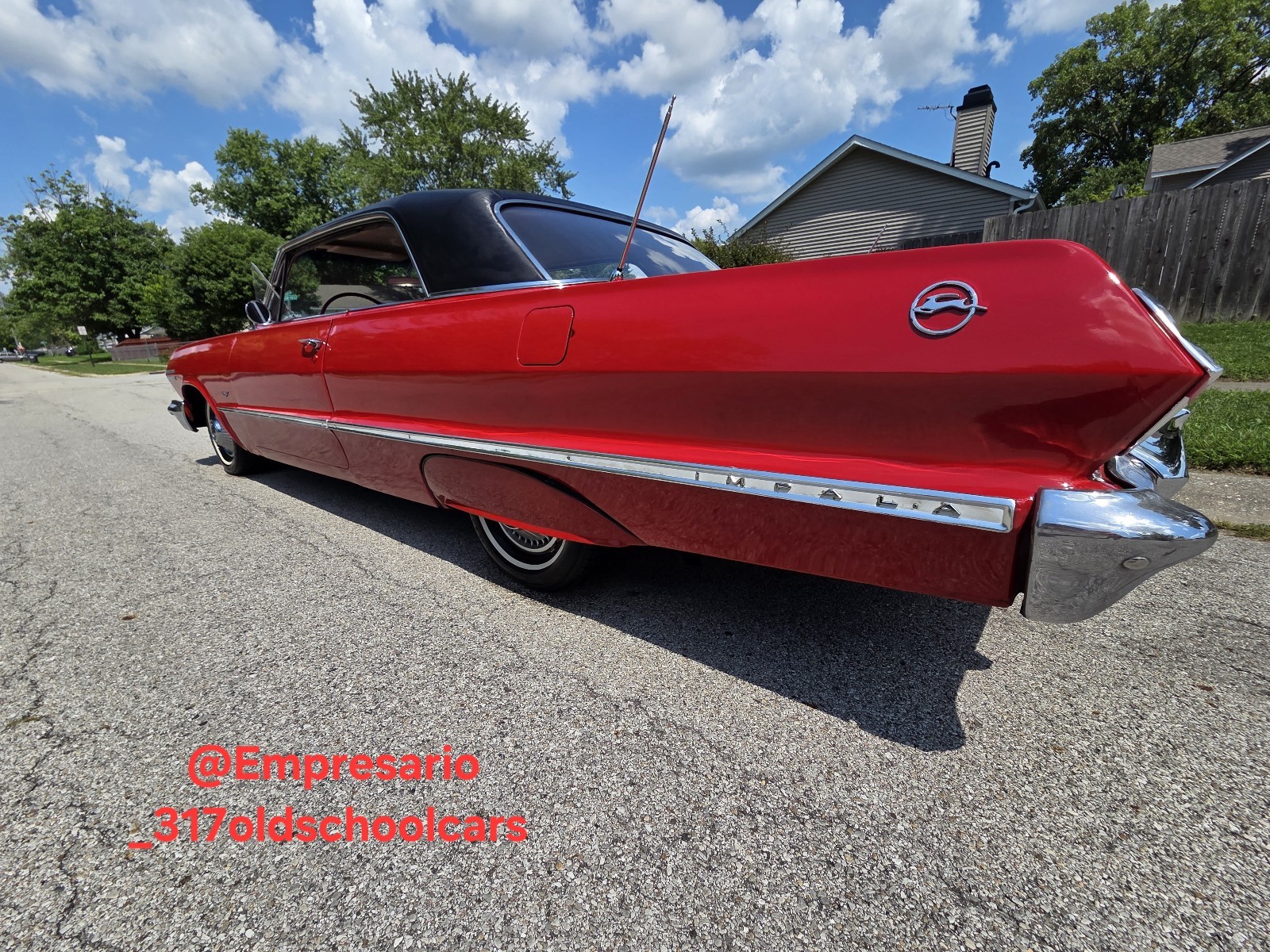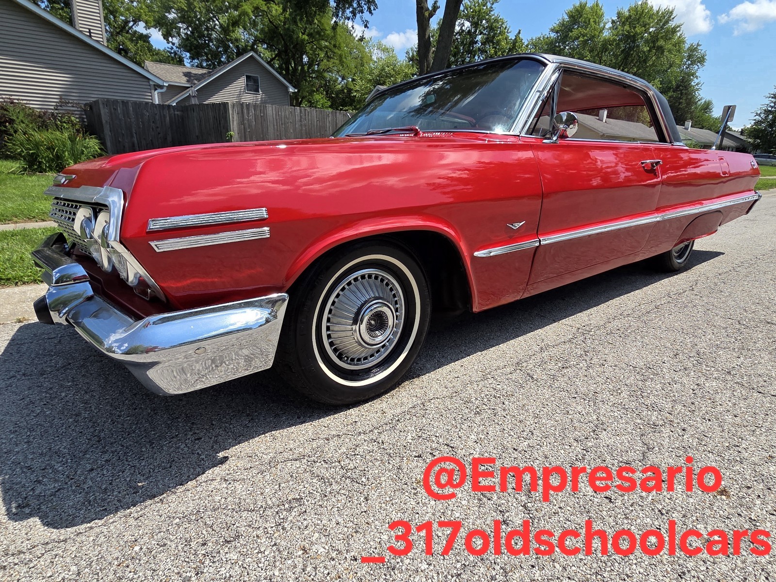 A 1963 Chevrolet Impala is a classic American full-size car with a sleek, rectilinear design, featuring a redesigned body with sharp lines, a prominent chrome grille, and a distinctive tail light panel