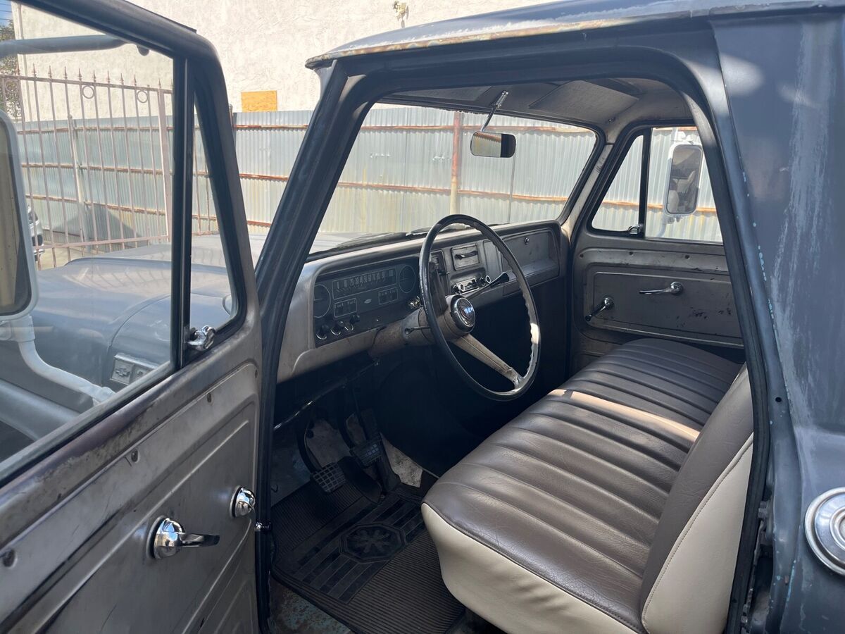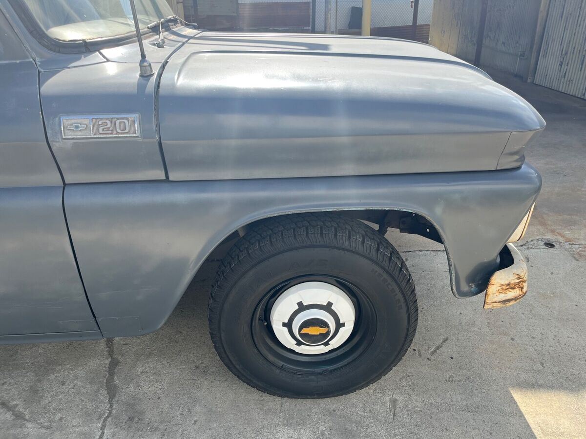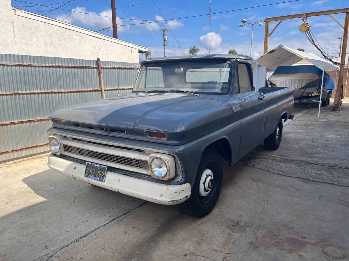 This 1965 Chevrolet C-20 (three quarter ton) long bed pick up truck, has been in the family since 1965. Except for the color changed from blue to gray, it remains entirely original, including the am radio. There are some dents, scratches and small repairs to the usual rust damage.The original “split rim” and tube tires have been stored and included. It has a six cylinder 230 engine and a “three on the tree” Manuel transmission. There are no fluid leaks. All paperwork kept.