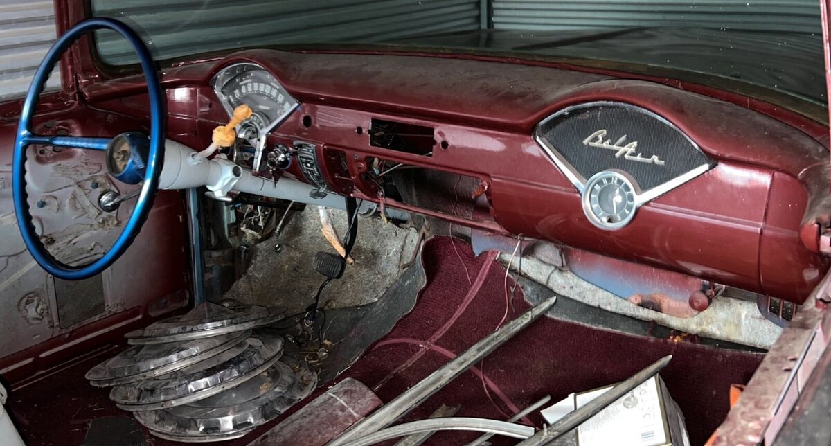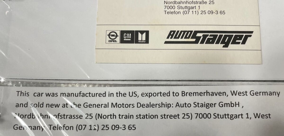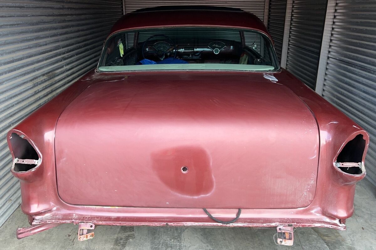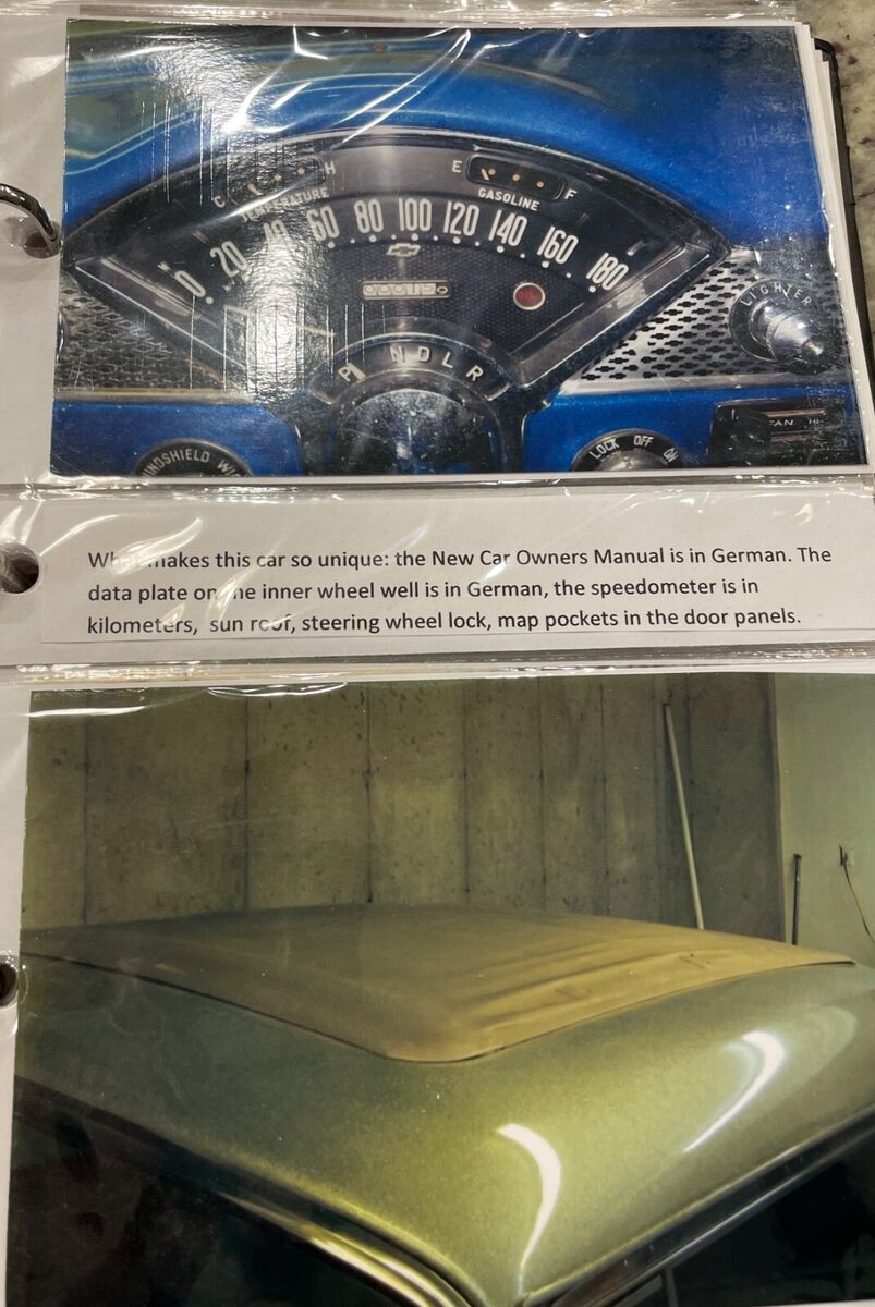 In 1955 exported to Bremerhaven, West Germany and sold by GM dealer Auto Staiger GmbH in Stuttgart. In 1969, the car was purchased from its previous owner (said to be a farmer) by US tank commander Chief Warrant Officer Larry S. Griffaw who was stationed there. At that time, the new owner installed a 327 V8 engine and a replacement windshield that he received via military transport channels. During the 10 years the new buyer was in Germany for the military, he conducted research and met the car dealer who originally sold it. He also accumulated numerous photos and documents relevant to this car. In 1972 it underwent it's first restoration at the Army Base Craft Shop in Fulda, West Germany. In 1979, the Commander returned to the US, making some changes to the car including sealed beam headlights and MPH speedometer to replace the KPH original. In 1974 it was restored a second time in Imperial Missouri. It was exposed to a garage fire in 1982 in Lawton, Oklahoma after which a third restoration was completed in1983 after which it competed in the first and second ISCA car shows (1983-84). In 1986, Larry Griffaw and members of his tank inspection team returned to Auto Staiger GmbH in Stuttgart for a visit, posing for pictures in front. At some point during the restorations, it was returned to the correct 265 with Power Glide. The car was since stripped to bare metal and repainted in the original Dusk Rose base color.