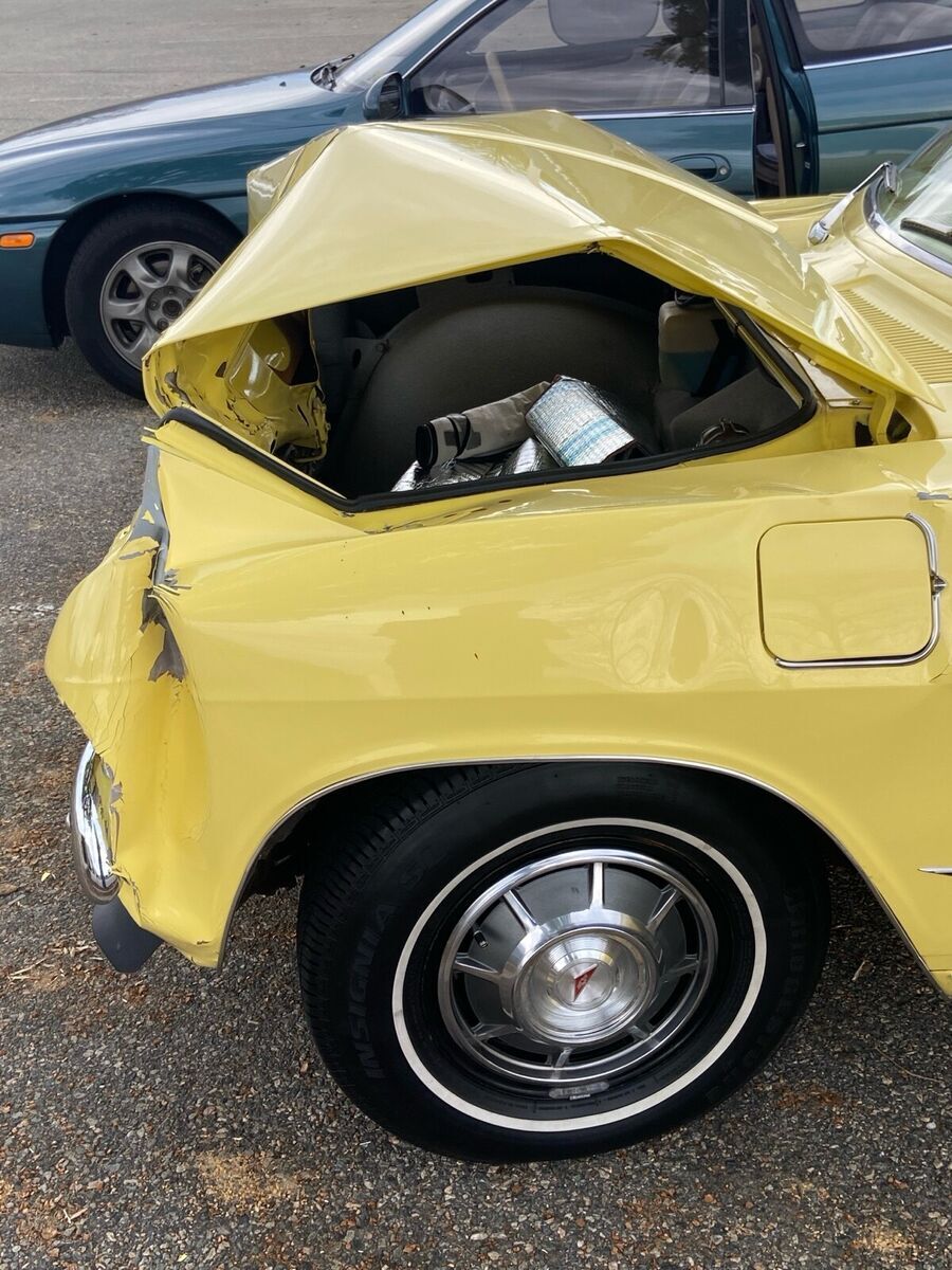 Unfortunately this 66 Corvair Monza (Chevrolet) convertible was in a collision in late 2024. The damage to the front of the car is extensive but in the right hands it can be repaired. Probably a great project car to be road worthy again. There has been several thousand of dollars invested in this car over the past few years and I would hate to see it go to a junk yard as a final resting place.