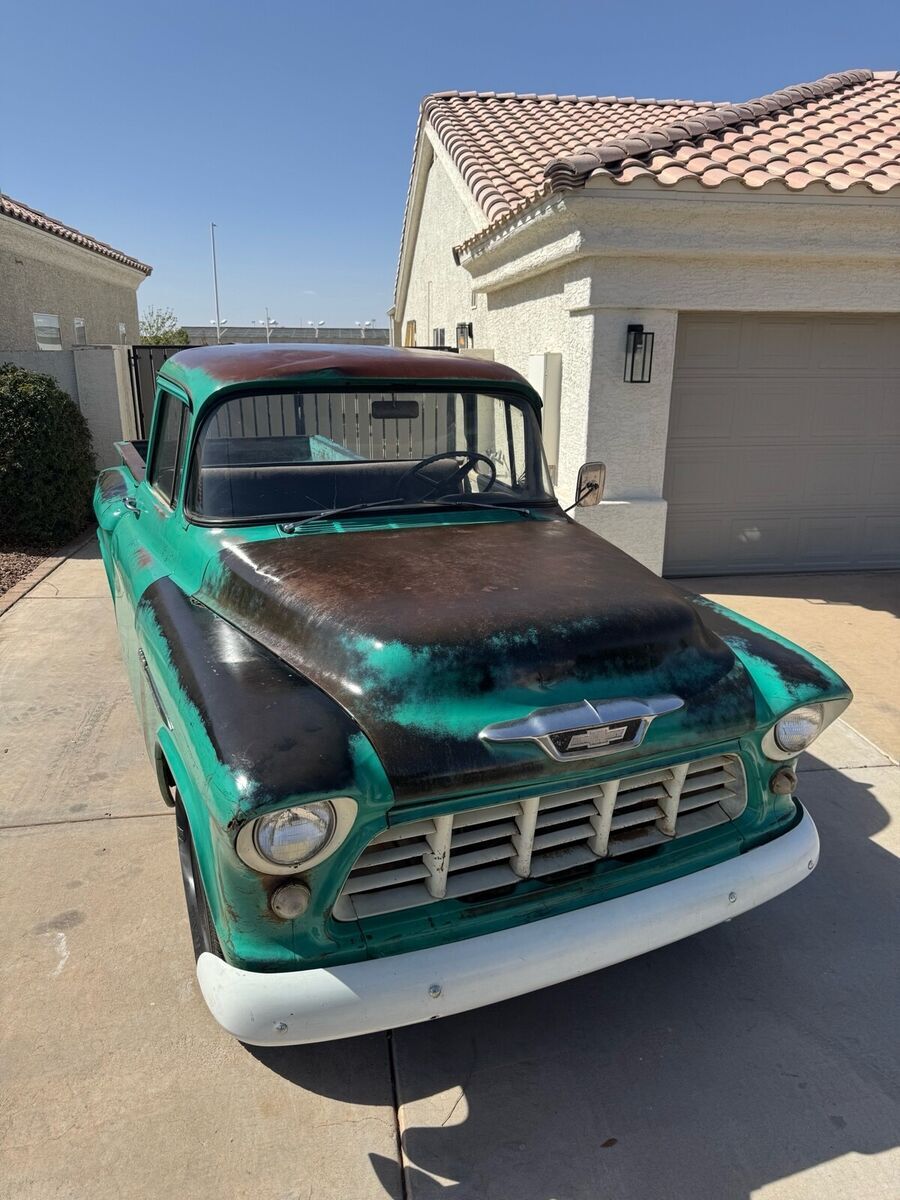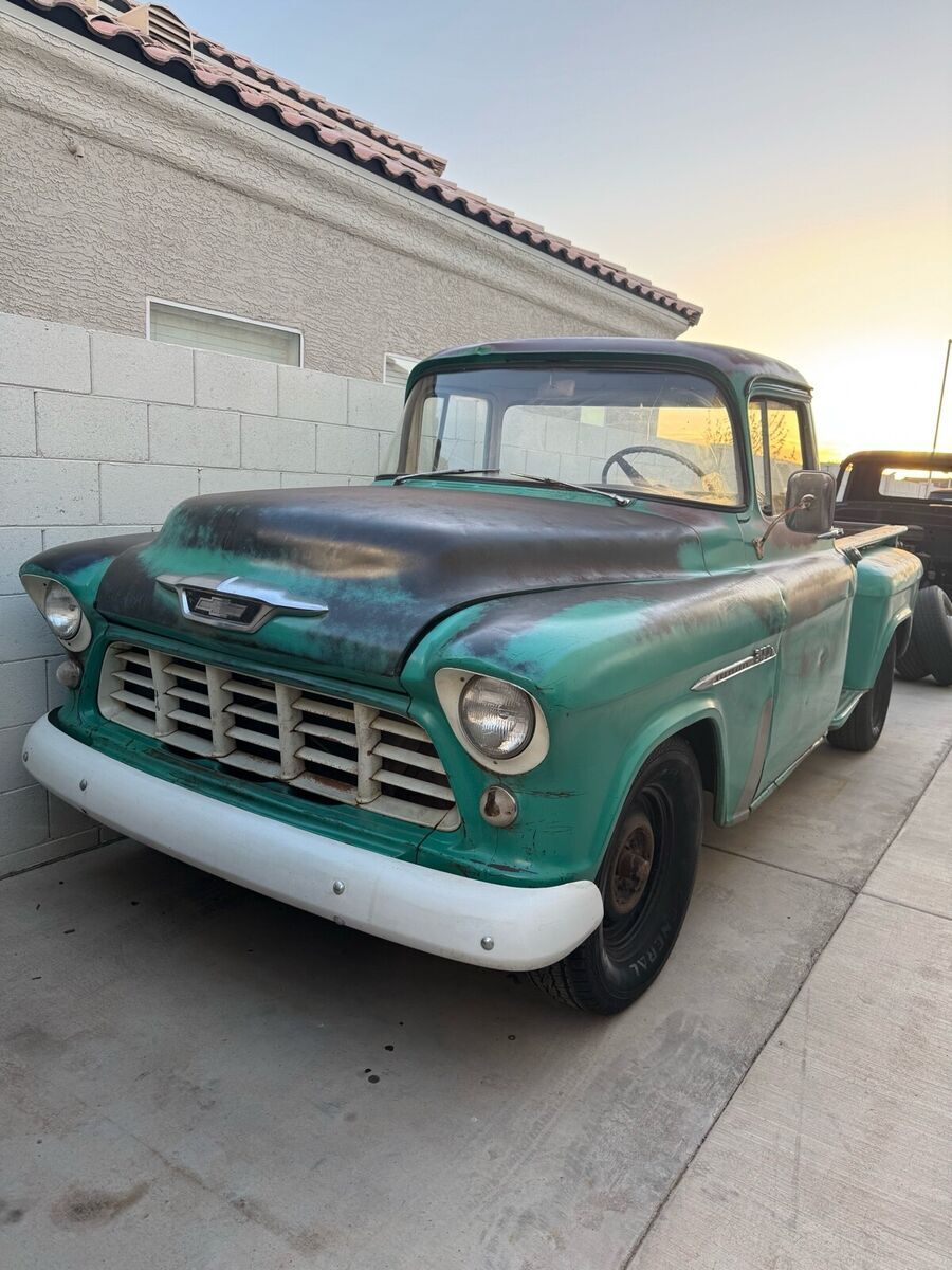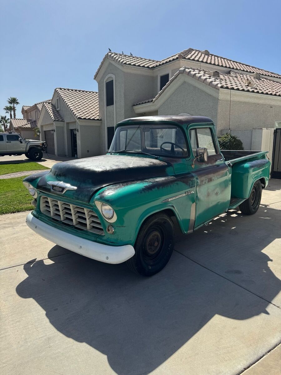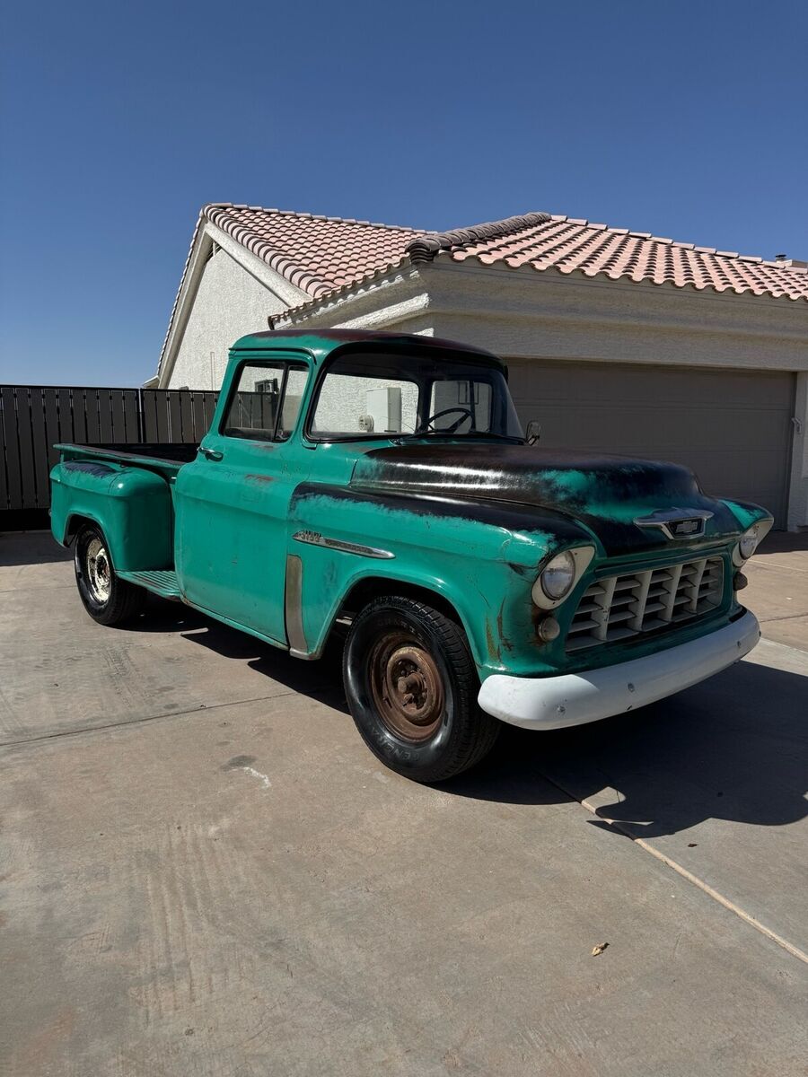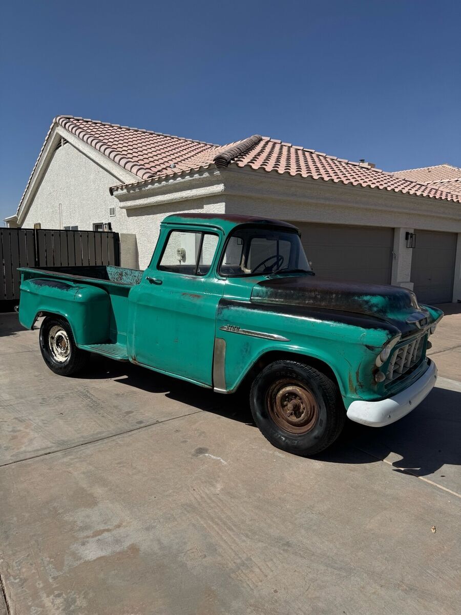 1955 Chevy pickup in factory Galway Green half ton big back window stepside in-line six motor manual 3 on the column This truck remains in its factory original state, including the highly desirable original patina. Clean Montana title. Vehicle is located in Gilbert, Arizona This vehicle starts and drives short distances due to brakes not working at this time. Shift linkage needs to be adjusted as well. New Fuel cell. This truck is 70 years old and does include various bumps and scratches as seen in the pictures All glass is original, including the wood in the bed. Also, this truck does not have the wheel cut out on the driver rear fender. Metal work has been completed professionally on both bottom front fenders. To view motor running copy and paste this link below : https://www.instagram.com/reel/DGq97AgSBW7/?igsh=MW5kYjBjaTV4MzcwdA==