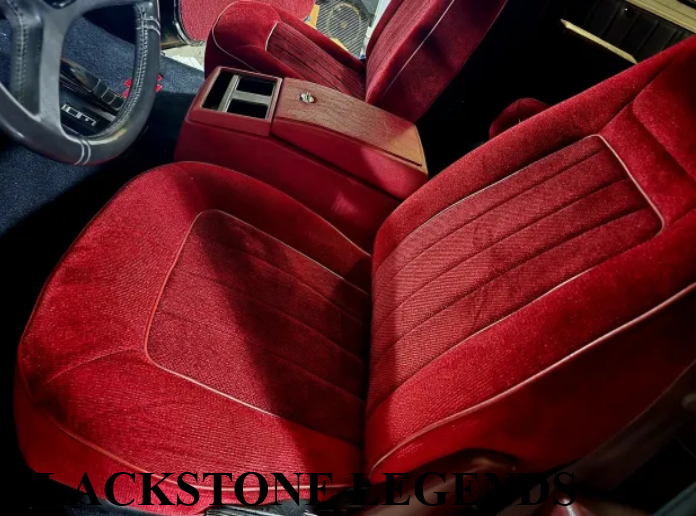 The front bucket seats and rear bench were reupholstered in burgundy cloth along with the door panel inserts. Appointments include cruise control, a Pioneer Bluetooth stereo, and power windows, locks, and mirrors. The air conditioning system was serviced in 2024. The passenger seat hinge cover is missing.