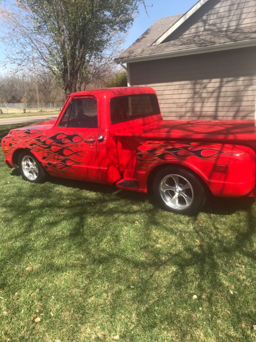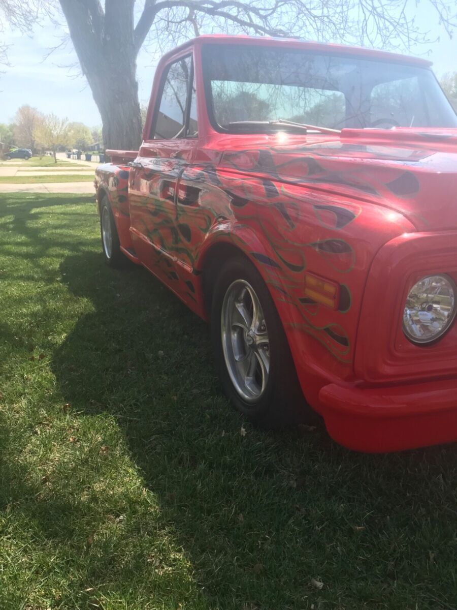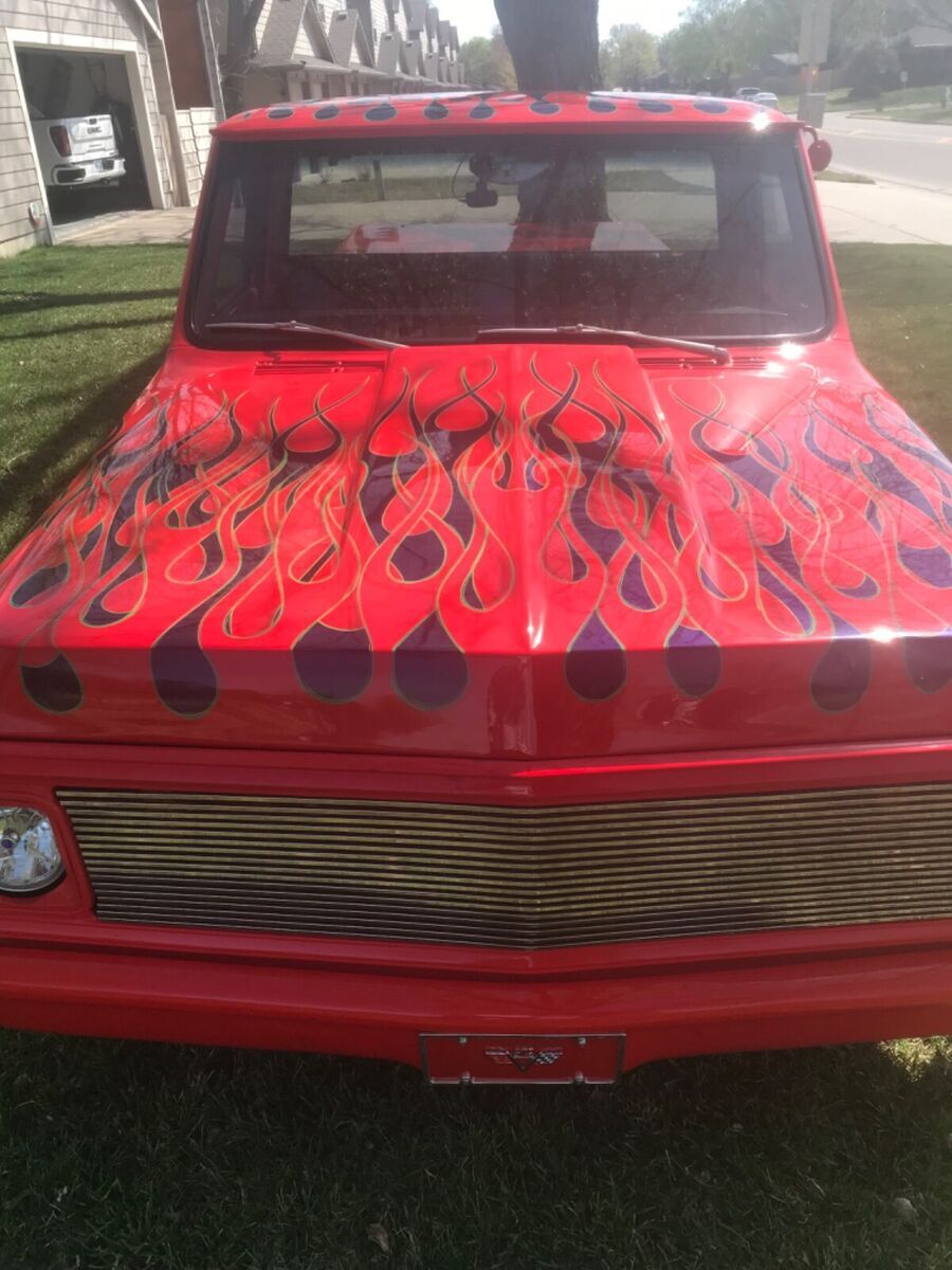 1971 C10 Custom. Paint is in excellent condition. All flames and pinstriping buried under 5 coats of clear. Will not feel a line anywhere. Flames are a purple/blue pearl with bright green pinstriping. Smooth and shiny. Custom tonneau cover covering a perfect wood floor. Tailgate has hidden latches. Glass is all excellent. Interior is in excellent condition. Boyd Coddington custom 17” wheels. Fronts our 17x8 with Nitto NT450’s 255/50/17. Rears are 17x10 with 275/50/17 tires. Now for the best part. The drivetrain. Have owned over 100 vehicles and this is by far the fastest and funnest vehicle I have driven but it’s not for inexperienced drivers. Can get away from you in a hurry. Even at 40mph will get sideways instantly. 1st of all the 20k 572 big block rated at 620hp. Just tap the key and fires right up. Mated to a monster transmission 700R4. Traction via a 12 bolt positrac with 3:73 gearing. 70mph it turns 2k rpm. 3” dual exhaust. Sounds awesome. Runs 180 degrees consistently. Power brakes with a hydro boost with drilled and slotted rotors up front. Drums in the rear. Custom 572 emblems on the front license plate and another on the radio block off plate since it has a overhead headliner with built in radio and speakers. If you like the pics the truck is much better in person and sounds like no other. No leaks at all.