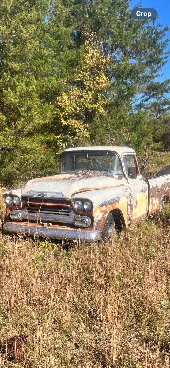 1959 chevy truck Apache big back window, double deluxe truck. This is a factory 6 cylinder with 3 speed on the column 2wd long bed. Has the Apache fleet side option along with the double deluxe option. The Apache double deluxe replaced the cameo option from 58. Truck has not ran in several years. Does have rust, Will need complete restoration. No title. Plenty of great parts of restore. Truck is located in mecklenburg county Va.