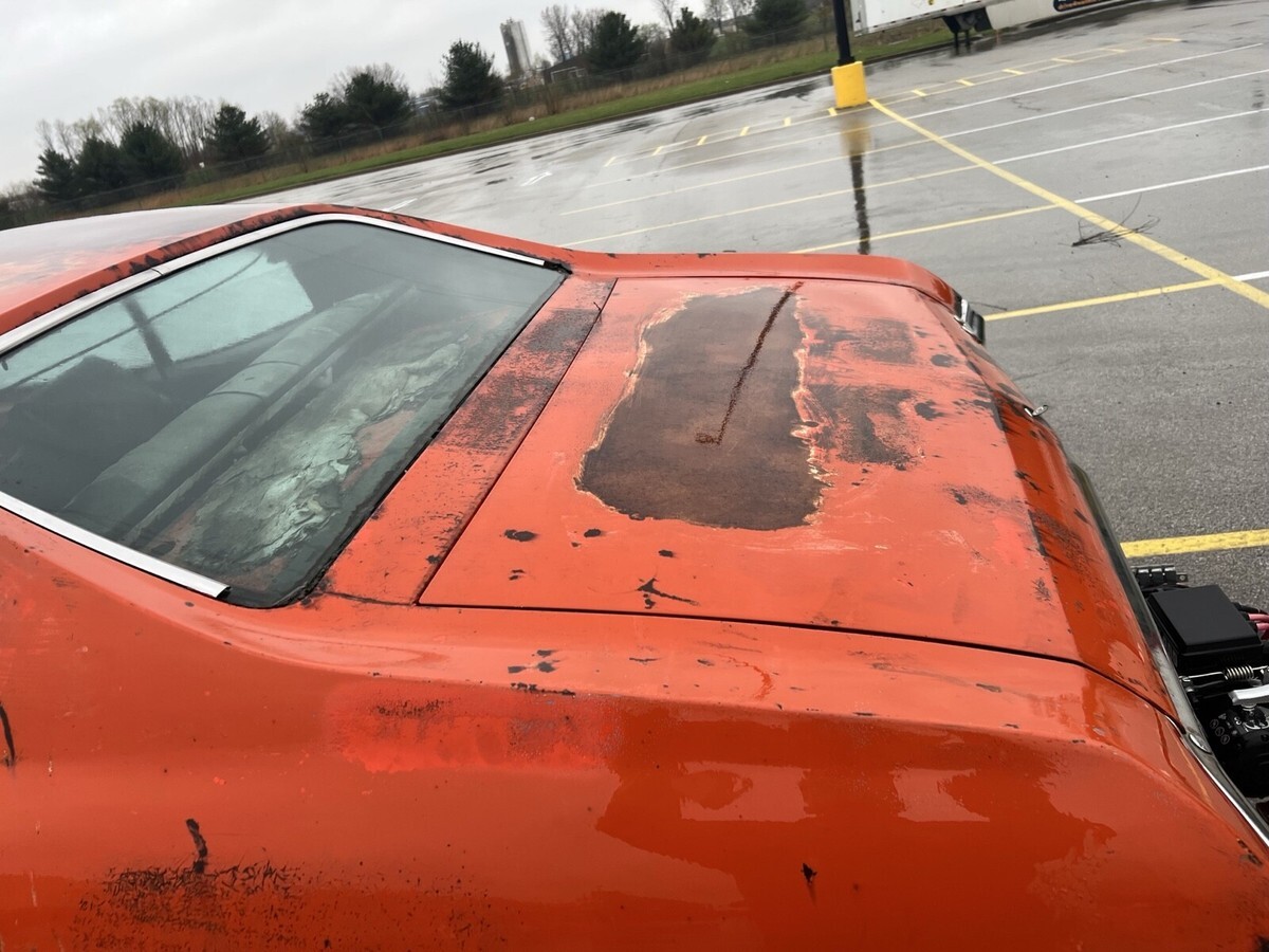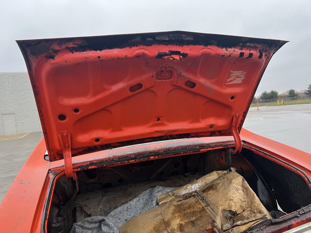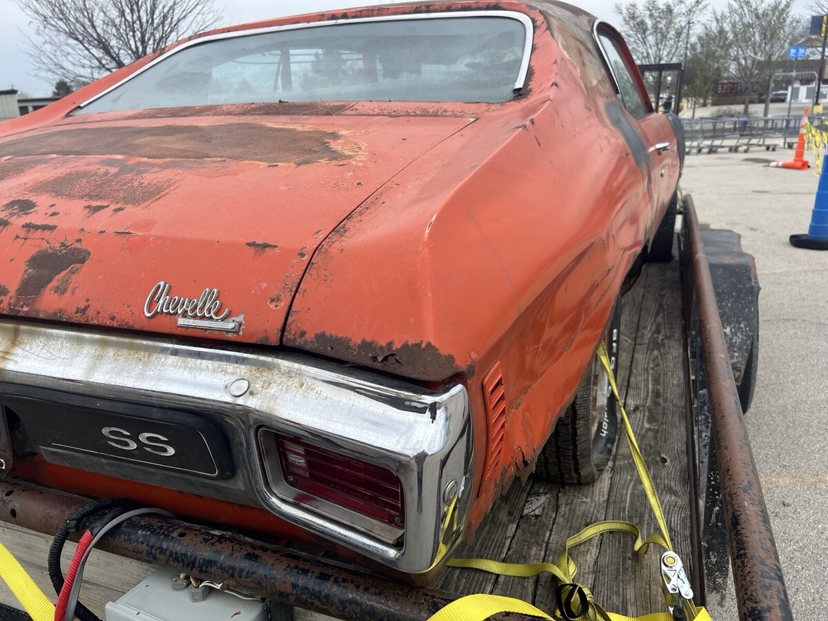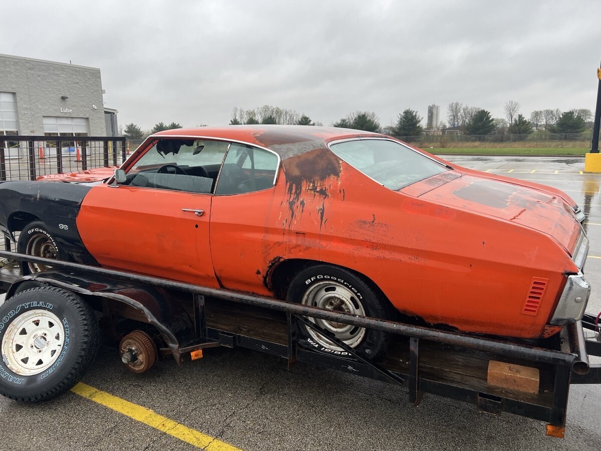 Pictures speak for themselves, it needs a complete floor, frame is roug, (comes with an additional 70 chevelle frame), fenders need lower patches, front inside of hood needs patched, decklid needs replaced, quarters need replaced,etc.