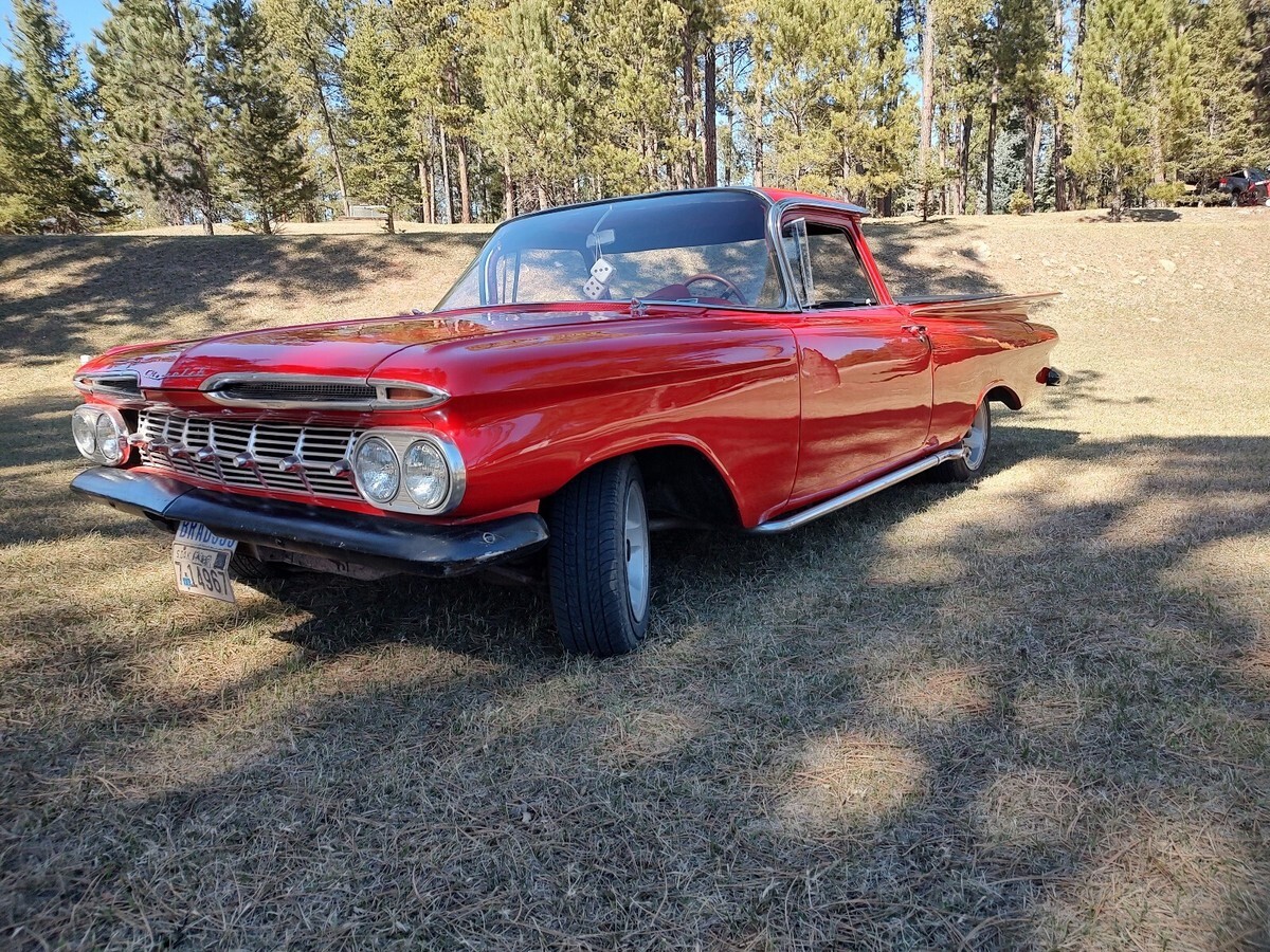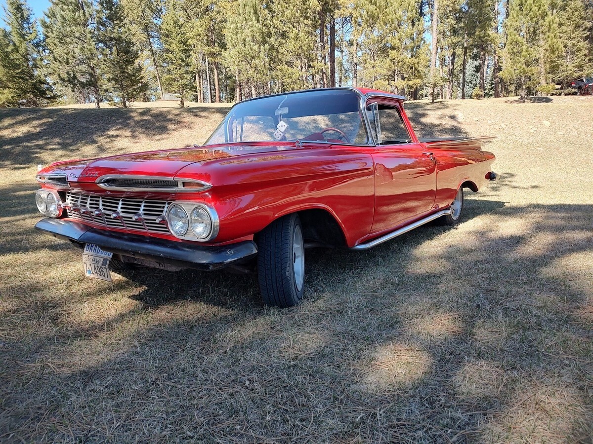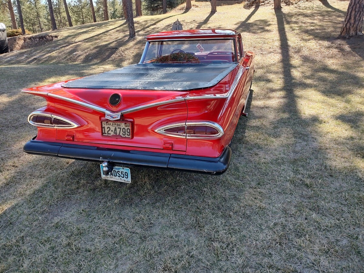 1959 El Camino 283 cid V-8 2 bbl 3 speed Saginaw transmission original positrac rear axle-- 20 year old restoration -included then-new radiator, brake shoes, wheel brgs, brake lines- (steel and rubber,) body work and paint--spray on black rubber box liner- tonneau cover-seat recovered-carpet and chrushed velour interior- Tires 2 years old, good tread left, on aluminum Chevy S-10 rims- battery 1 year old- crome exhaust Lakewood pipes-air shocks-front windshield and rear window good condition -side door glass is cracked - vent windows fair, some bubbling -right side door has parking lot scratch on it-right rear fender well has some bubbling-( both issues shown in pictures)-car starts, runs and drives good-driven weekly in Spring, Summer, hauling bicycles to trails, and pulling jet skii to the lake- parked rest of the year under garage lean/too with a car cover on it, ( cover goes with the car) Selling car to pay off Vacation Home Rental construction costs. Car is centrally located in Western South Dakota in the Black Hills near Rapid City. Bring your trailer or rent a u-haul trailer in Rapid City. Free overnight stay in our brand new "tiny home" when you pick up the car before May 15th.