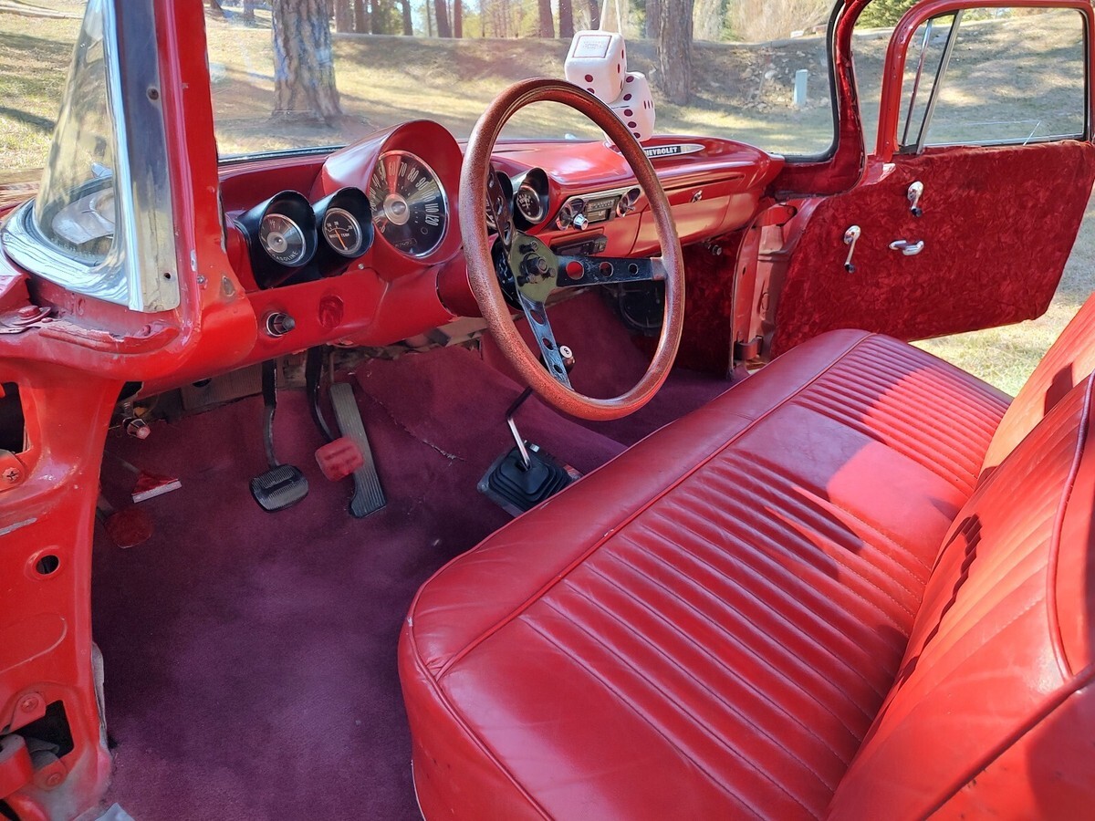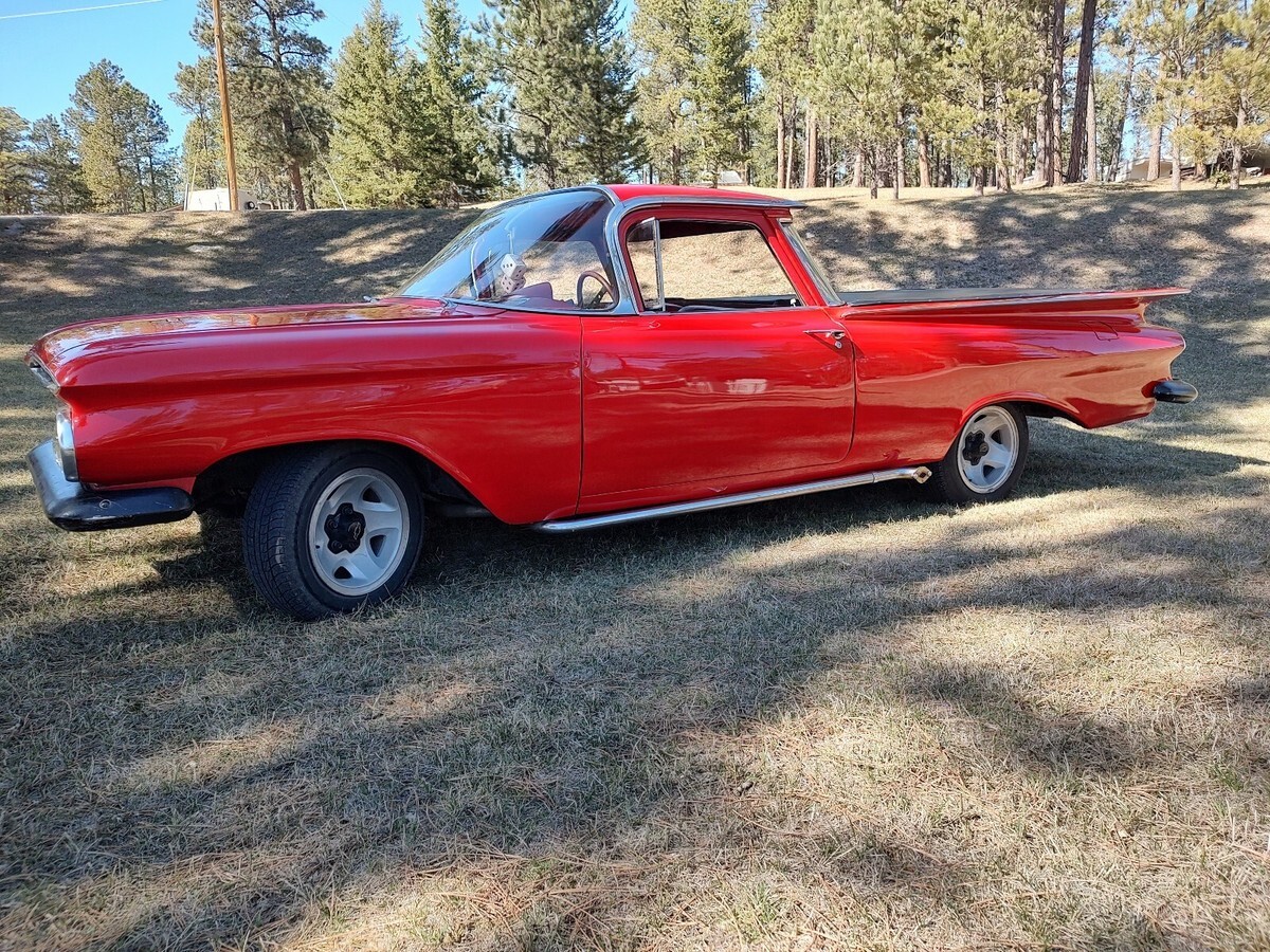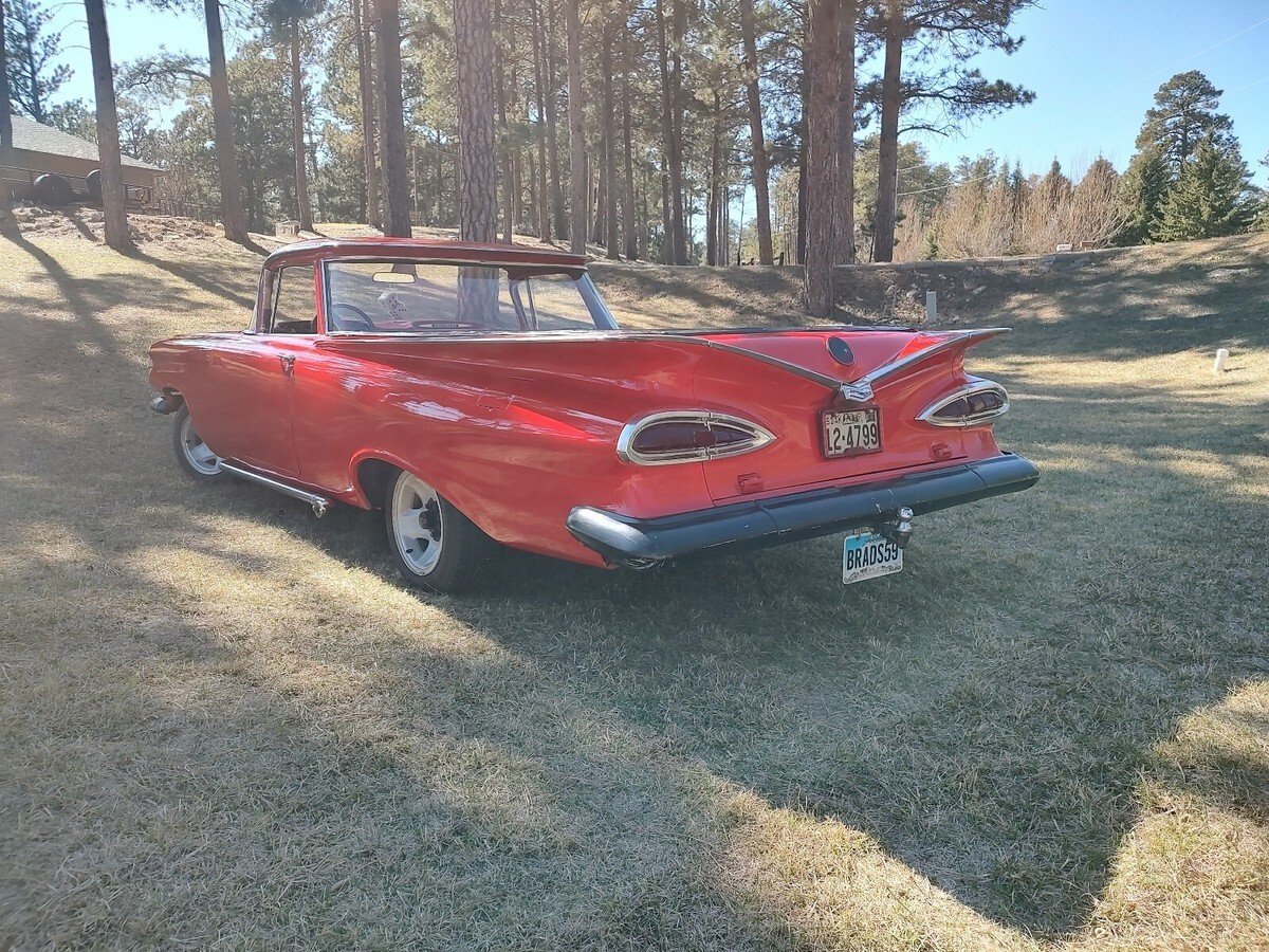 1959 El Camino 283 cid V-8 2 bbl 3 speed Saginaw transmission original positrac rear axle-- 20 year old restoration -included then-new radiator, brake shoes, wheel brgs, brake lines- (steel and rubber,) body work and paint--spray on black rubber box liner- tonneau cover-seat recovered-carpet and chrushed velour interior- Tires 2 years old, good tread left, on aluminum Chevy S-10 rims- battery 1 year old- crome exhaust Lakewood pipes-air shocks-front windshield and rear window good condition -side door glass is cracked - vent windows fair, some bubbling -right side door has parking lot scratch on it-right rear fender well has some bubbling-( both issues shown in pictures)-car starts, runs and drives good-driven weekly in Spring, Summer, hauling bicycles to trails, and pulling jet skii to the lake- parked rest of the year under garage lean/too with a car cover on it, ( cover goes with the car) Selling car to pay off Vacation Home Rental construction costs. Car is centrally located in Western South Dakota in the Black Hills near Rapid City. Bring your trailer or rent a u-haul trailer in Rapid City. Free overnight stay in our brand new "tiny home" when you pick up the car before May 15th.