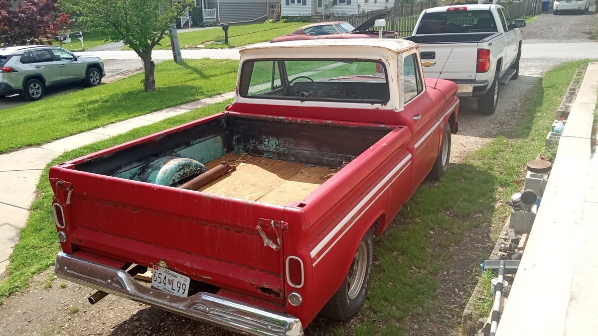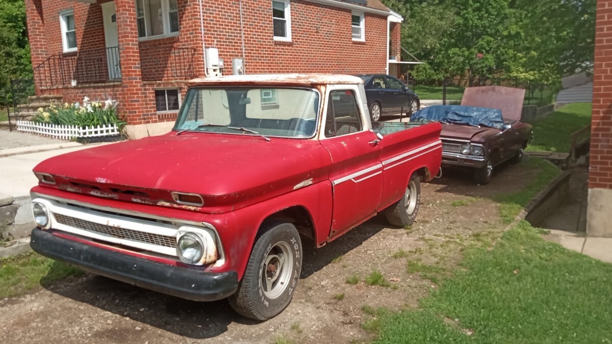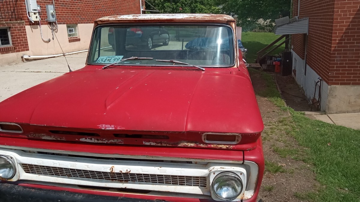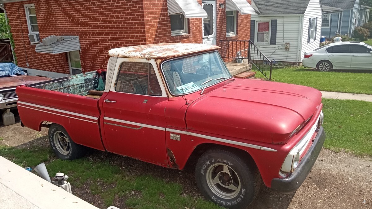 1966 C10 short bed .283 manual was a 3 on the tree. Someone put in a floor shifter cond unknown.Engine sounds good.windshield has a crack in it.selling as is cond.with clean MD title in my name.Truck not drivable driveshaft out.Body as seen.Has rust.Frame solid.Tires fair.New battery and master cylinder.Wont take much to make road worthy.Bid to win .No reserve.running off gas can.Tank needs cleaner.