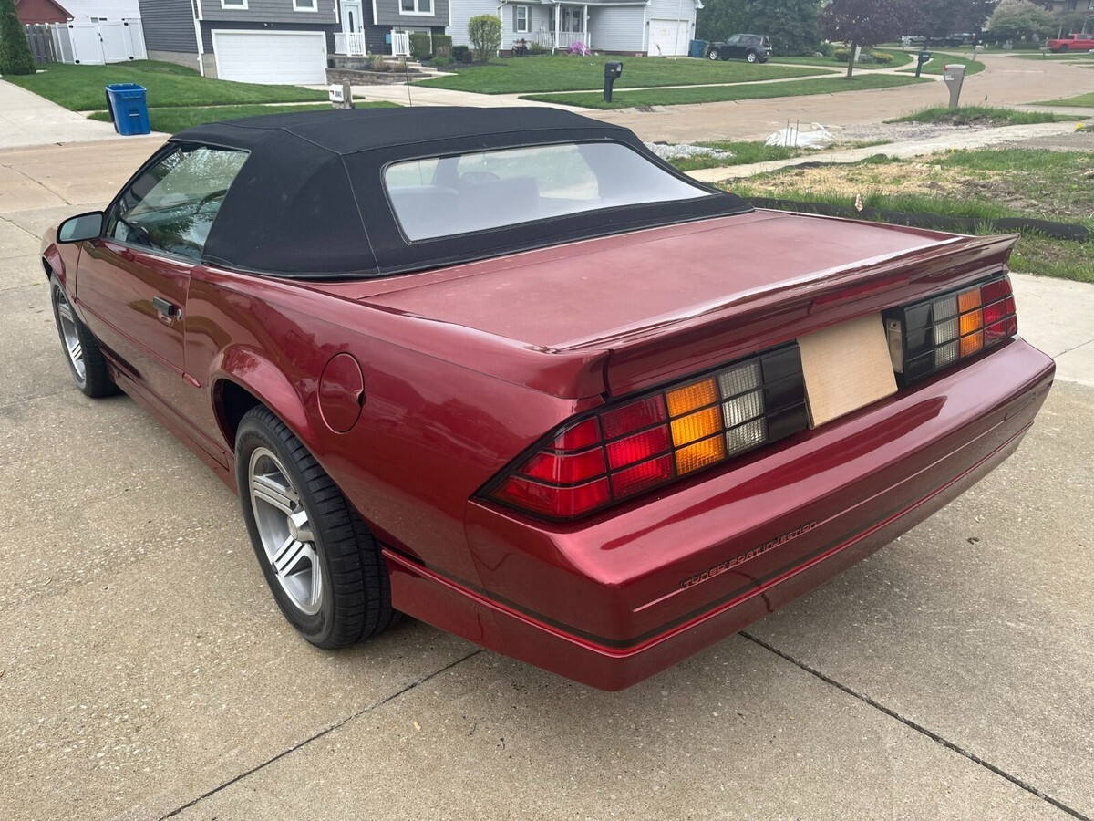 HelloUp for auction is a 1988 Camaro IROC Z Convertible. Comes with a 305-Tune Port engine. When cold outside Engine runs a littlerough when cold. After the engine has warmed up it runs fine. There are 29,000 original miles. But The title states121,000 miles butthat is incorrect. Transmission is a 4 speed automatic.The car is mostly original. It has original convertible top that is excellent condition, Interior is in excellent condition. Cars body is rustfree and Paint is original and in very good condition.Only paint/ body issue is that the trunk lid paint is faded and there is a small 1" scratch on passenger side fender. (See pictures).Exhaust is original from front to back and in good very good condition. Rims and tires are in very good condition...has AC but doesnot work. Will need new hood struts to hold hood up.Braking system works fine. All gauges and lights work. Clear title..Car is sold as is no warranty or guarantees. Car is located in northeast Ohio, and any shipping or costs incurred are the responsibilityof the buyer. We can help load the car.All in all, a very nice car...A non-refundable deposit of $500.00 will be due at actions end within 48 hours.Remaining balance due within 7 days of auctions end.Please do not bid on this auction if you do not intend to follow through with the auction.Any questions feel free to ask. I am listing the car on Ebay for a friend so any questions I will refer back to him.Thank you....Good luck bidding !!!