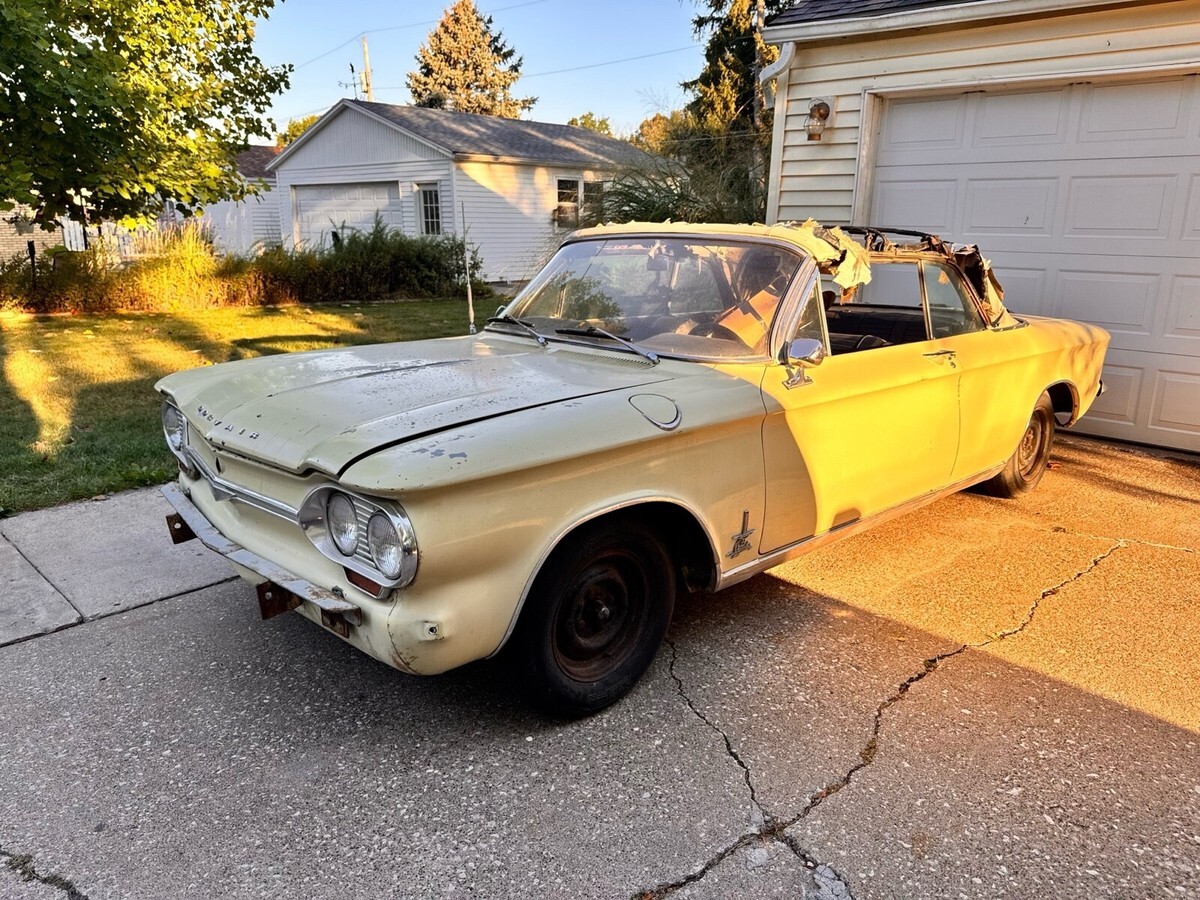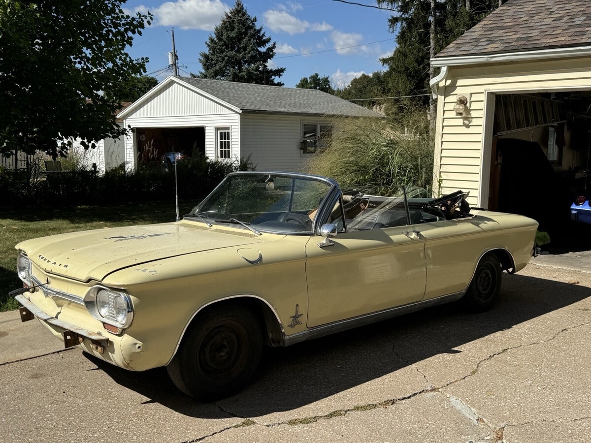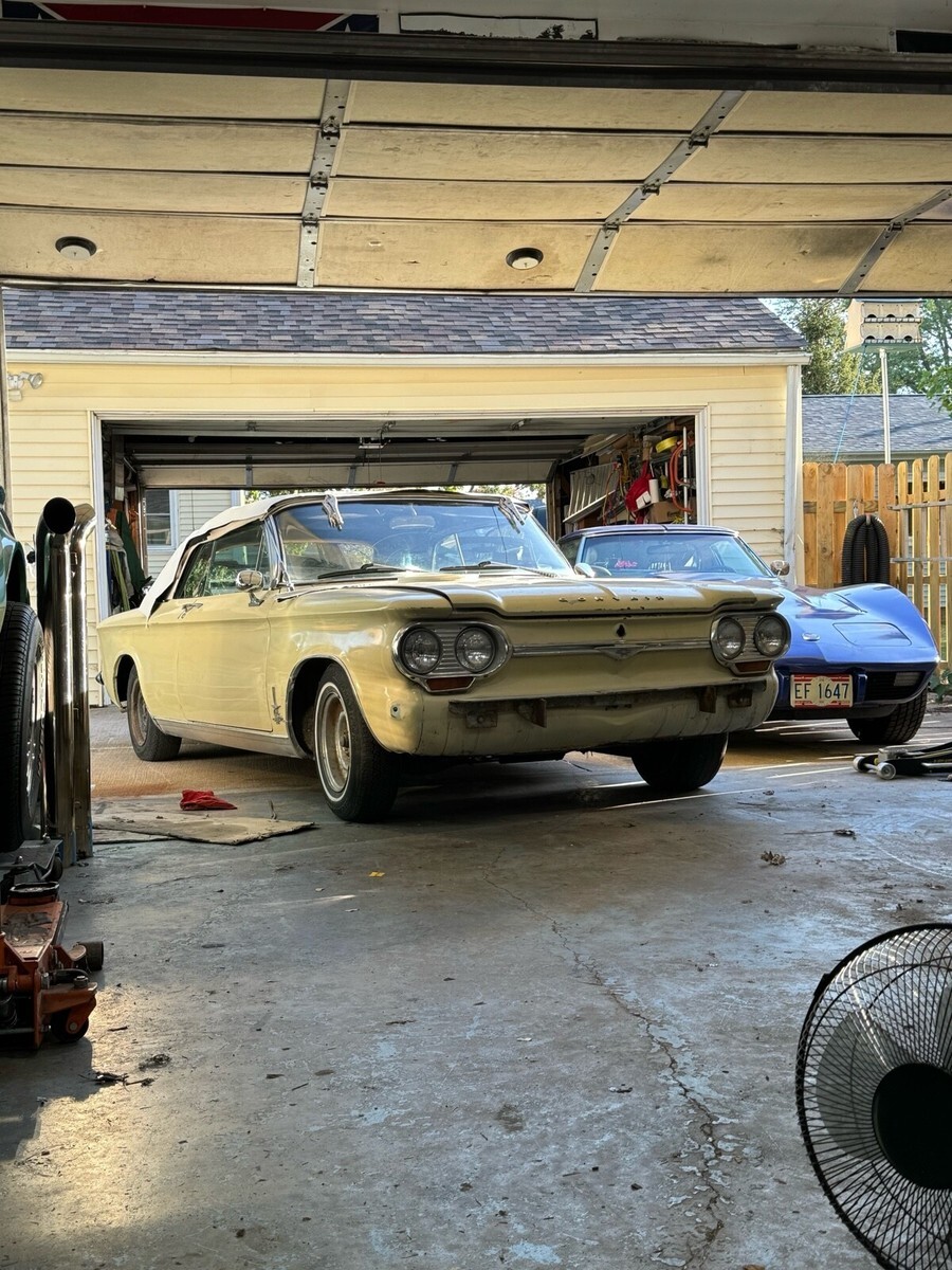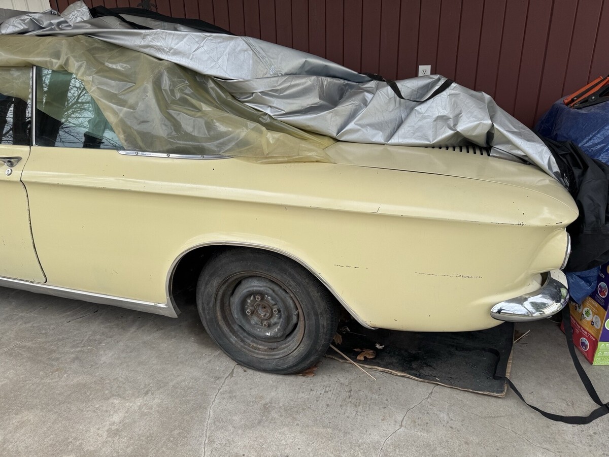 1964 corvair monza spyder convertible. I bought this car two years ago sight unseen with hoping to make a daily driver but once I received it I realized it’s a project car. The car will run and move under it’s own power the transmission works and has good brakes, but the engine has a miss to it and in looking at the ignition system when pulling the plugs I found 3 of 6 cylinders with heli-coils in them and they are lose and not secure. Maybe part of the miss? I have acquired a set of good turbo heads from a gentlemen on the east coast who is an avid corvair guy. I have also got a complete new top kit with rear window pads for it. The body in this car is amazingly straight and rust free the only issues on the entire car are the front floor pans which aren’t to bad could be patched or new pans are available for about $70 each. Seat frames are good material is not maybe driver quality while fixing up. This is a rare turbo convertible early style which I think look much cooler then the late style with the Camaro look. Car has a clean IL title in my name. I have acquired some missing parts for it and replacement parts all come with it. I just don’t know when I’ll get to it.