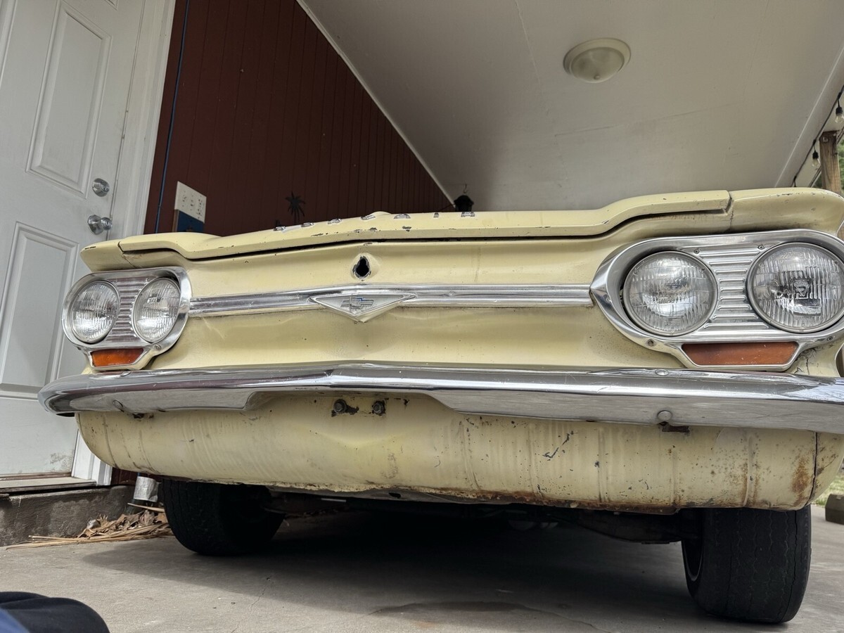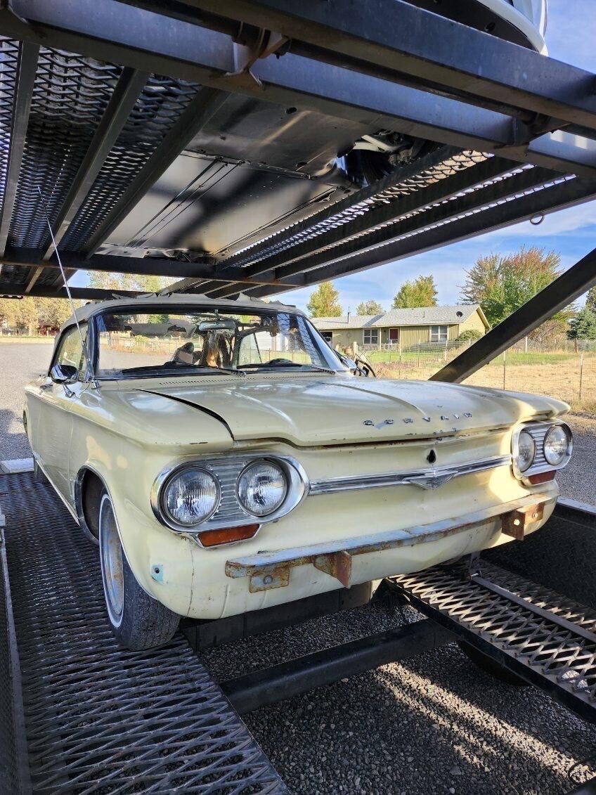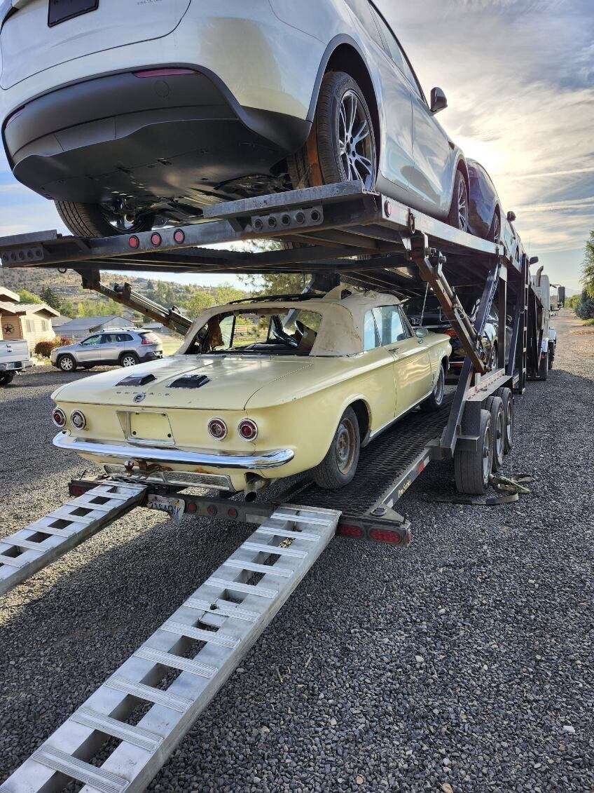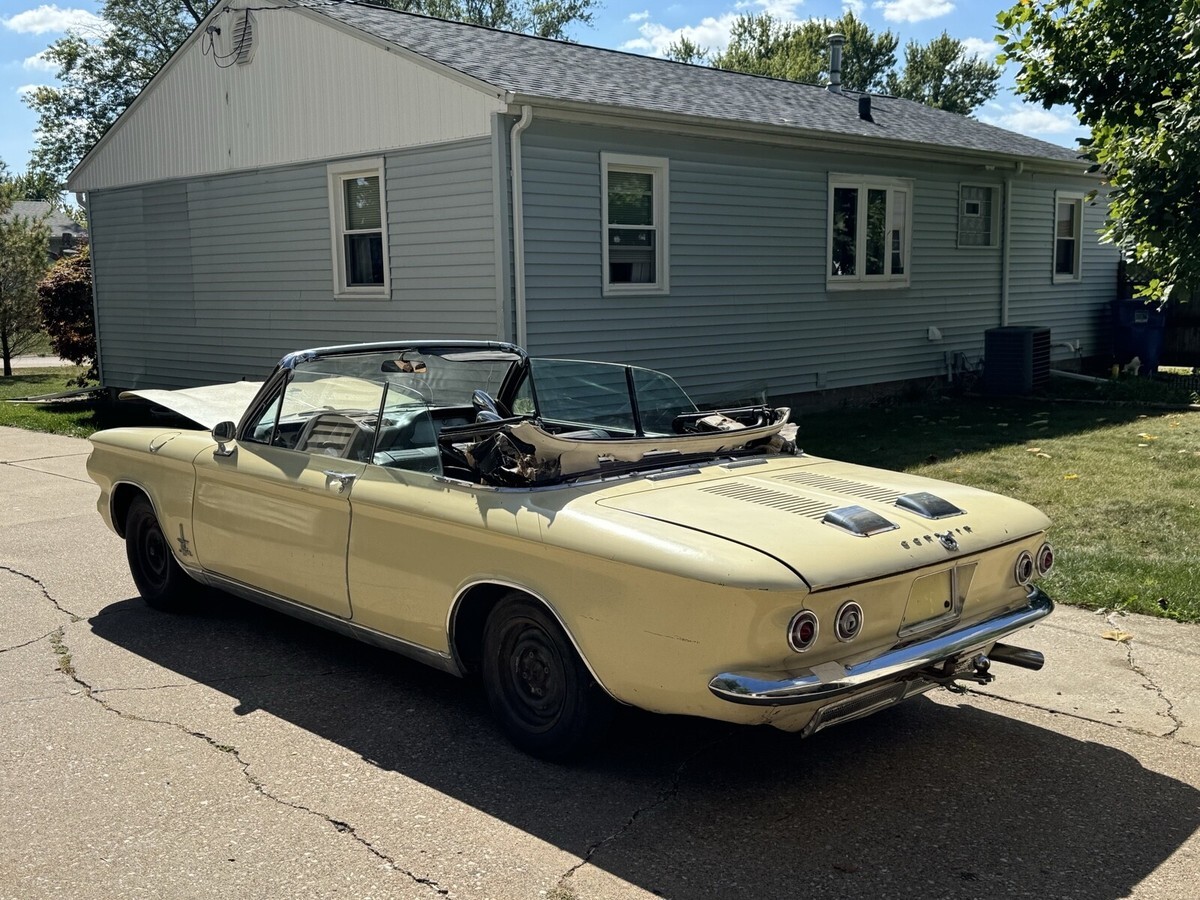 1964 corvair monza spyder convertible. I bought this car two years ago sight unseen with hoping to make a daily driver but once I received it I realized it’s a project car. The car will run and move under it’s own power the transmission works and has good brakes, but the engine has a miss to it and in looking at the ignition system when pulling the plugs I found 3 of 6 cylinders with heli-coils in them and they are lose and not secure. Maybe part of the miss? I have acquired a set of good turbo heads from a gentlemen on the east coast who is an avid corvair guy. I have also got a complete new top kit with rear window pads for it. The body in this car is amazingly straight and rust free the only issues on the entire car are the front floor pans which aren’t to bad could be patched or new pans are available for about $70 each. Seat frames are good material is not maybe driver quality while fixing up. This is a rare turbo convertible early style which I think look much cooler then the late style with the Camaro look. Car has a clean IL title in my name. I have acquired some missing parts for it and replacement parts all come with it. I just don’t know when I’ll get to it.