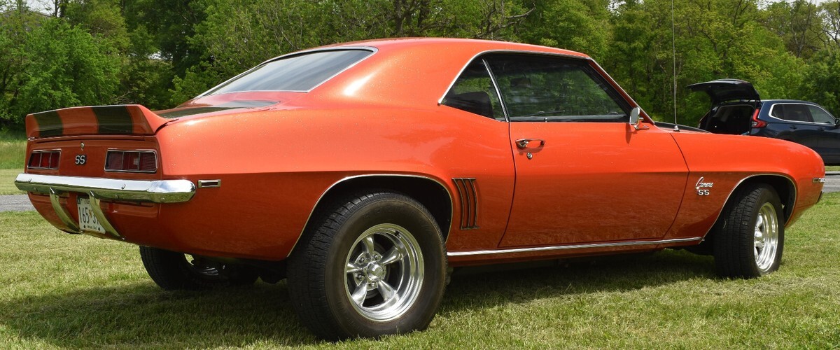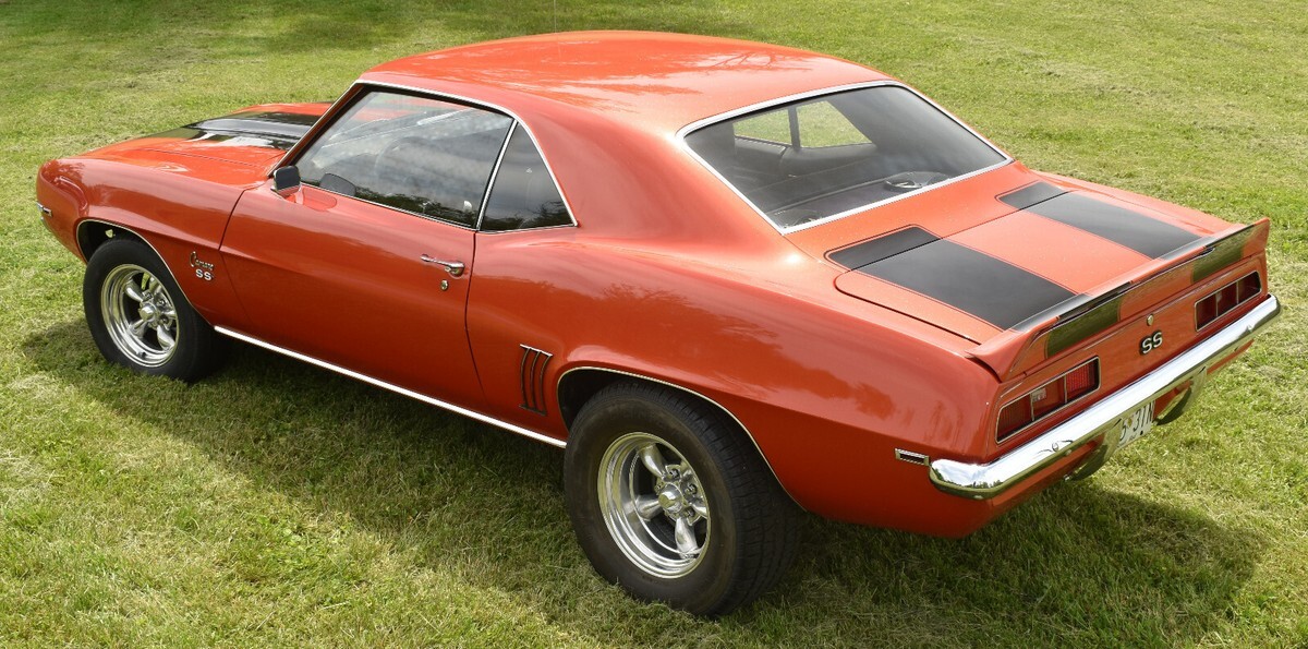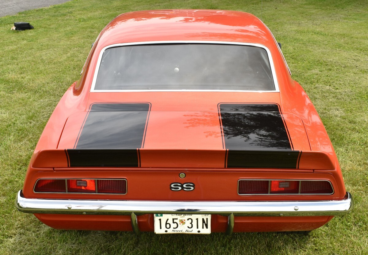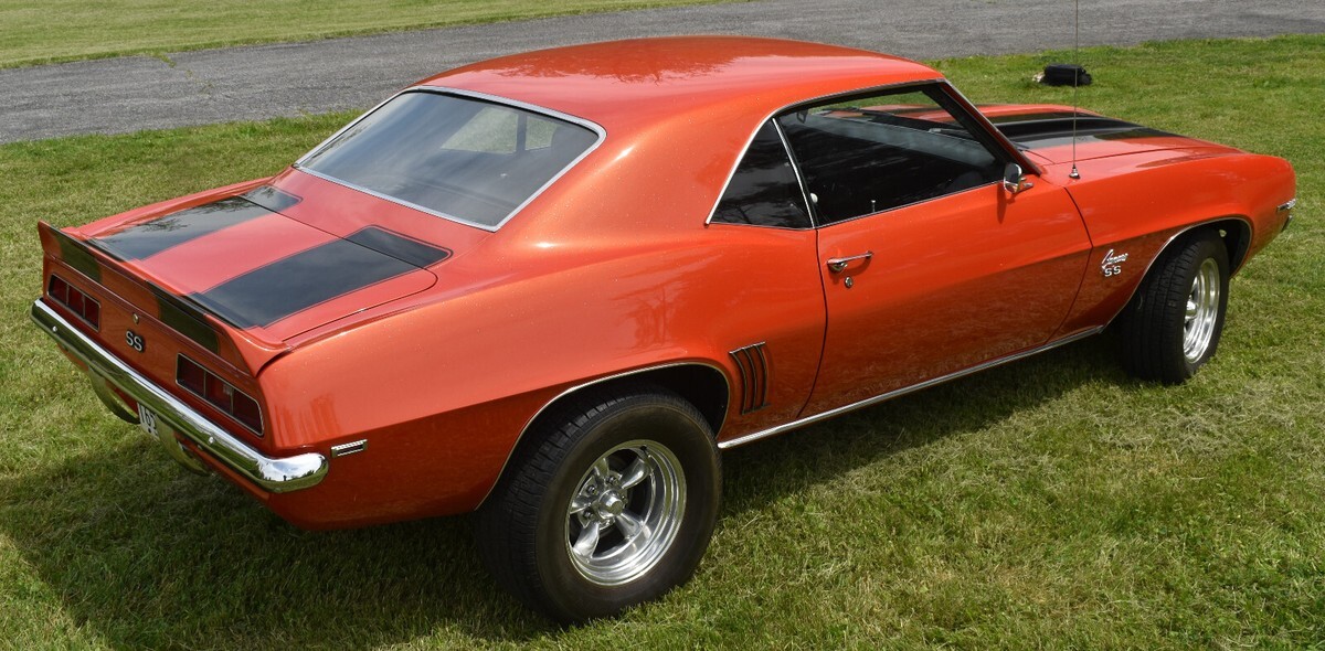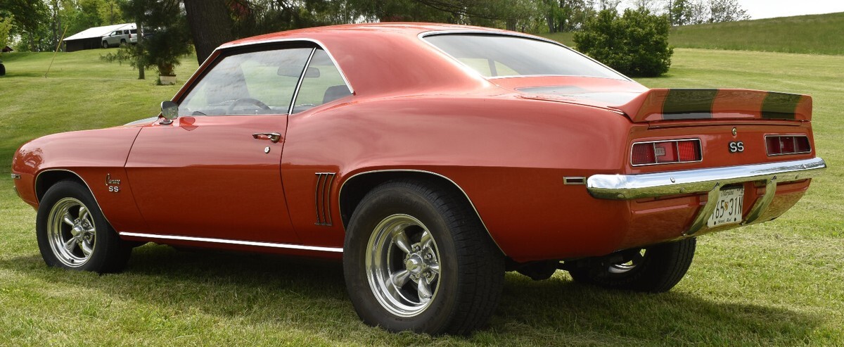 Body & paint: The 3-stage urethane paint work is a 2010 Chevrolet Camaro “Orange Inferno” with metalflake added. You will also notice the black stripes are under the clearcoat for a smooth finish. New complete rear quarter panels, hood, front fenders, inner fender wells, door skins, rocker panels, cowl, front windshield, and side glass were added. Floors are original and solid. There is no evidence of rust or bubbling. Chrome is excellent and new window “fuzzies” were added.