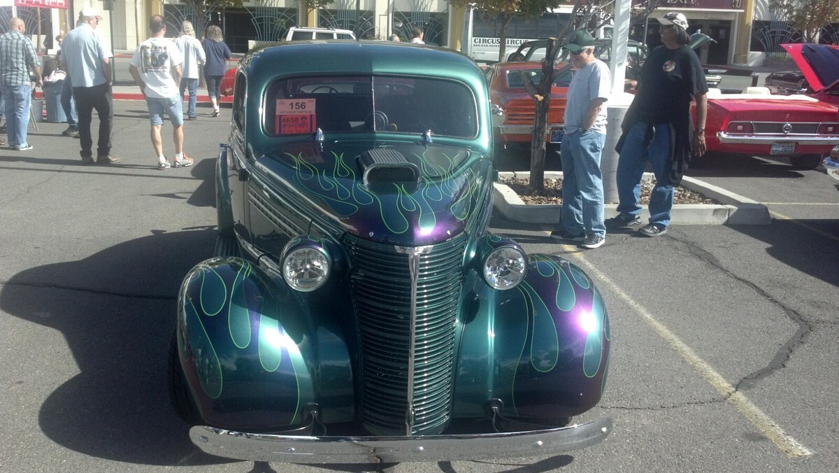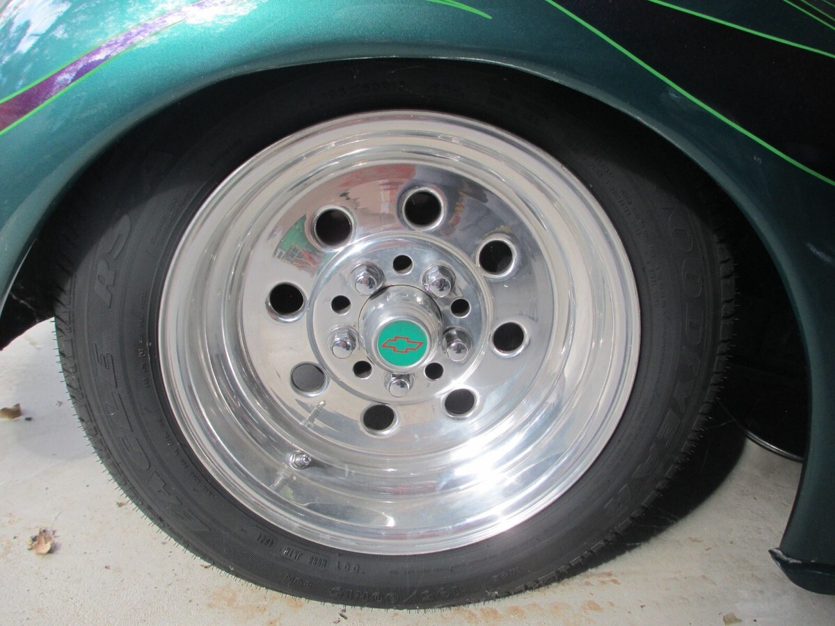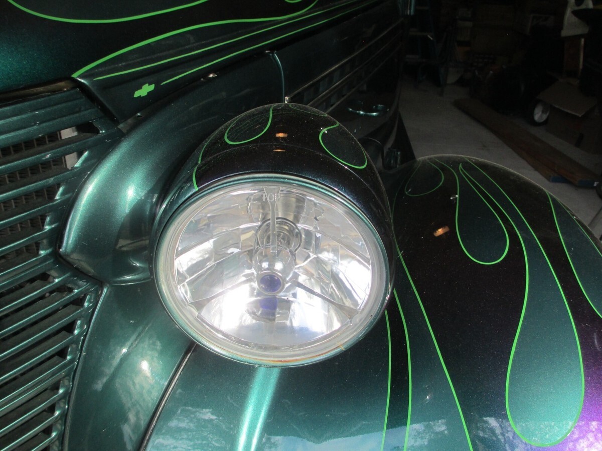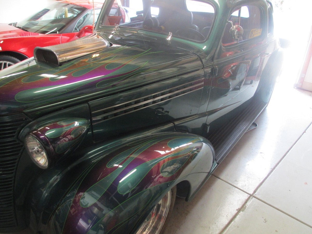 This 38 Chevrolet is a great choice for a street rod/Hot rod for the spring/summer months ahead of us. This car has so many extras something will be missing. The car drives well and very beautiful with the ever changing chameleon flames with trophies being awarded. The 38 is equipped with an independent front end with all wheel disc brakes and a 4 link rear end with a limit slip 4:11 .This is a fun car with great performanc, looks and sounds great! (LAST CALL $35,000 BARGAIN!!!) THE LOWEST GUARENTEED!Big Oak Valley California 95977Exterior Color: Green /Chameleon flames/pin stripedFinished in Green and stunning chameleon flames with pin stripes. All chrome and running boards are near perfect. THE 38 IS ALL STEEL with the exception of the hood and if you must have all steel it's included as well. The right front fender has two tiny dings on top and the top has one small flaw. EXTRAS INCLUDED.......New front bra, ca custom car cove, clam shell HOOD without scoop cutaway is all STEE, .Hood illustrated on car is fiberglass, chrome wheelie bars, extra 3rd member rear end.. Extra boxed perfect stainless GrillInterior Color: Two tone greyTwo tone grey leather on seat, door panels and gray felt headliner. Custom leather wrapped steering wheel with tilt and California custom stereo. Custom "V" groove windshield, fully tinted with electric windows. Dash is green with custom gauges with aluminum bezels. The carpeting is showing some discoloration. Very nice functional performance auto interior and no tears.8cyl 454 modified Big Block ChevroletOriginal Engine: NoHO crate engine modified with custom Comp ground gear cam kit and Tunnel Ram manifold with twin carbs complemented with MSD ignition and gear drive. The majority of the engine work was completed by a local well known race and exotic car shop " Intrepid Racing". The engine heads are large port rectangular ports. The engine is complemented with polished billet aluminum accessories and aluminum radiator. The trans has a stall converter for smoother launches The exhaust has performance headers and Flowmaster mufflers and sounds great.Mileage History2,050 MilesTo the best of your knowledge, is this mileage accurate? NoThis car has only been driven in the Spring/Summer months to car shows and rod runs. This striking car is covered in the enclosed garage in the winter.Wheels, Tires, and Brakes15" Crager Aluminum wheel (4) and Mickey Thompson (rear) and Good Year (front).Brakes are all DISK (4)TransmissionAutomatic400 with stall converter and competition shifter