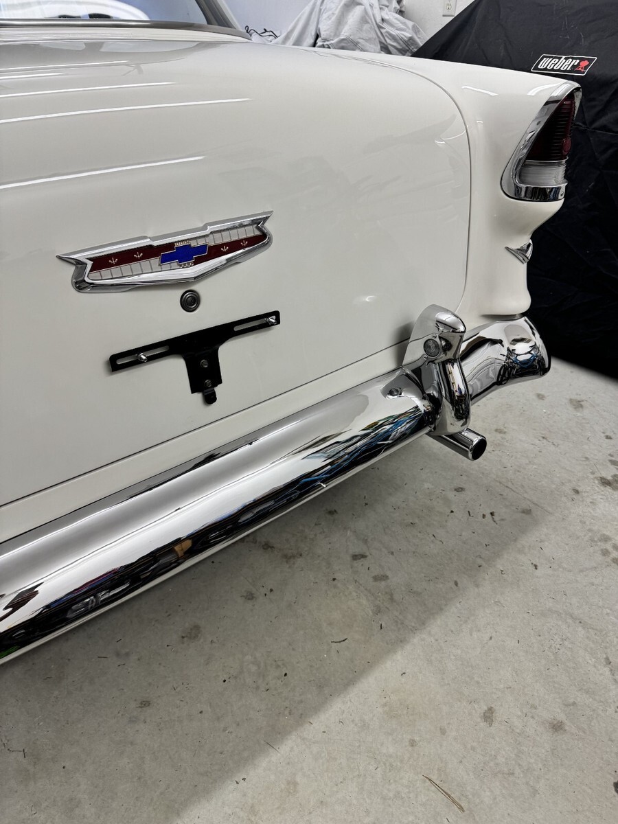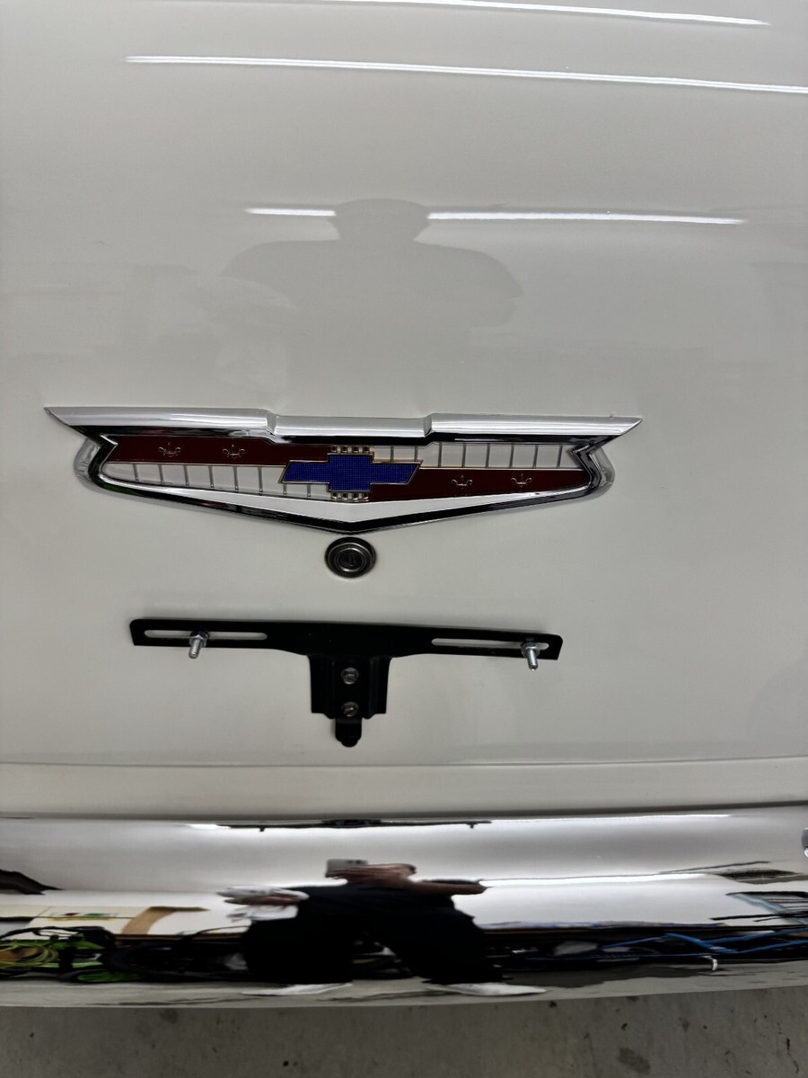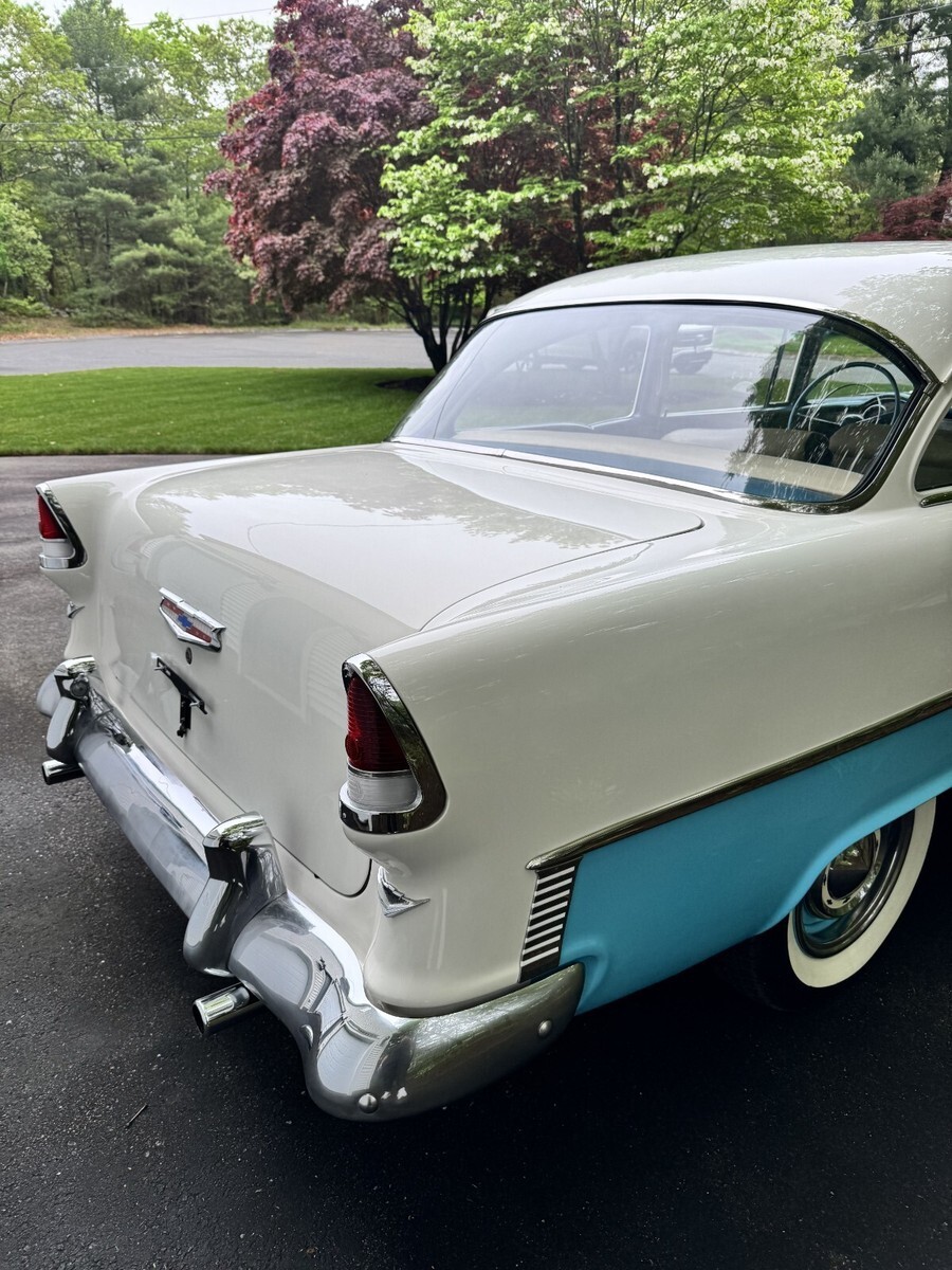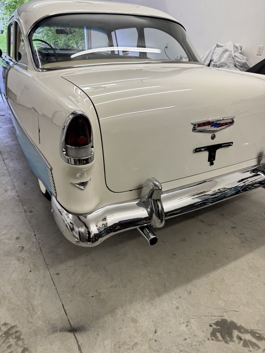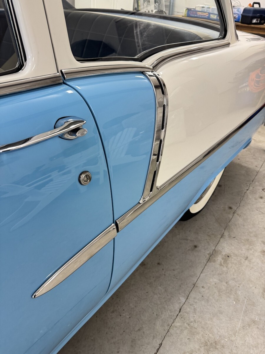 Walk-around in wordsA true Tri-Five icon, freshly finished in 2020 after a nut-and-bolt rotisserie restoration by a well-known Chevy specialist. The car wears a crisp two-tone blue & white (India Ivory over Cashmere Blue) exterior with mirror-straight panels and show-quality chrome. All stainless trim has been polished; every emblem is NOS or better. Floors, trunk pan and frame are as clean as the topside.