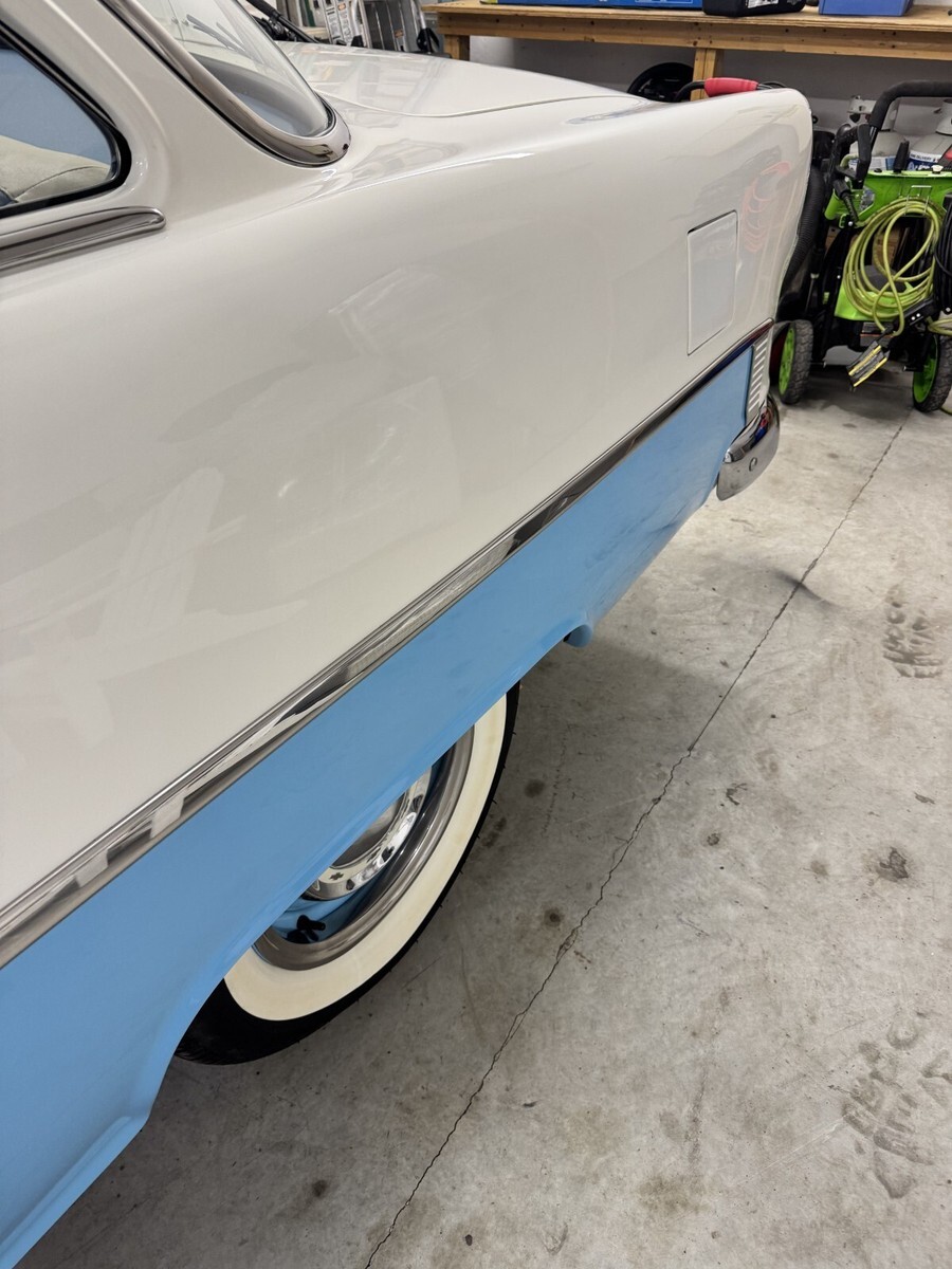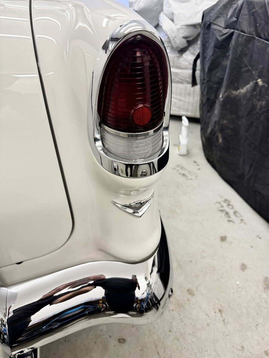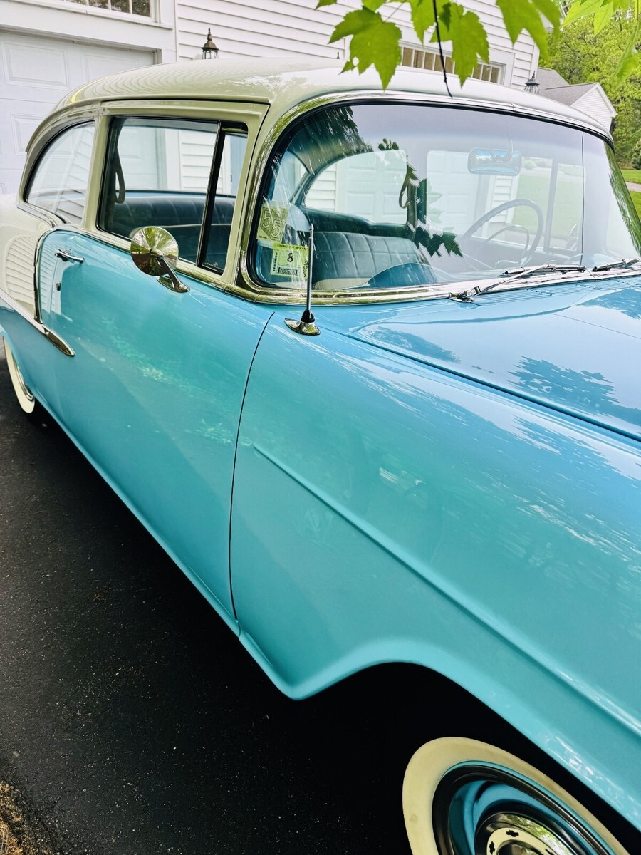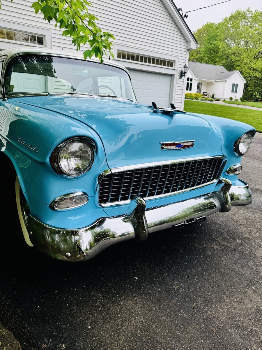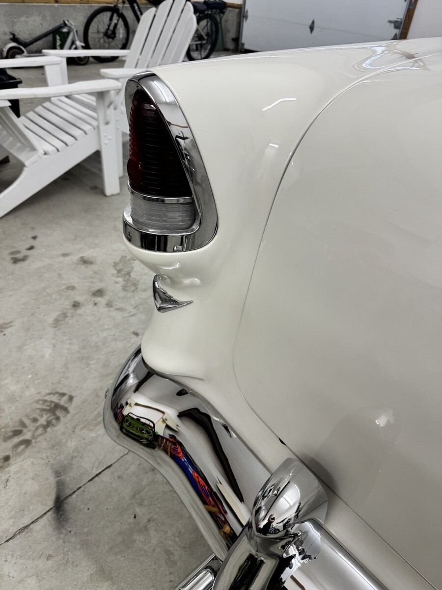 Walk-around in wordsA true Tri-Five icon, freshly finished in 2020 after a nut-and-bolt rotisserie restoration by a well-known Chevy specialist. The car wears a crisp two-tone blue & white (India Ivory over Cashmere Blue) exterior with mirror-straight panels and show-quality chrome. All stainless trim has been polished; every emblem is NOS or better. Floors, trunk pan and frame are as clean as the topside.
