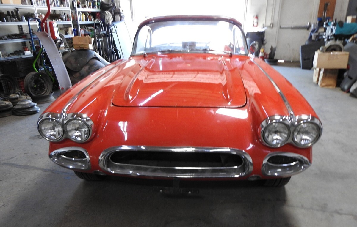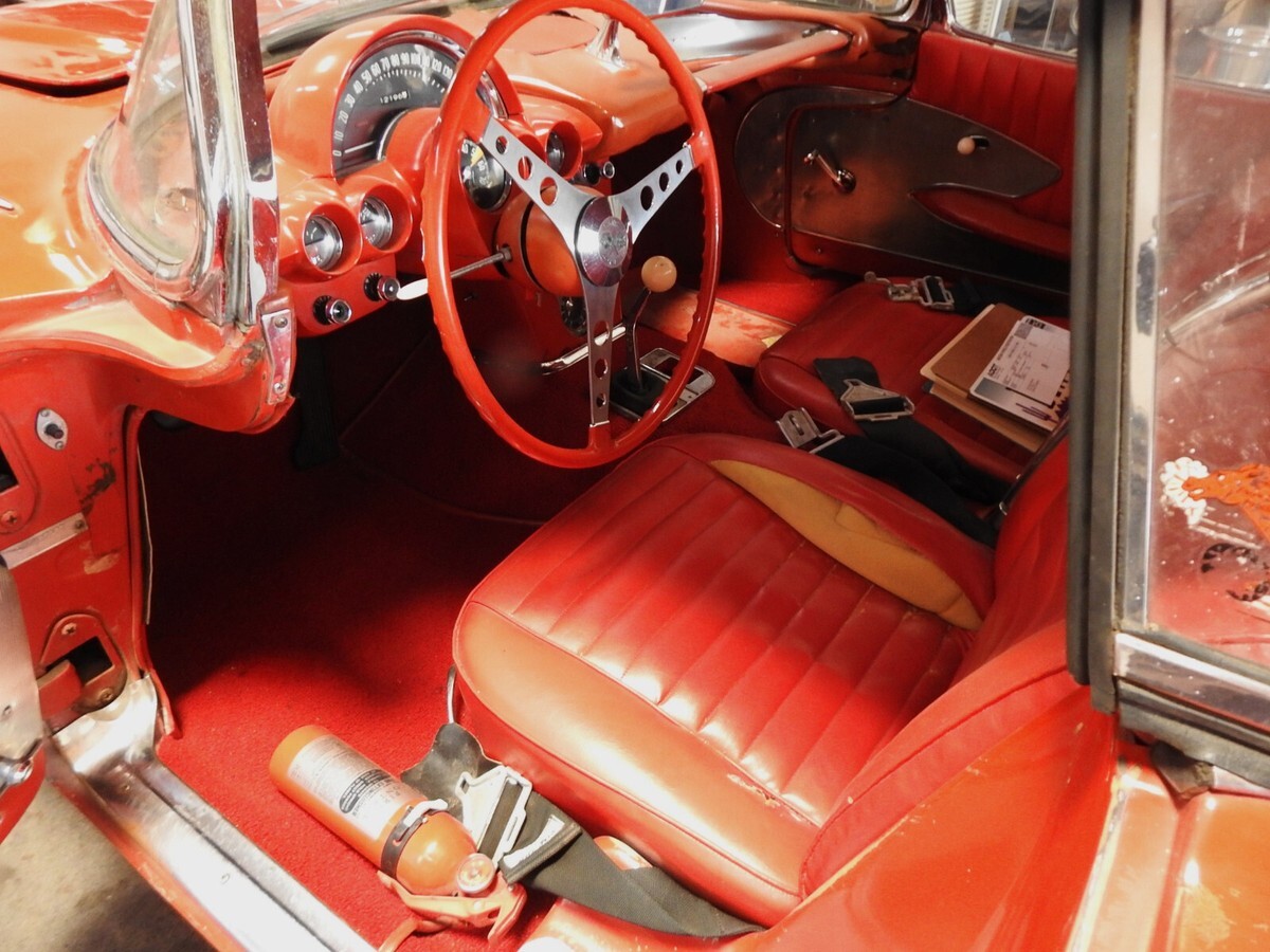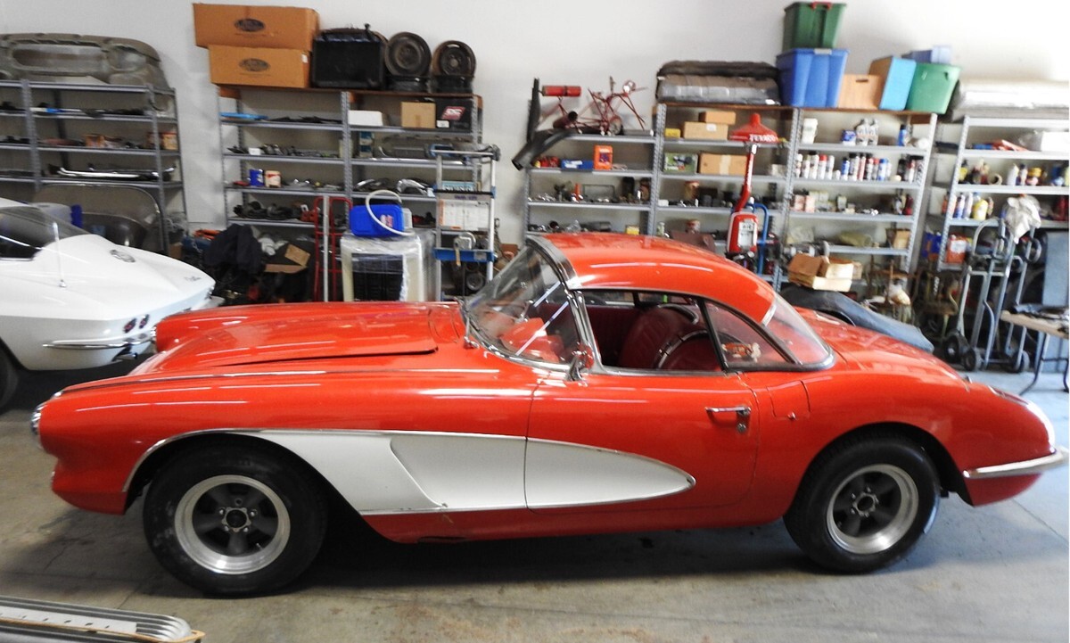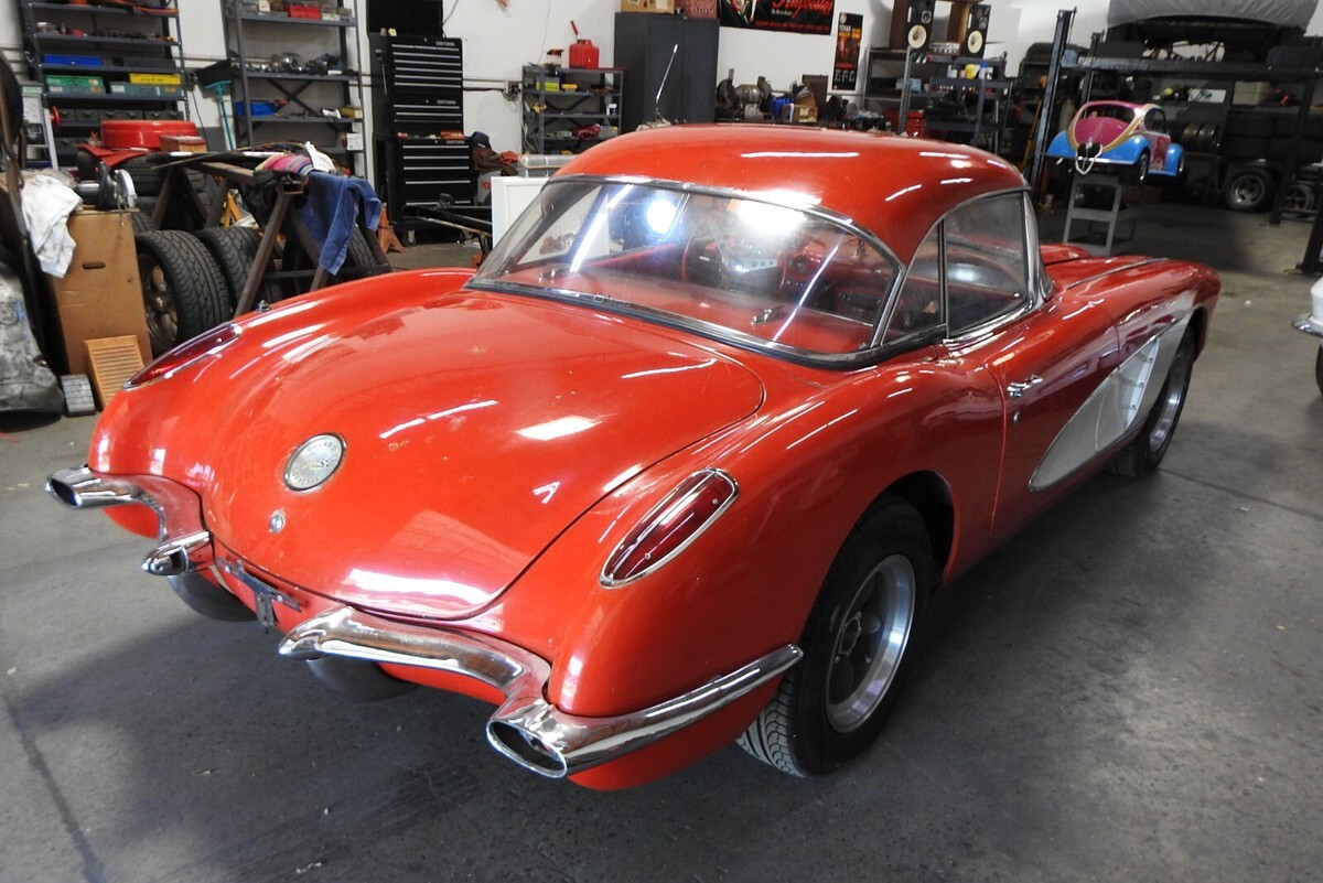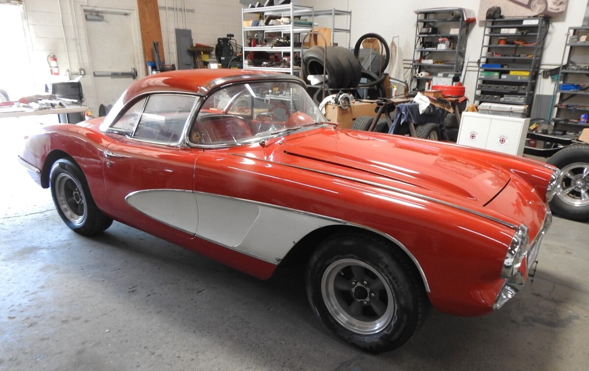 1959 Corvette Estate car. Previous owner bought the Corvette in July 1987 and the original engine had expired so he found a correct replacement 283 and put the fuel injection on that engine. It is the correct '59 injection ending in 7200 as shown on the tag on the plenum. (70172000 is standard camshaft injection for 1959). The Vette retains the original BW T-10 four speed aluminum transmission with a Hurst Competition Plus shifter replacing the sloppy stock shifter. Stock original steering wheel. Seats had been recovered some time ago and the driver's seat has a split as seen in the photos. Original instrumentation. It has the original removable hardtop and also has the soft top bows and mechanisms but needs to be recovered. At one time in the '70s the front end was "Shark Nosed" as they referred to the procedure, where the inset part of the front end where the bumpers set into was put together basically deleting the front bumpers. I have an NOS GM replacement front end shown in photo no. 29 to bring the Corvette back to original. And the trunk is filled with NOS and original replacement pieces shown on the table photos and the photo of the bumpers, brackets NOS quarter 'glass' for the hardtop, etc. The wheels at all four corners are original 15 x 7 American Racing aluminum 5 spoke Torque Thrust wheels with Pirelli radials mounted on them. No power steering, drum brakes. The last photo shows a place at the bottom of the body that has a split in it that needs attention. The Corvette has been sitting for about 6 years. I put Marvel Mystery oil in each cylinder and turned over the engine by hand each day about a quarter of a turn to make sure everything was free inside. Put a new battery in the car and it spun right over. The next day I shot some fuel into the injector plenum and the Vette fired right up! The rear end is not a "P" case posi unit. The car has been sitting, inside storage for some time and will need attention to the fuel system, belts and hoses, cooling system, etc. before it can move on down the road. Always a Southwest car so no rust issues on the undercarriage. There are some minor flaws in the body but nothing major. And, after all it is a '59 Fuelie Corvette.....