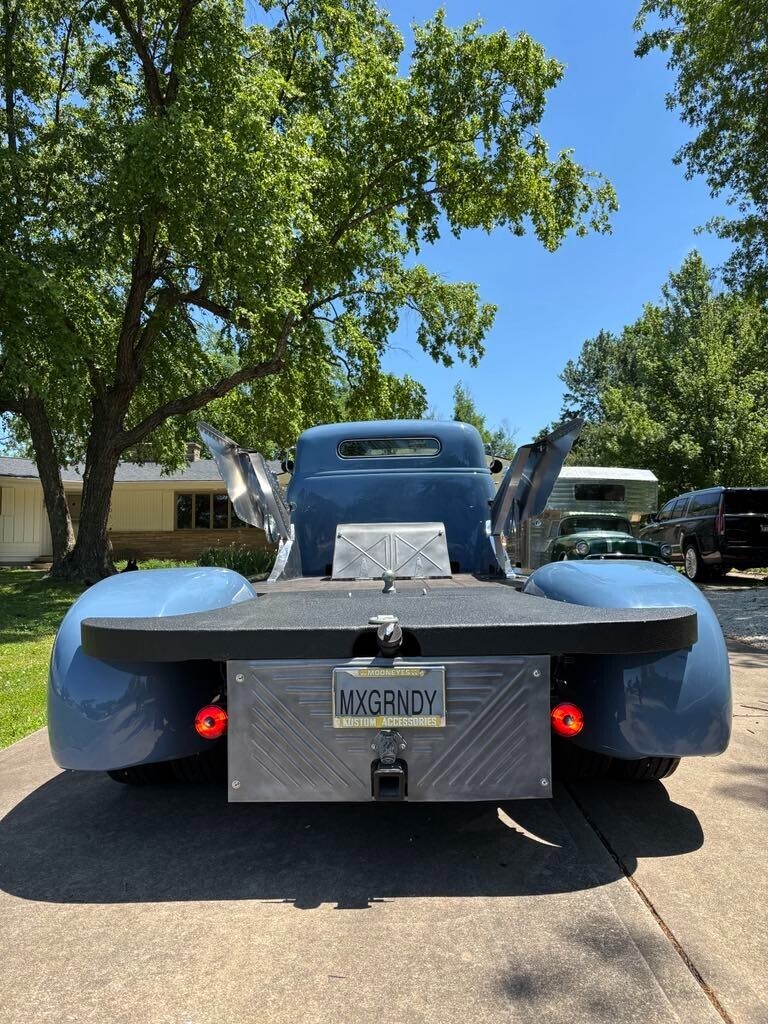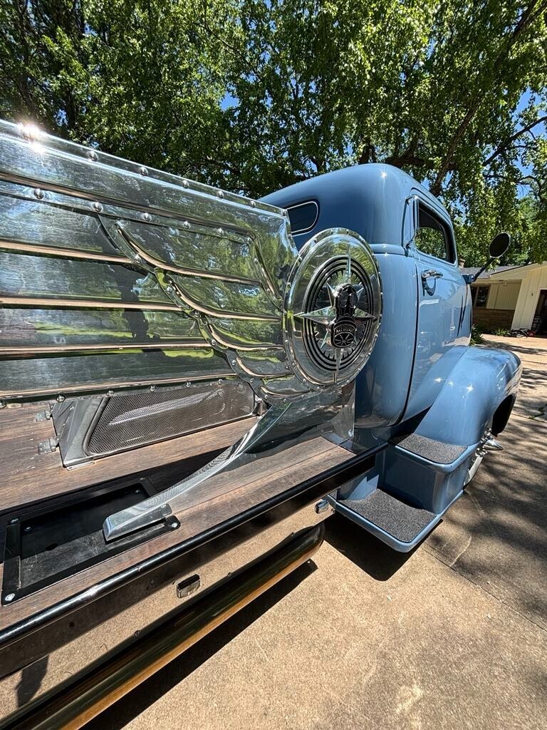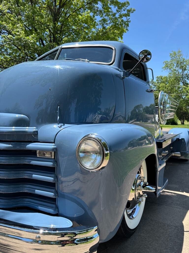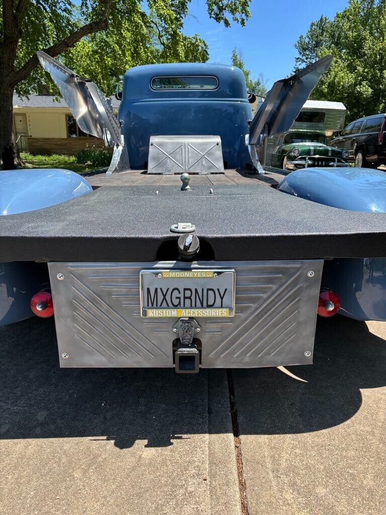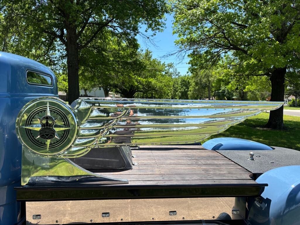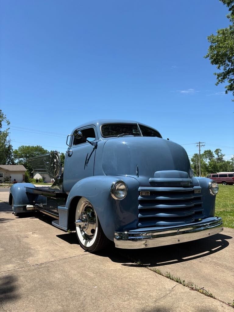 Candy1952 Chevrolet Cabover dually truck *496 Chevy big block (out of 2003 Chevy suburban). Professionally tuned. *2000 Chevy motorhome chassis front and rear disk brakes *brand new aluminum radiator *A/C and heat hooked up. *Sound deadening insulation installed on walls and floor of cab. *Handmade 8’ long polished aluminum wings. Over 200 hours of fab in wings alone. *16” custom made aluminum “builder badge”. Largest ever made by BILLET BADGES in Southern California. One offs. *Distressed Leather (baseball glove) interior. *Late 60’s Chrysler bench seat with fold down armrest and drink holders. *Custom dash gauges satellite speedometer. Laser level gas gauge. *Polished stainless steel simulator wheel covers. *custom solid hardwood bedwood. *Custom engine cover made from 1950 Chevy truck window frames. Lights up with red LED lighting. *custom rear “floating fenders” made from 4 separate 1950 Chevy truck rear fenders. *Paint custom mixed “Loyalty blue” by Max Grundy and sold exclusively by revolt paint company first in Max Grundy paint line. *Top chopped 6” *Custom made laser cut step pads. Coated in Line X. *Rear custom steel flatbed. Hand fabricated. Covered in Line X *LED taillights *Original style ultra bright headlights *Operational windshield wipers. *Custom one-off 19.5 high mileage wide whitewall tires. Less than 200 miles since installed. *Power steering *Power disk brakes *Automatic transmission. BandM shifter. Custom steel center console. *Custom made “shallow” glovebox. *Extra loud air horn. *wing window deleted and custom one-piece side glass installed. *Custom made leather door panels *Black custom made carpet kit. *2000 Chevy Dually rear end. *All four fenders undercoated. *Brand new battery *Custom made steel bed sides.