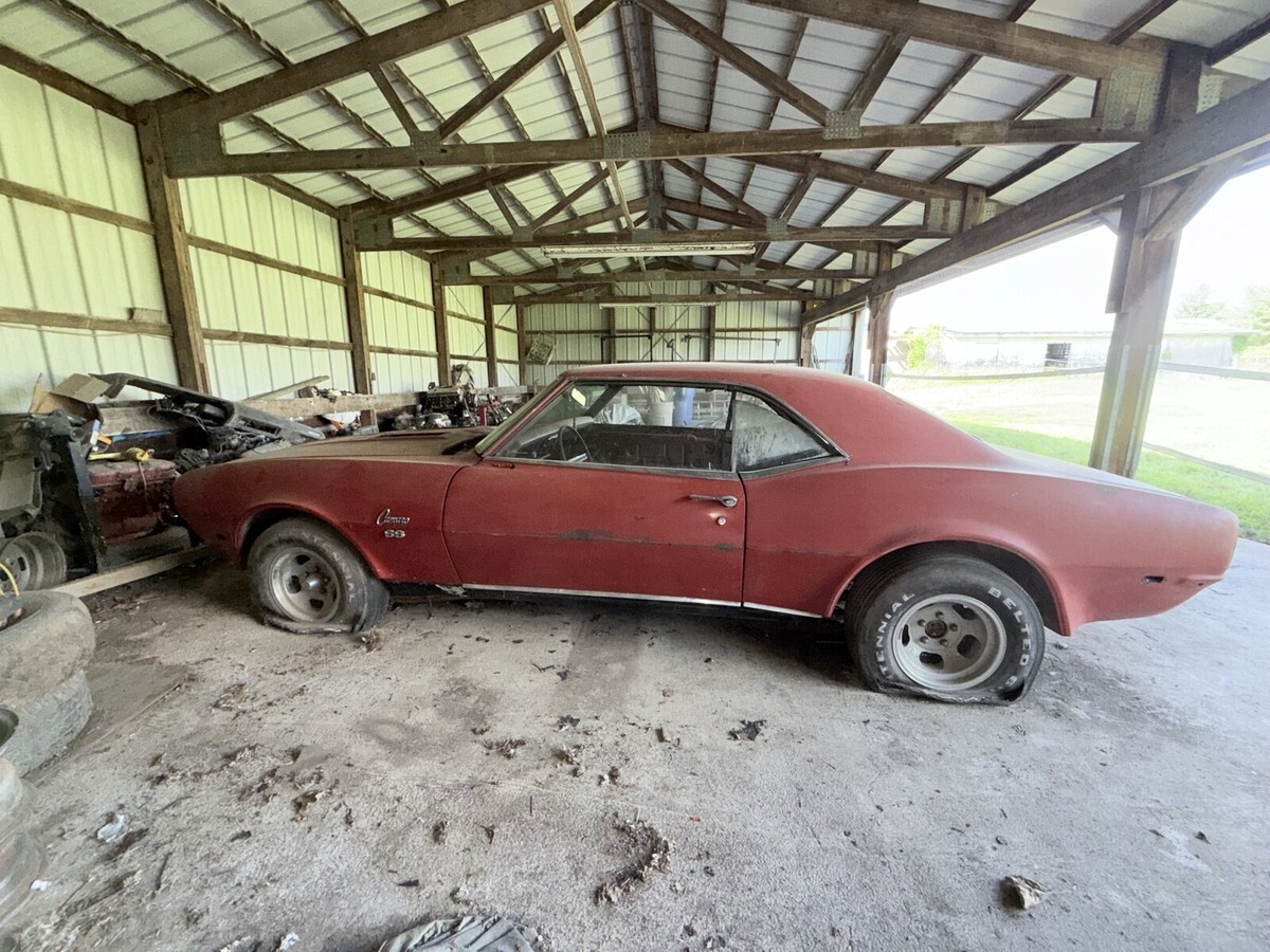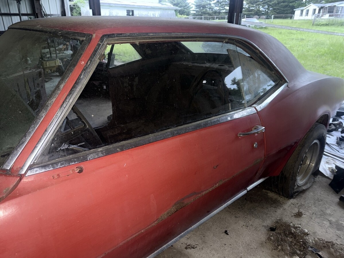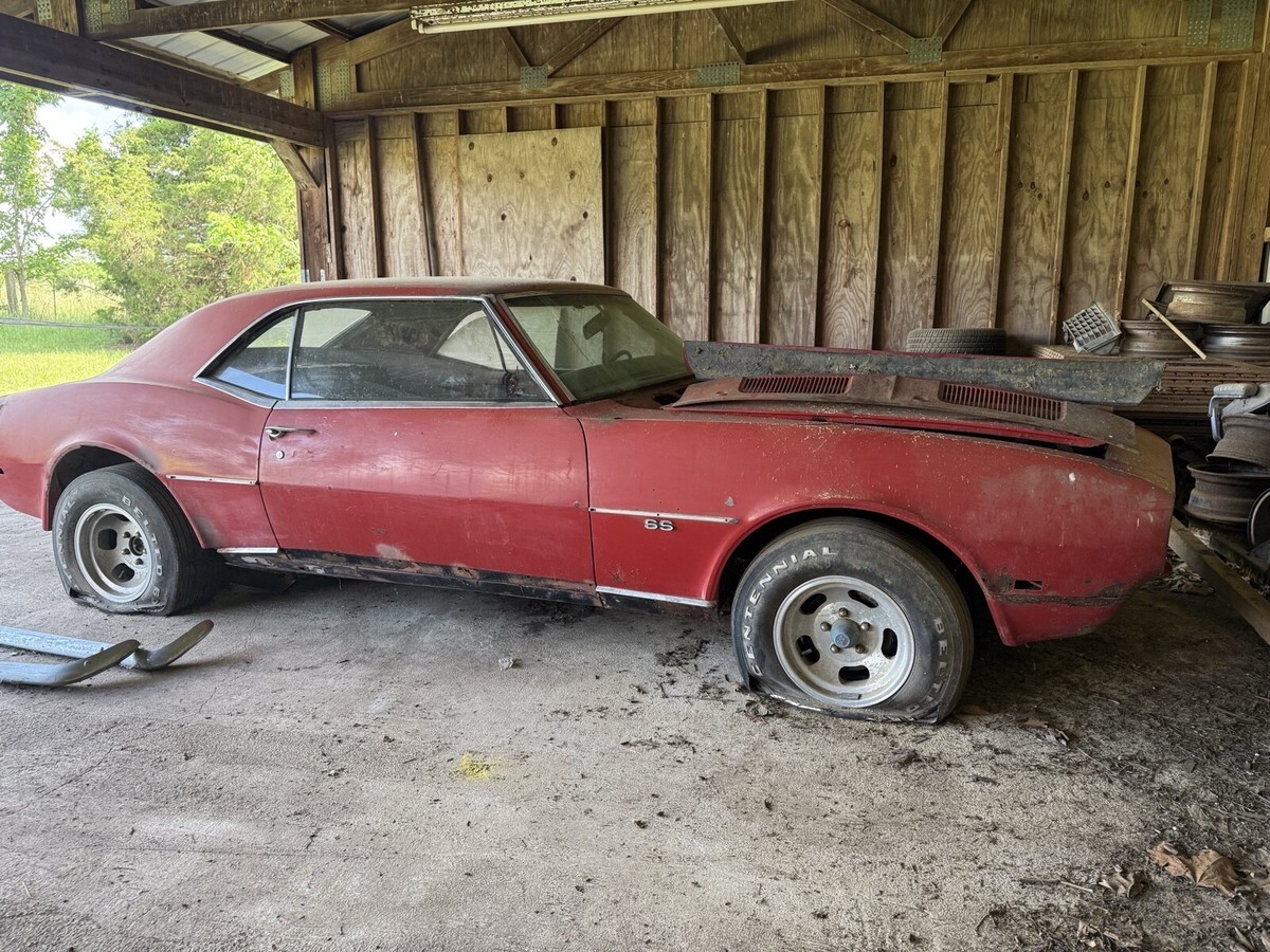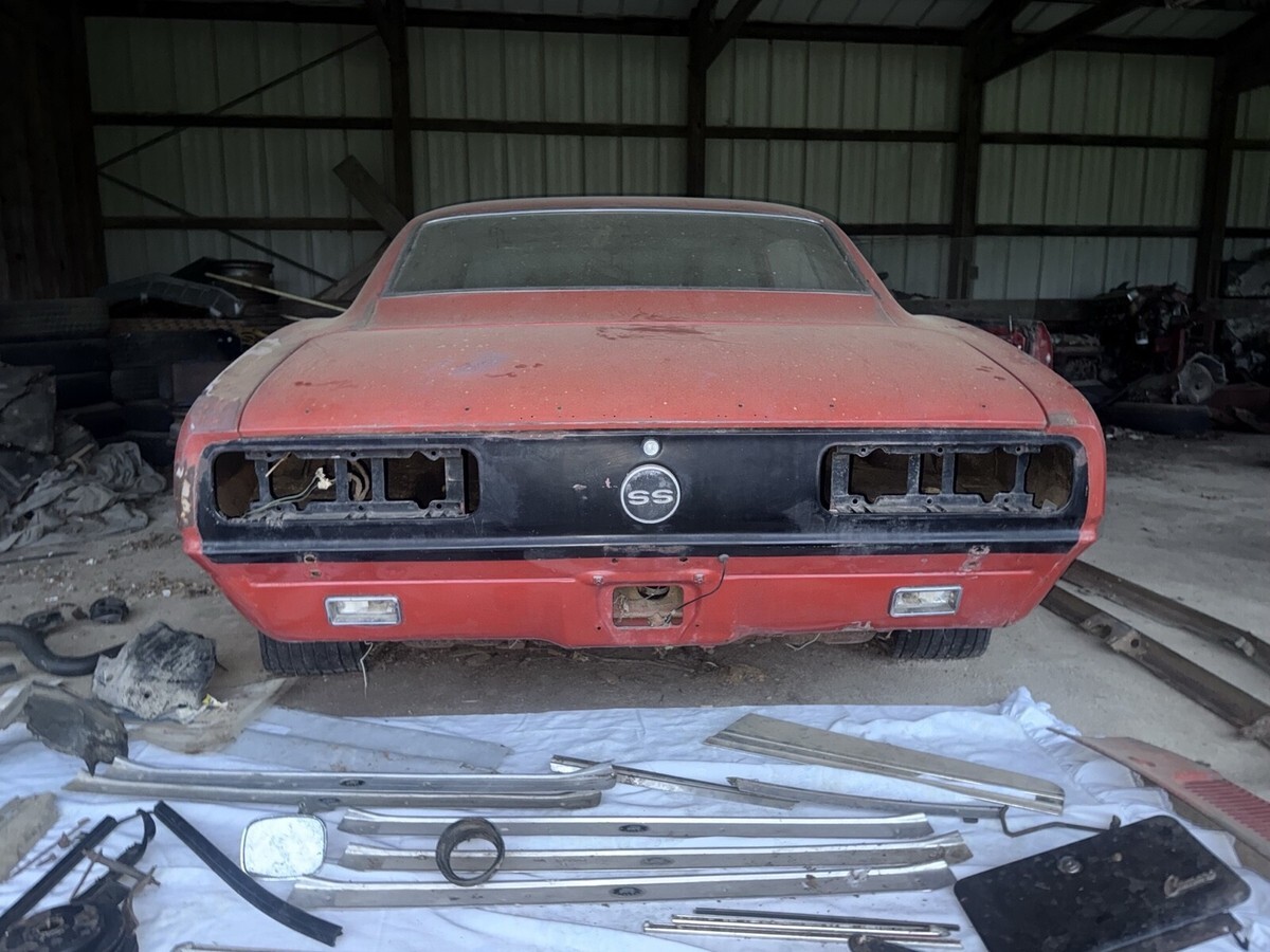 TRUE 1968 RS/SS 396 4 speed Chevrolet Camaro. In pieces. Everything there but rear taillight bezels. Power steering, bucket seats (all stored inside) console. Chrome package. Matador red original color. 12 bolt main. Good glass.