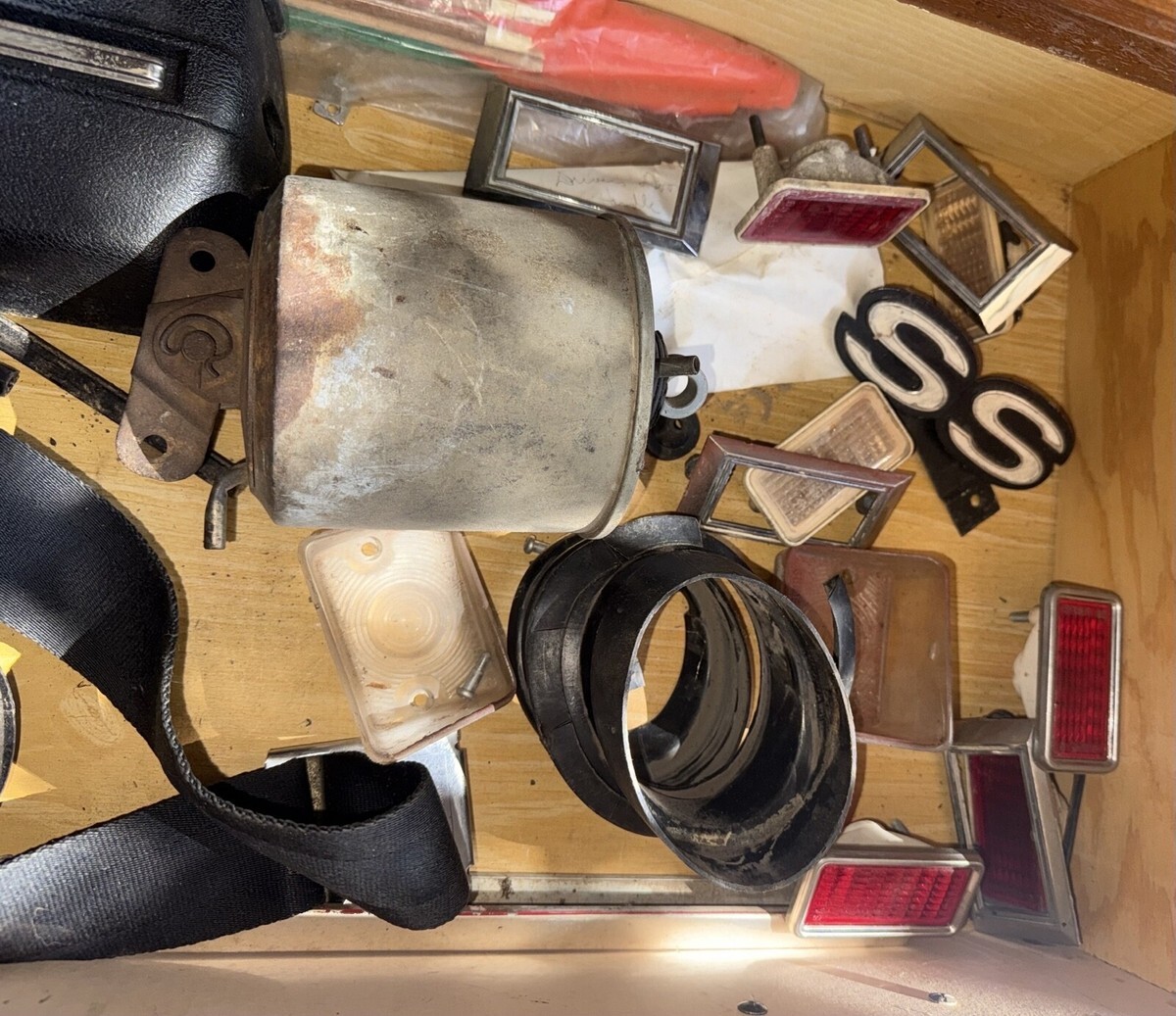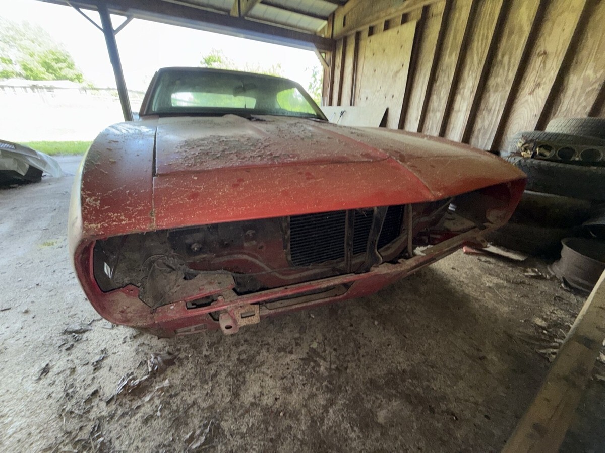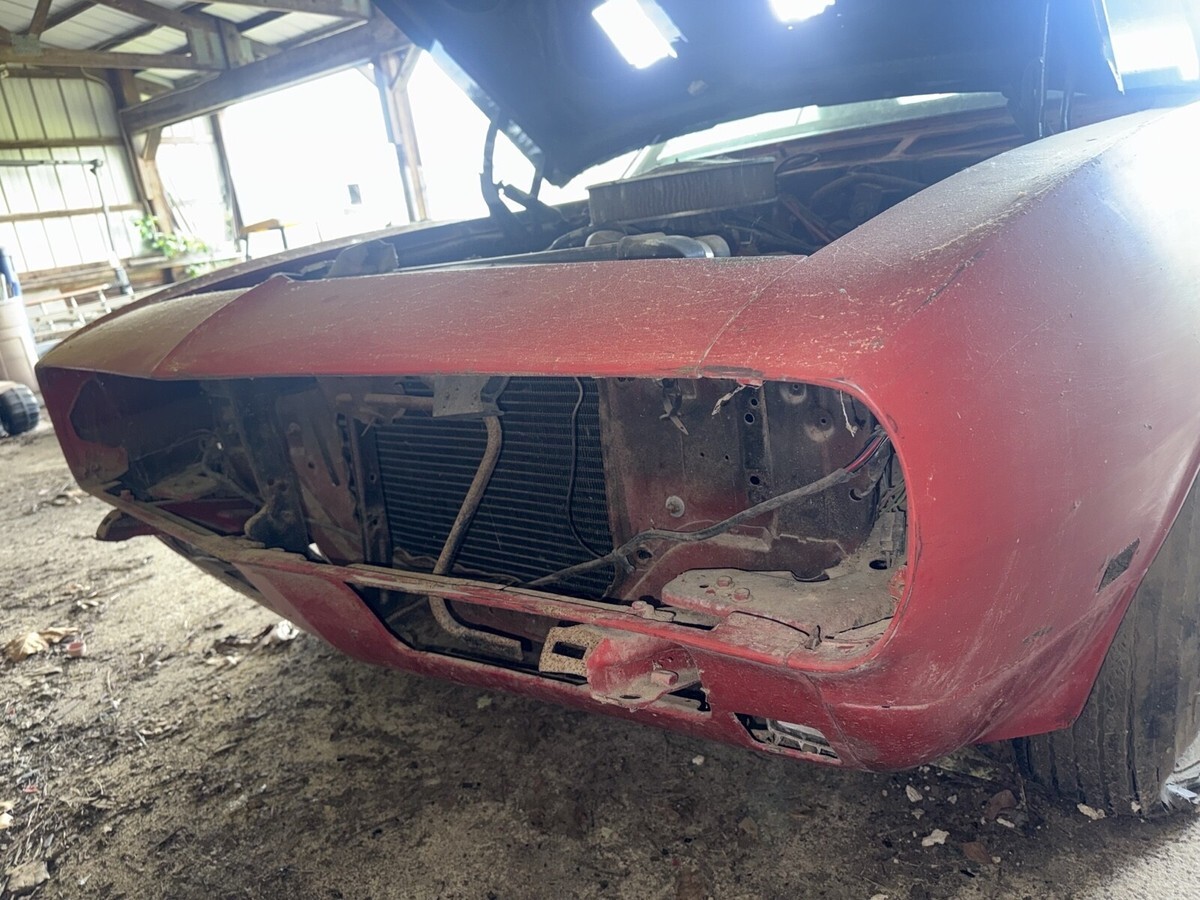 TRUE 1968 RS/SS 396 4 speed Chevrolet Camaro. In pieces. Everything there but rear taillight bezels. Power steering, bucket seats (all stored inside) console. Chrome package. Matador red original color. 12 bolt main. Good glass.