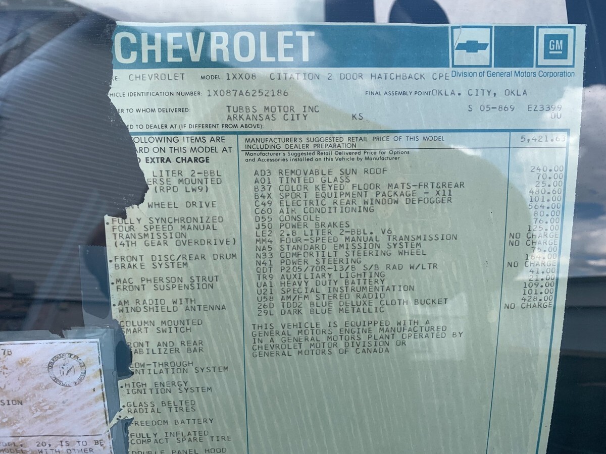 - do a quick search on BARN FINDS low milage chevrolet citaion X11. this is the car. I bought with 2700 miles and put it back on the road. new tires, fuel line, brakes done new gas tank, new head gaske, new a/c compressor. the list goes on. I wanted to be road worthy and safe. and it is... The car was originally owned by racer CLIFF GOTTLOB (google him with L88) i have truley enjoyed this car always wanted one since college 1980. Anyway i'm thinning the herd, just too many already sold 4 cars... if you are an x11 fan this car is special. tons of documentaton... i have original shifter handle with cables, and original sport steering wheel with rebuilt original carb, i prefer the weber on car now, this thing moves. no cat required in nj, so picked up 20hp by dumping that clogged pos... it is optioned out ..so many trips taken down to jersey shore. a/c power steering sunroof radio. just a fun comfortable reliable car, as usual hate to see it go, and i hope it goes to someone who really appreciates these fine cars. all the horror stories with this car is bs. remember this set the trend for general motors for basically the next 45 years. transmounted v6 fwd.... look at pics bulid sheet, window sticker, barn finds article it will tell you all you need to know. all i can add is it gets more looks than my 57 and 66 chevy..... people remember these new. grew up with them. chevy sold over 800,000 the first year, not many left.. not to mention with only 18000 miles... don't miss this opportunity if u are really interested, email me an offer. this car is unique because GM gave it to Cliff for feedback he was also involved in engineering with GM