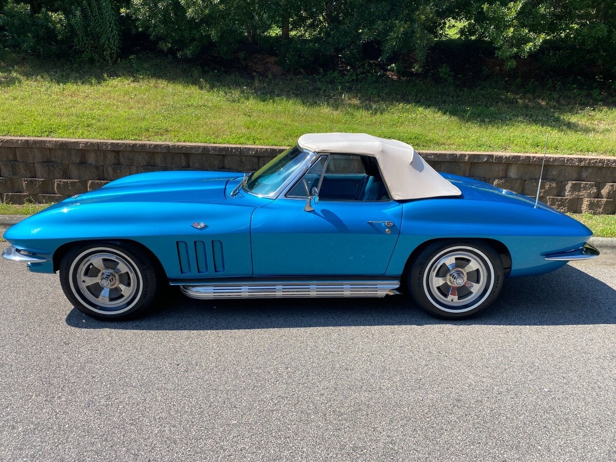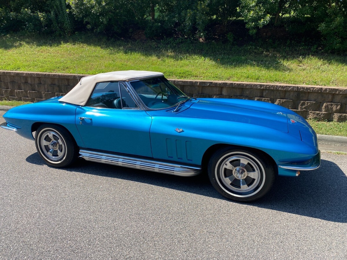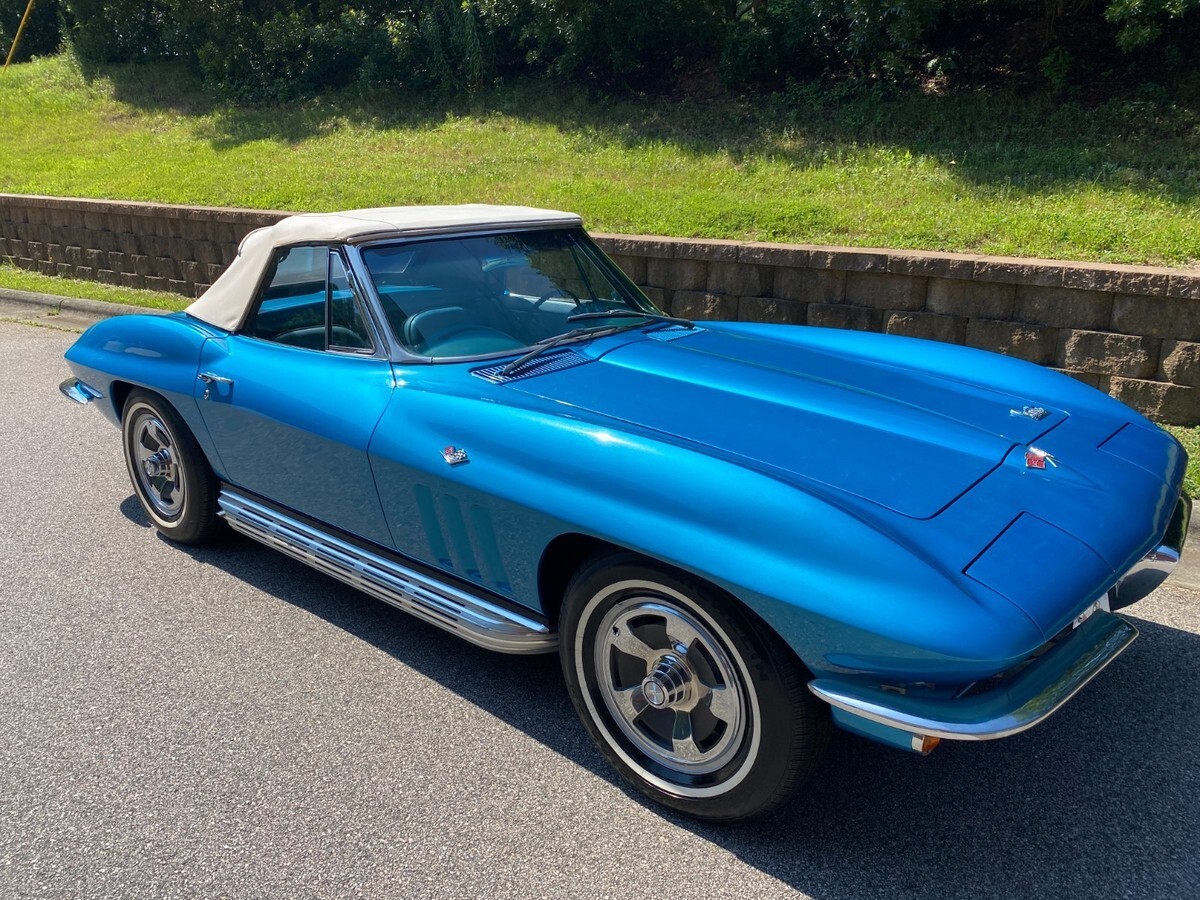 1966 corvette convertible rare Nassau blue, paint code 976 with complete Al Knoch bright blue interior. new switches and relays. matching # 350hp/327 with Muncie close ratio 4 speed transmission. new exhaust, power 4 wheel disk brakes, new alignment, power steering ...ground up restoration just completed. comes with 3, yes 3 tops. matching hardtop, raw hardtop (owner was going to have it covered in vinyl). and new Al Knoch canvas top with all new frame and hardware. engine has 0 miles since complete rebuild probably pushing around 385hp now with every accessory being replaced with new, Muncie close ration 4 speed trans was also rebuilt. brand new headlight motors (both) thousands of Dollars have been spent on restoration. Car was restored to fix all the drivability issues that Chevy had with these cars and car can be driven at length without any issues even on hot days.. new heavy duty aluminum Radiator with electric fan, bigger hoses etc original shroud goes with car also,,, Billet heavy duty master cylinder with all new brake lines, calipers and rotors, new u joints, new battery with HD alternator, entire steering has been rebuilt with all flaming river components including a billet rack/n/pinion and power steering pump. brand new shocks, springs, rear end and ALL suspension components. new weather stripping, all gauges rebuild, etc... etc... etc... NO TRADES OF ANY KIND!! PAYMENT BY CASH OR BANK WIRE ONLY!!! inspections are more than welcome PRIOR to bidding. car is located in Raleigh North Carolina. clean and clear title in hand, ready to transfer. please contact me at 919-944-6832 with questions