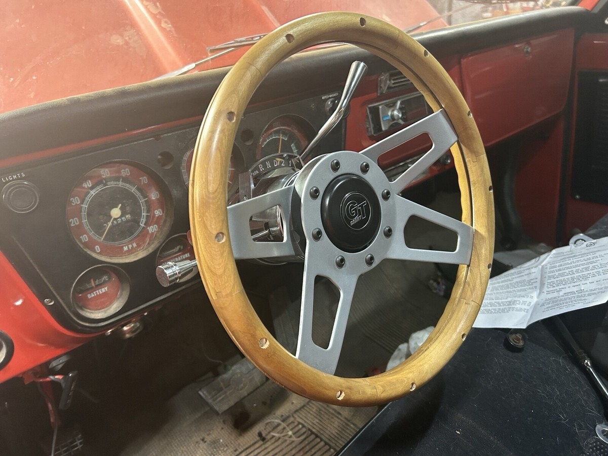 Truck has a new close ratio steering box, shaft, chrome, tilt wheel column, and a walnut Grant GT steering wheel.