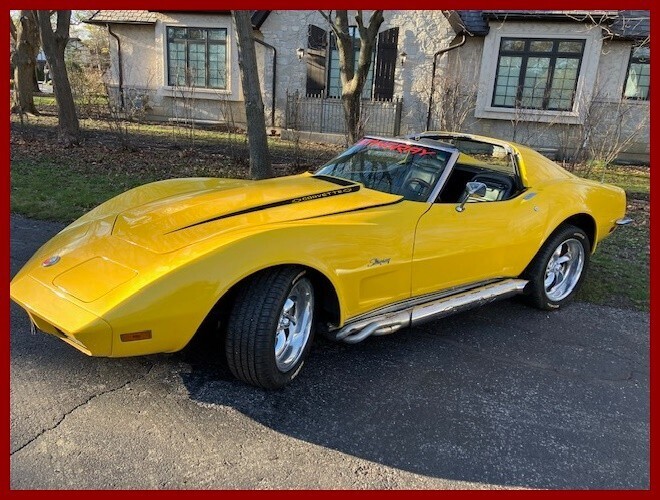 California Car Rust Free Frame – Fresh 350 rebuilt motor with 0/zero miles on motor with an “extra high” nickel content block. ENGINE WARRANTIED FOR FIVE (5) YEARS. Instrument panel shows 21,221 miles. Own a piece of history with this 1973 CUSTOM CORVETTE STINGRAY COUPE. Two (2) tops with covers. One-piece smoke clear plexiglass sunroof with cover on wheel stand. Brawler 650 carburetor with mechanical secondaries converted to manual choke. Edelbrock performance intake manifold. Heavy cam. Street drivable. Hooker headers wrapped to hold the heat. Side pipes with stainless steel covers so you don't burn your legs. New Tremec 5-speed transmission. Hurst shifter. Factory air conditioning. 373 positraction differential rear end. Aluminum mags. Tilt and telescopic steering column. Power steering. Power brakes. Electric windows. Heavy duty battery. AM-FM radio. Black leather seats in excellent condition. Canary yellow outside, black leather interior. Beautiful! One of a kind. Just like frame-off restoration. Over $65K in receipts for parts and labor that went into this car after the car was purchased and will go with the car. Garage Queen. $22,500. Will ship anywhere in the world.
