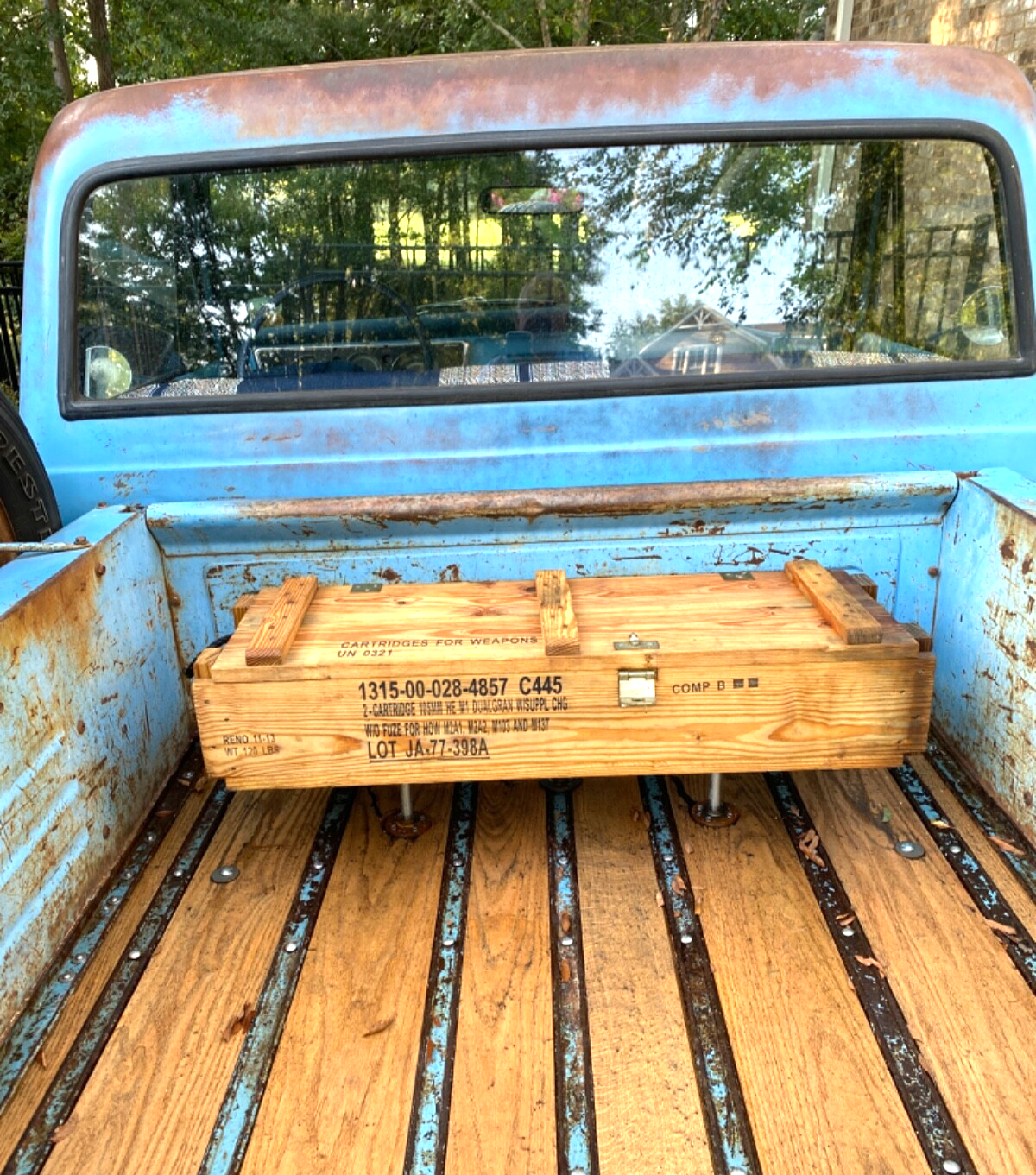1.Oak hardwood bed using original hold downs with all new stainless hardware, allowed to age to match patina