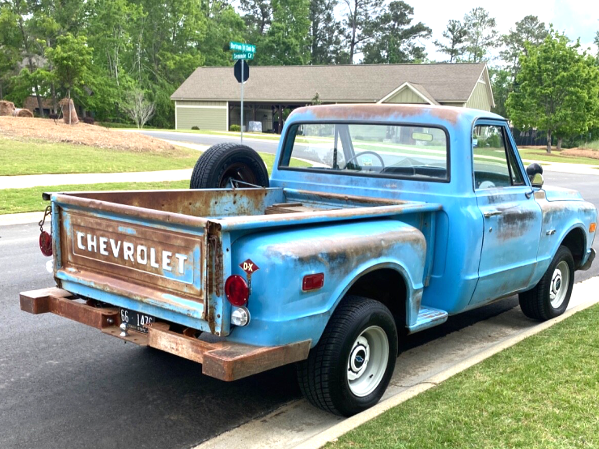 1969 Chevrolet Short Bed Step-side Pickup Truck. Original Six Cylinder 250, 3 speed on the column. Texas truck that is very solid with all original panels. Off road since 97, dry stored. Original light blue paint with incredible original weathered Texas patina being maintained. No fake patina, linseed oil or other foolishness. Very cool - it is all genuine with great eyeball.Original radio delete plate & ashtray.Rebuilt most everything from front to back with new parts including oak bed. Smooth running inline engine with no noises or smoke or known issues with strong even compression. Original 3:73 12 bolt rear end. Excellent running and fun driving. Draws attention everywhere It goes. Drive anywhere with confidence. This is a great running, starts every time, good old truck.