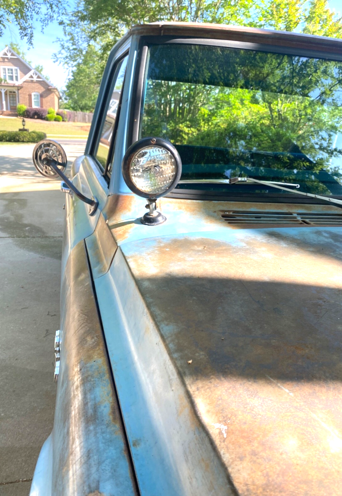 22.Has period, bright, working “hog shooting” light mounted on cowl. Pull switch operated.