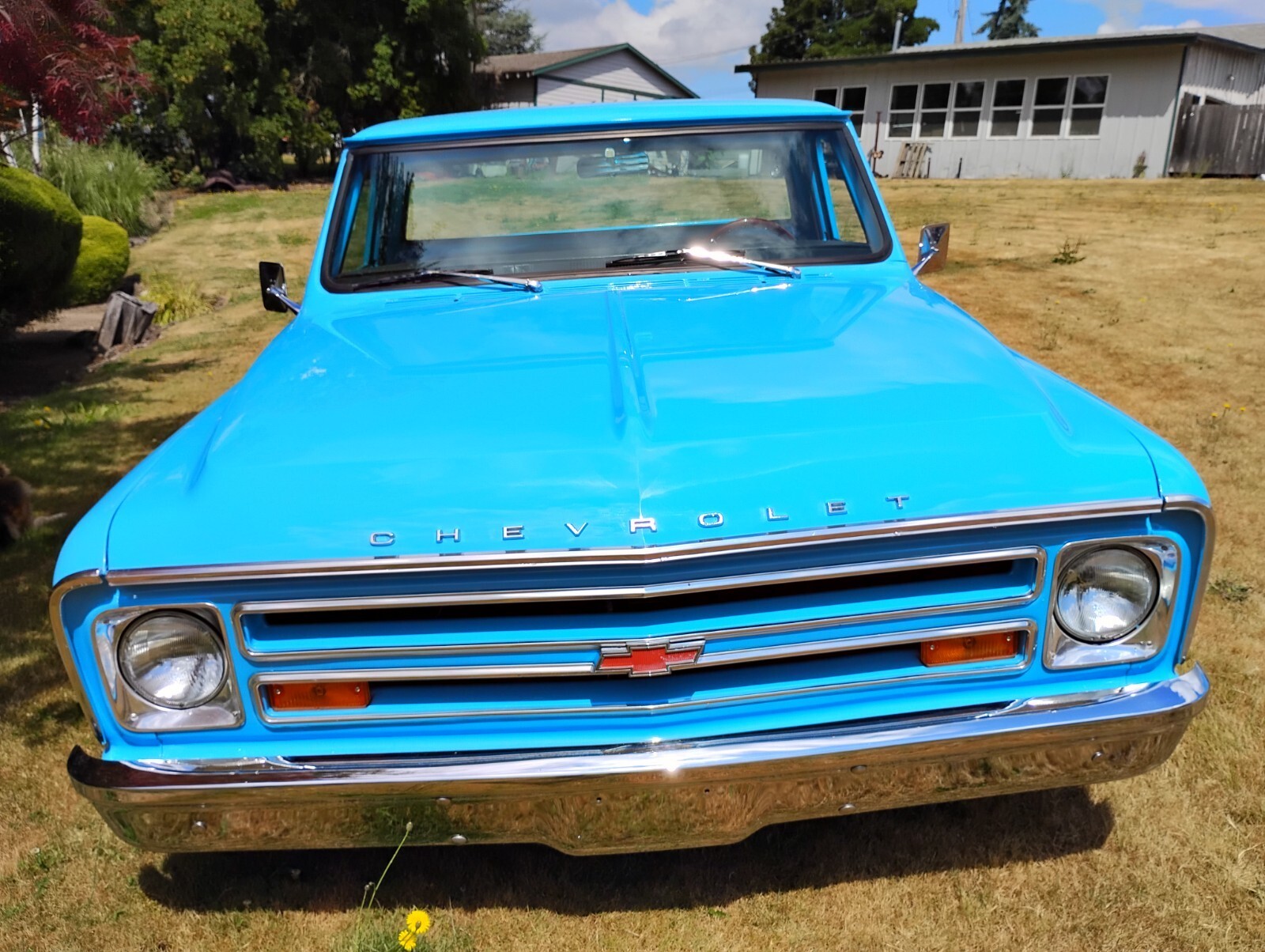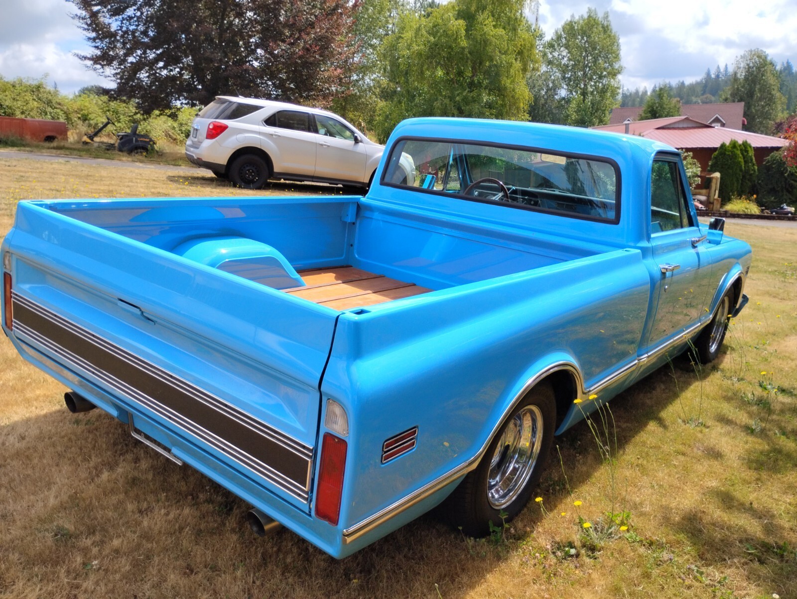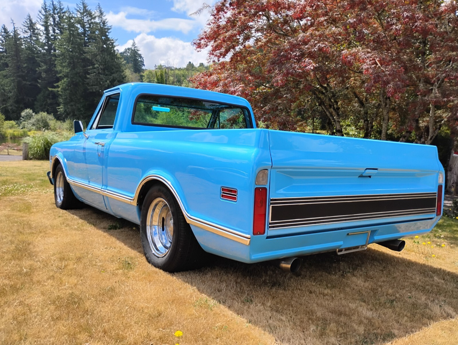 Fully restored custom 1968 Chevrolet Short-Wide Pickup. Rebuilt original 327, rebuilt Turbo 400, new vintage A/C. Subtly chopped 2.2 inches. Beautiful wood bed. Gorgeous fresh blue finish. Late model seats, new glass, wheels, staggered tires, bed sides, moldings, front bumper. Dual Flowmaster exhaust sounds rumbly.Outstanding, tastefully customized example of one the 60's most sought after pickup trucks.
