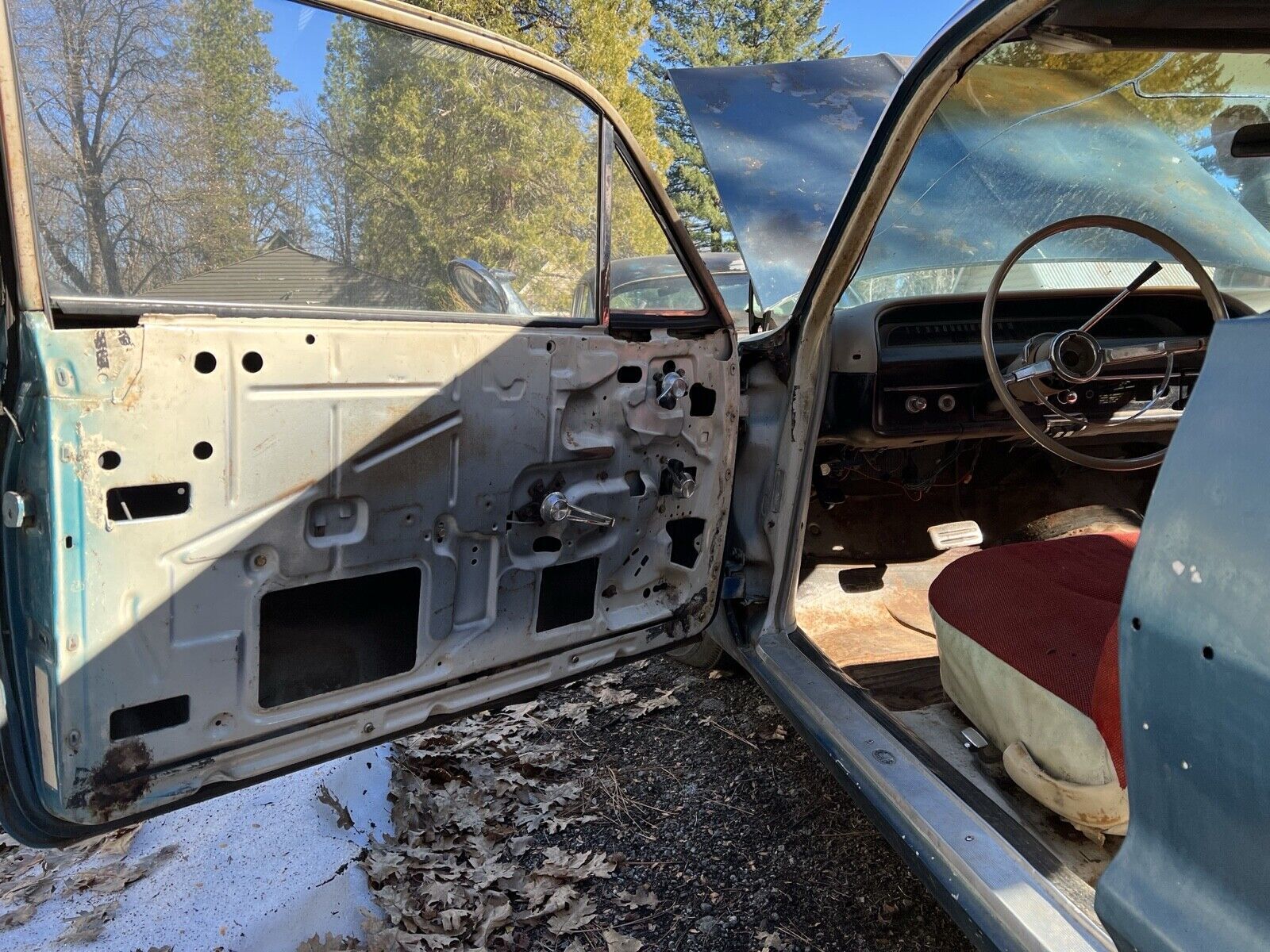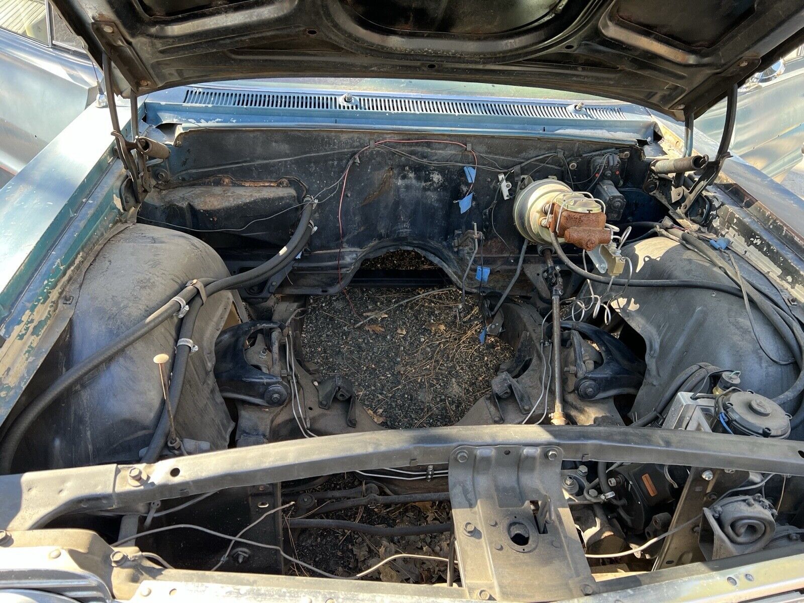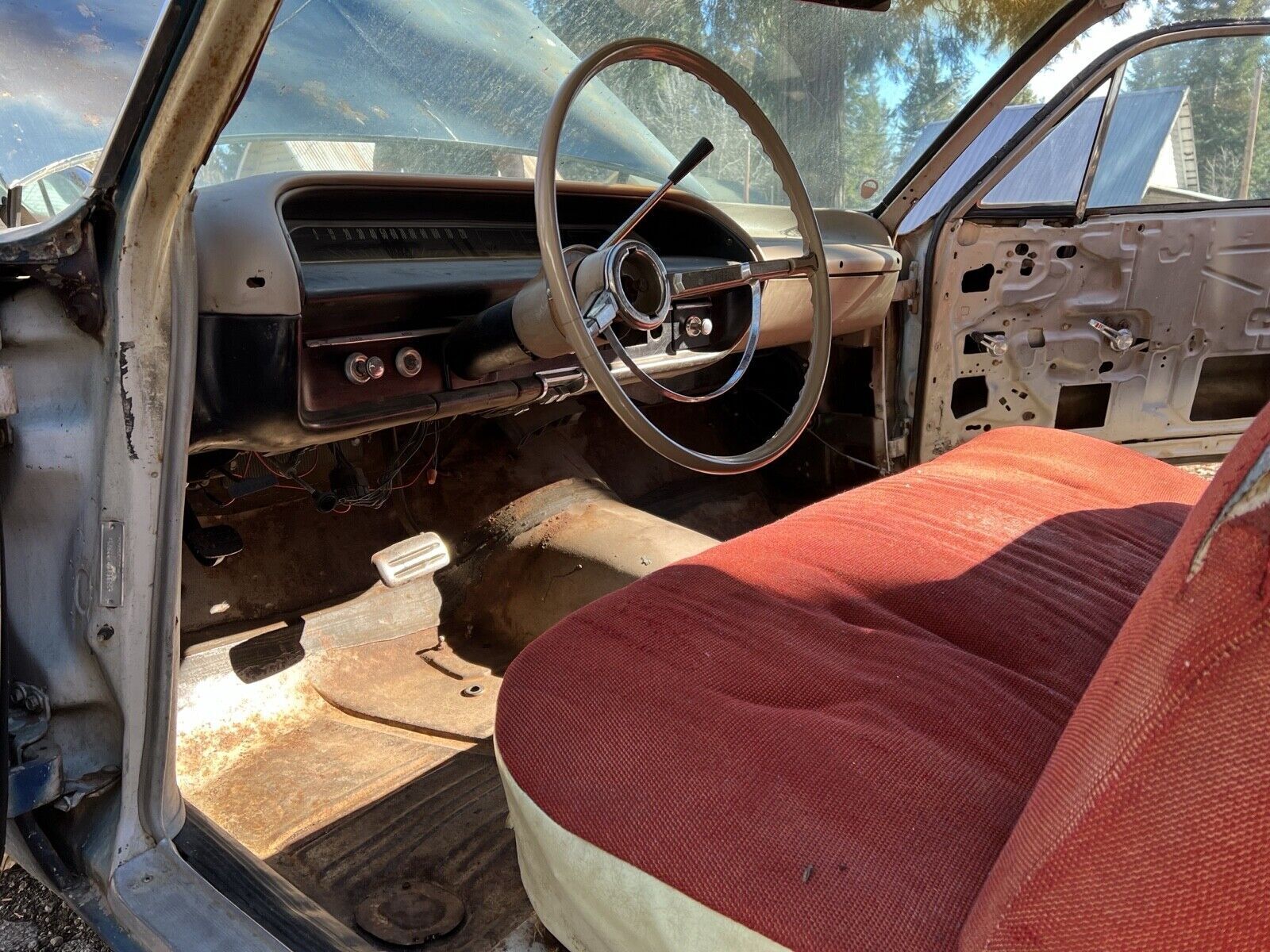 1964 Bel-Air coupe project. This 64 bel-air has a complete rebuilt front suspension with 2-inch drop spindles, 2-inch lowering springs, real power steering (not slave cylinder) power brakes and front discs. The car might have 100 miles on the new equipment. Rear suspension has all been gone through with 4-inch lowering springs and rebuilt trailing arms with disc brakes. There is NO ENGINE OR TRANSMISSION IN THE CAR, although I do have them and they are included. DOES NOT RUN. The car is super solid with no rust. Left front fender is not original to the car. Perfect project for patina’d hot rod or resto-mod car. I do have the inside trim pieces, garnish moldings, backseat and door panels.