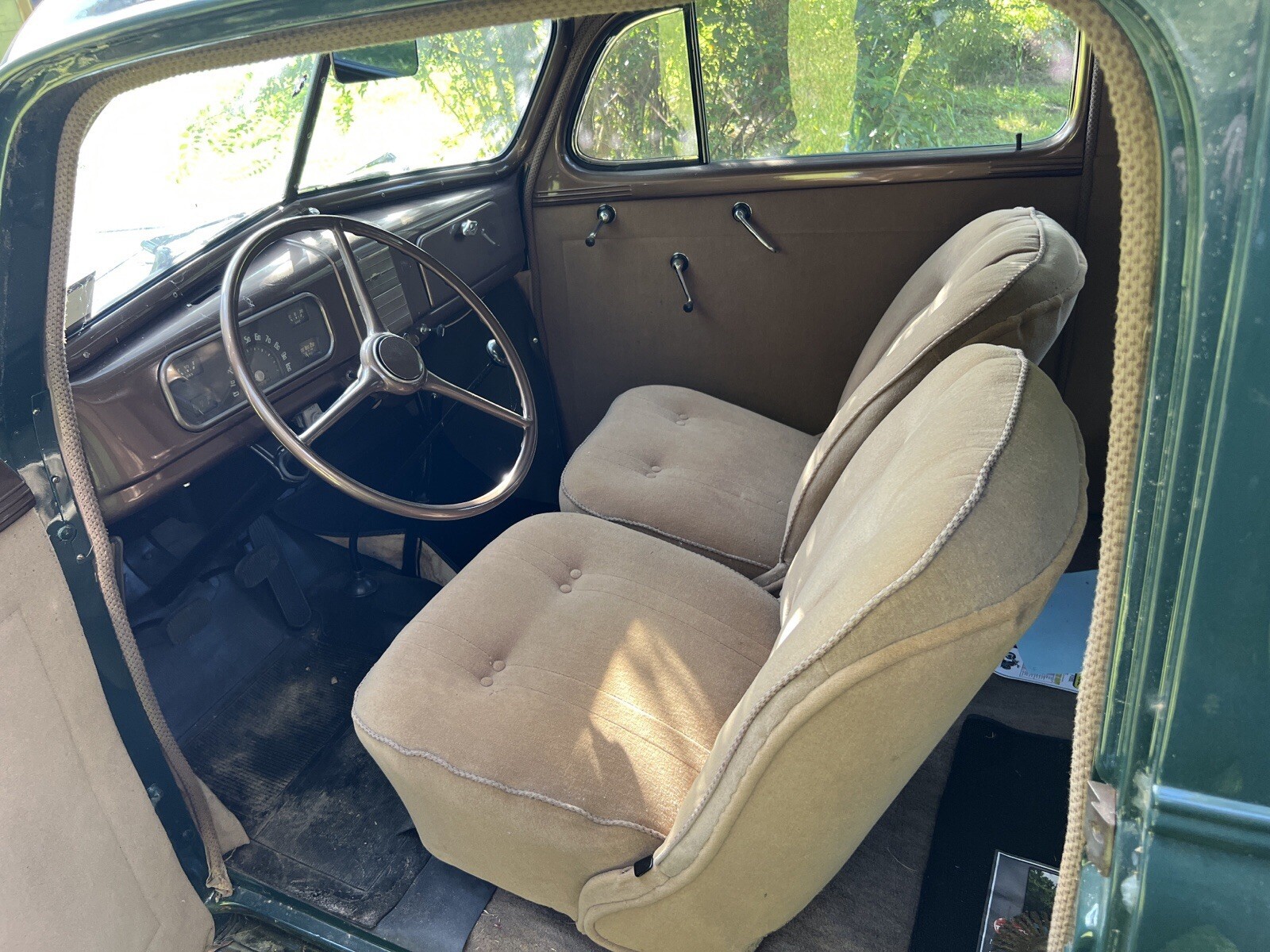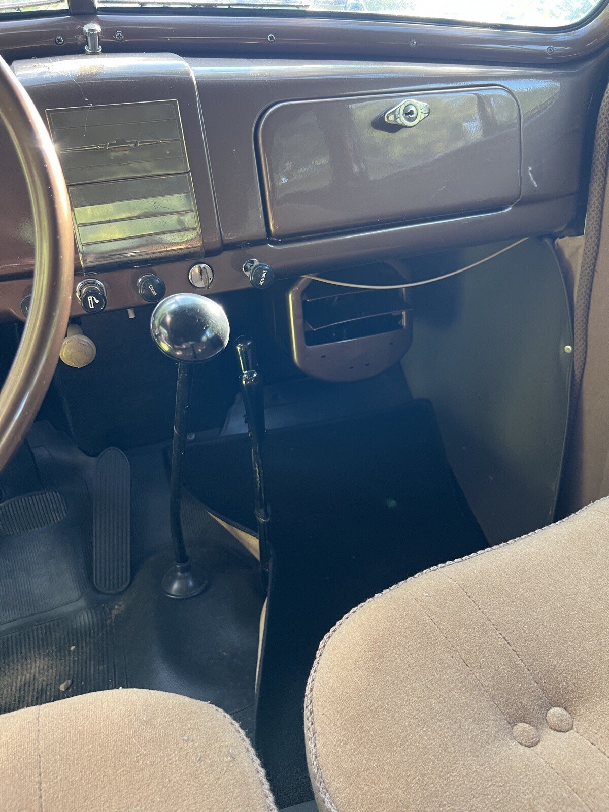 This Sedan has a 216- 6 cylinder motor. It has a 3 speed straight shift transmission that is on the floor. It is a body of full restoration.